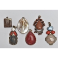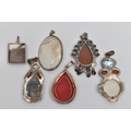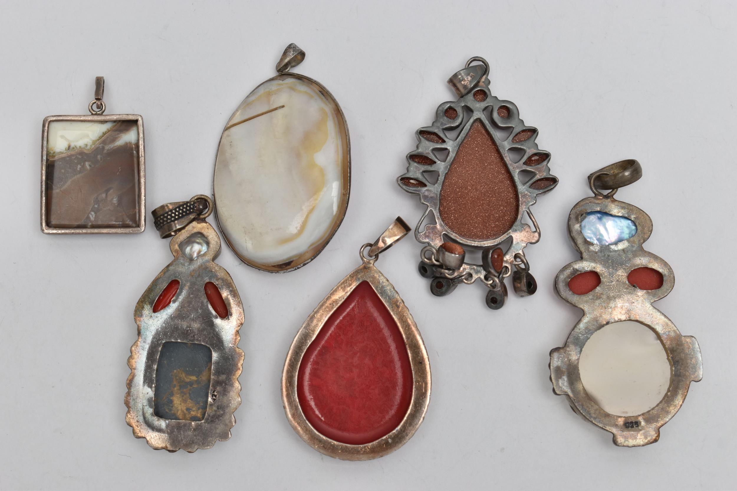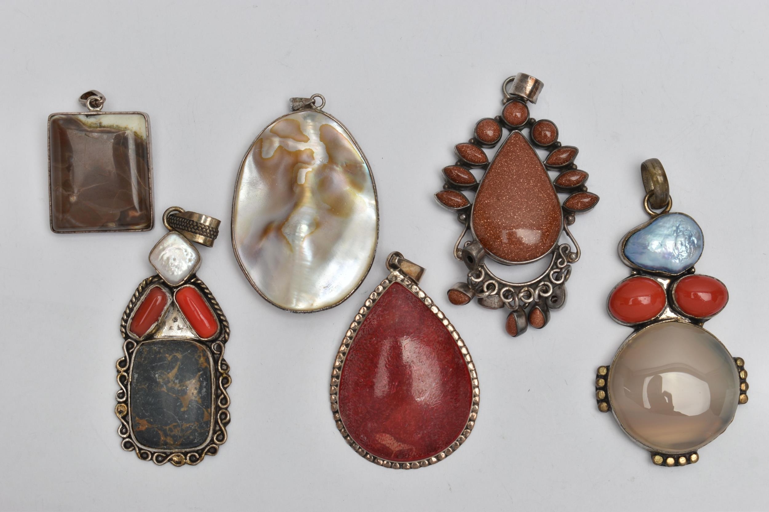 SIX STATEMENT PENDANTS, a selection of white metal pendants set with goldstone, agate, hardstone and pearl, some stamped 925, approximate gross weight 95.0 grams (condition report: general moderate wear, overall condition good)