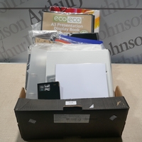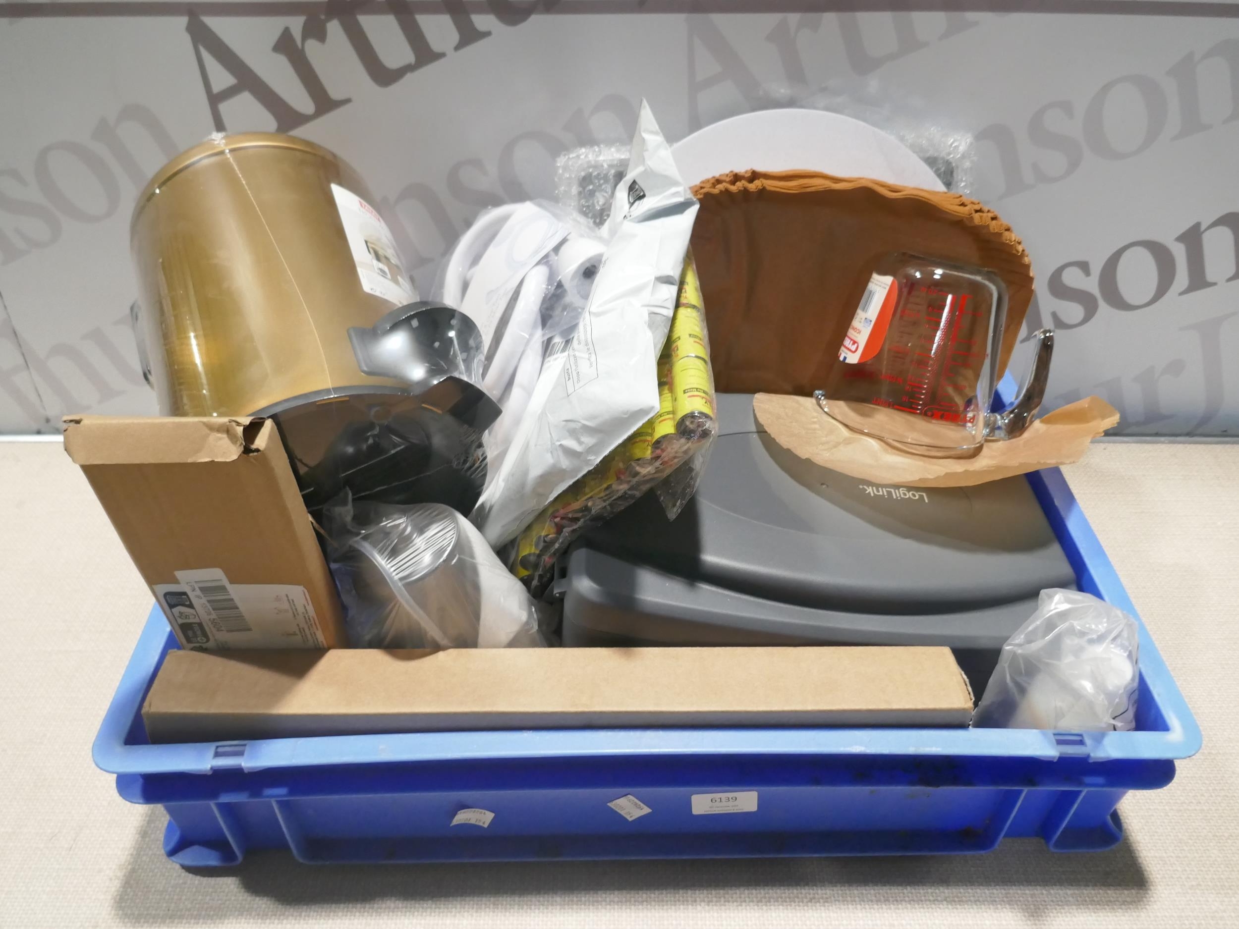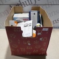 A box of miscellaneous items to include Logilink weather box, TacWise staple gun, bathroom bin, a doorbell, etc. * This lot is subject to VAT