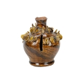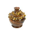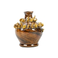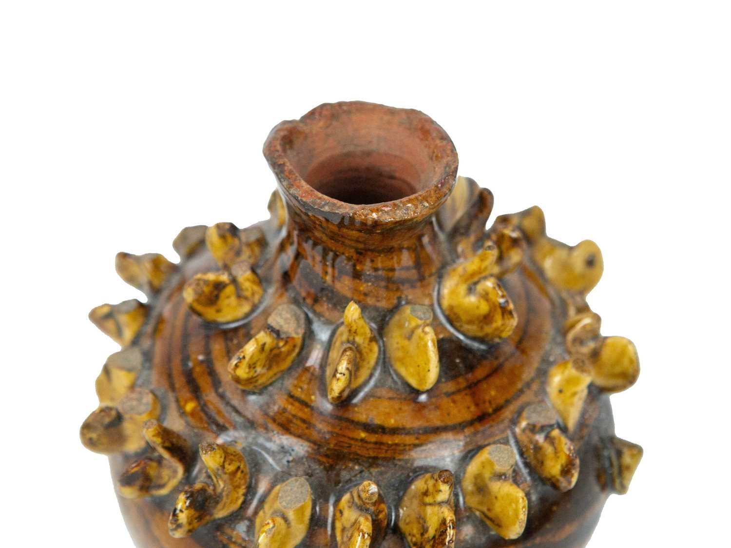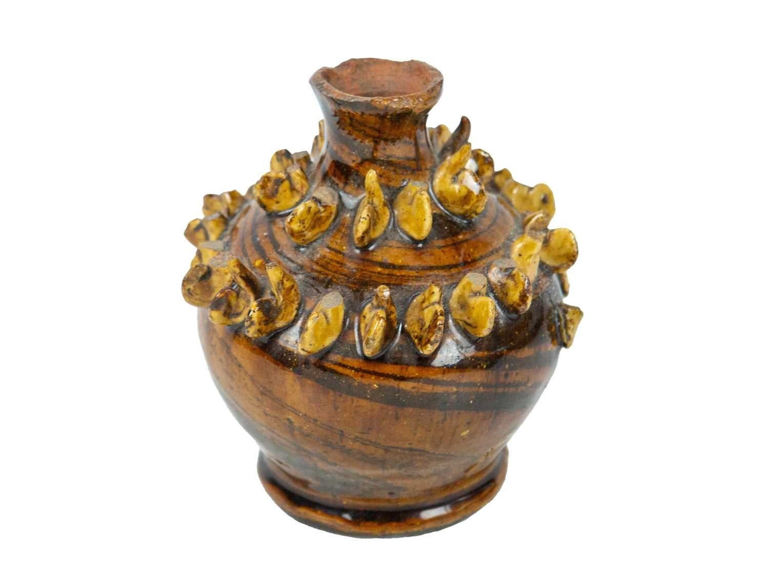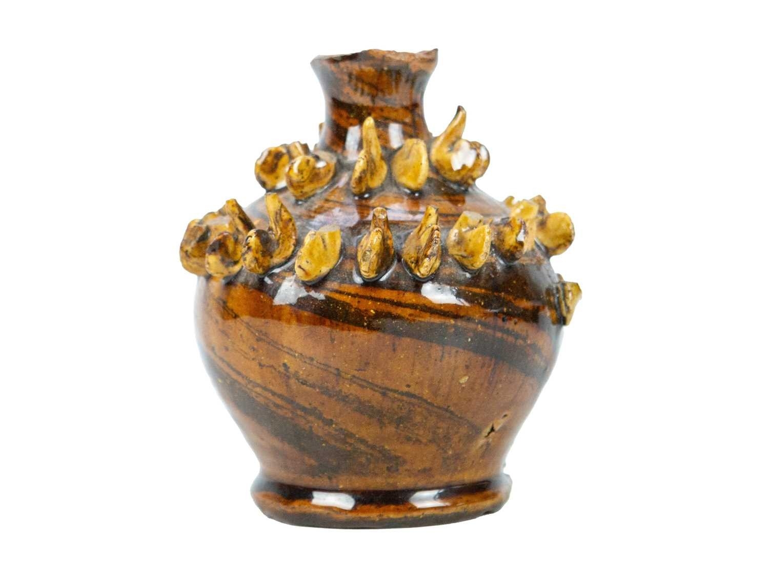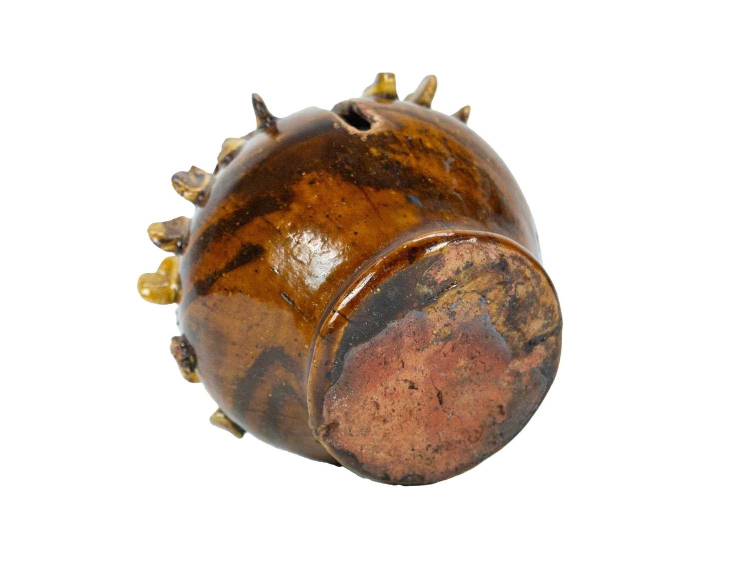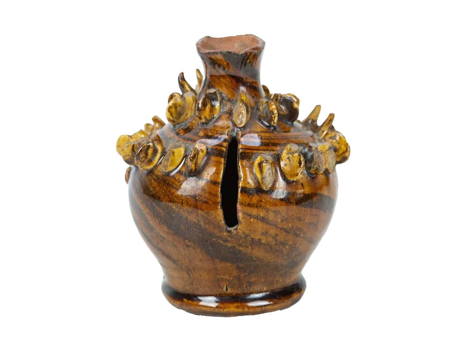 A treacle glazed agateware money box. Possibly Yorkshire, 19th century, of baluster shape, applied with numerous birds, height 12cm. The collection of the late potter Peter Smith of Bojewyan Pottery in West Cornwall. Fellow of the Craftsman Potters Association, member of Newlyn Society of Artists and later chairman of Newlyn Gallery. Peter was also an influential teacher of ceramics at Falmouth University, where he encouraged a spontaneous and improvised approach based on developing technique and an understanding of the medium of clay as an expressive and practical form. Peter originally started as a research chemist before turning to pottery after attending evening classes. He started his own pottery at Bojewyan in West Cornwall in 1974. As well as being a renowned and experimental potter and tutor, he was also a keen collector of medieval and later pottery from the UK and further afield. His Guardian obituary can be read here: https://www.theguardian.com/artanddesign/2025/aug/13/peter-smith-obituary