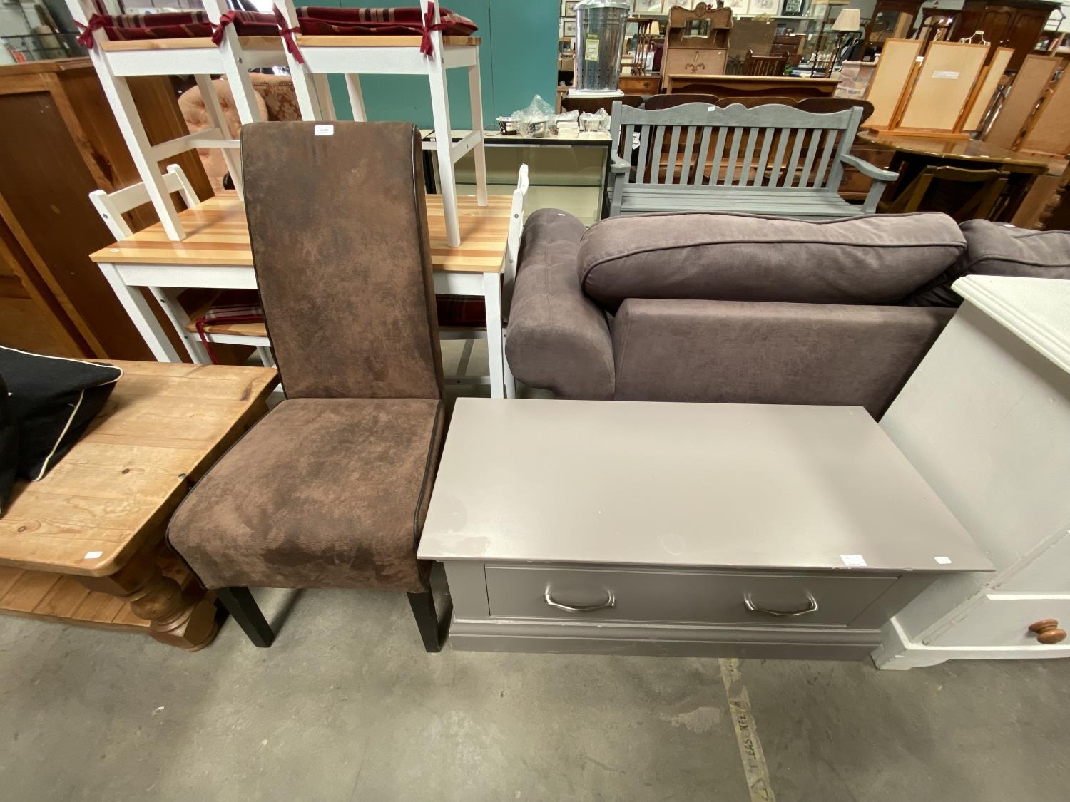 Brown suede side chair & grey painted single drawer Ottoman (46H 105W 46D cm)