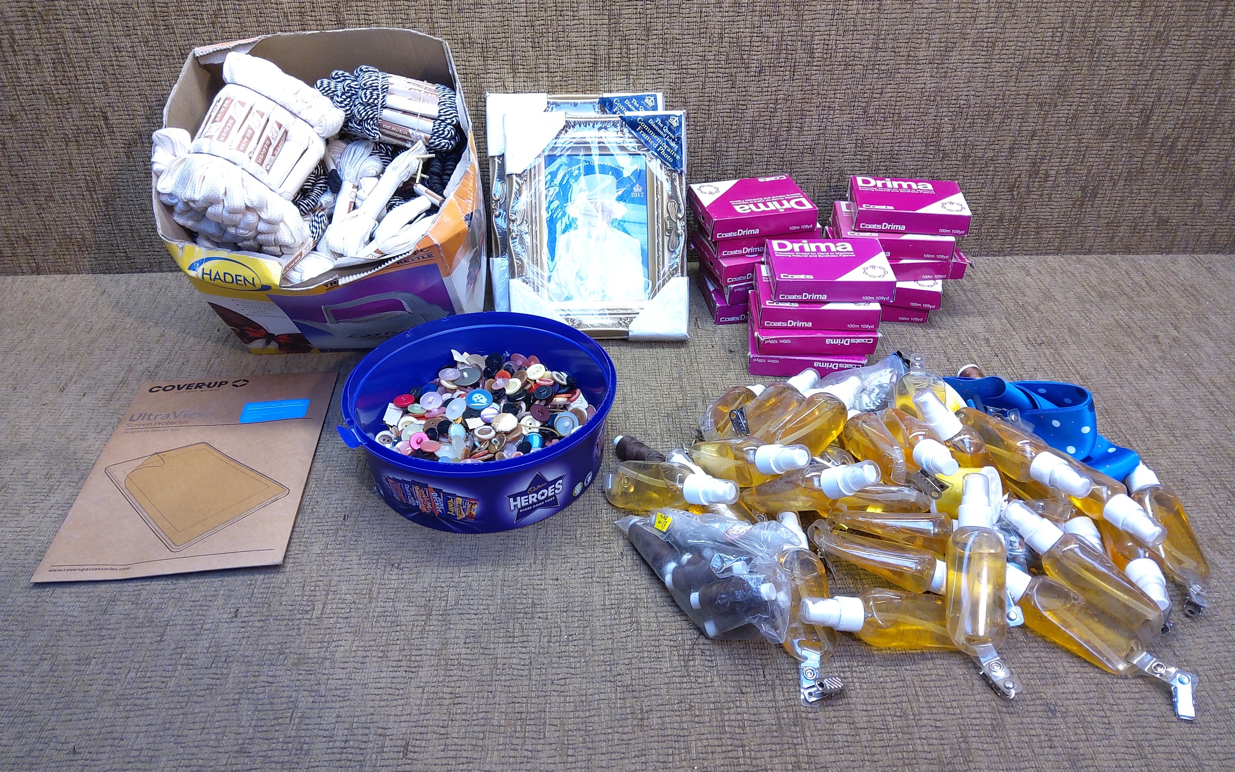 Haberdashery including shoe laces, sewing machine oils and boxes of Drima cottons.