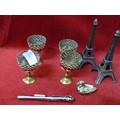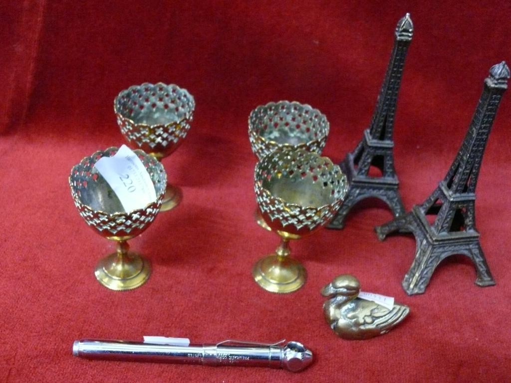 COLLECTION OF DECORATIVE METALWARE 4 MINIATURE BRASS GOBLETS, BRASS DUCK AND 2 EIFEL TOWERS