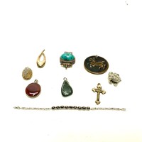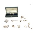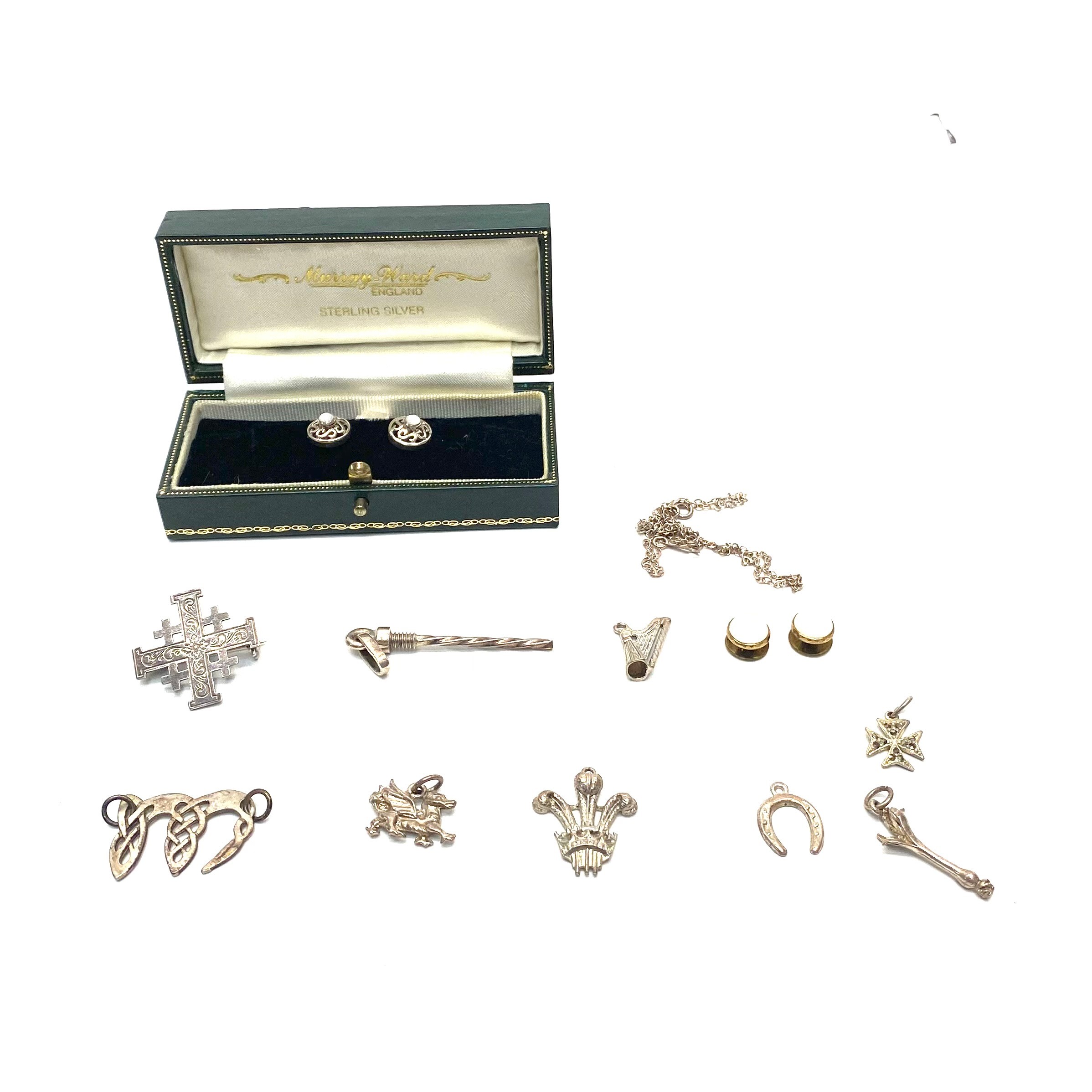 A collection of silver charms, along with a brooch, a necklace, and silver cufflinks.
