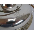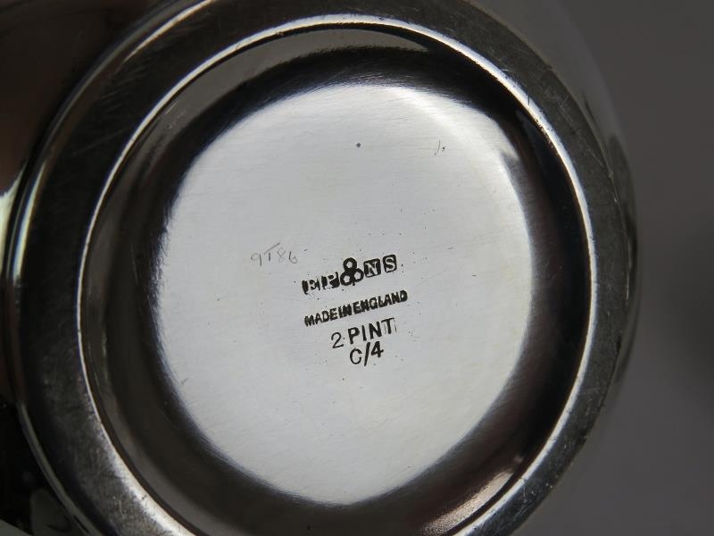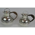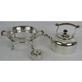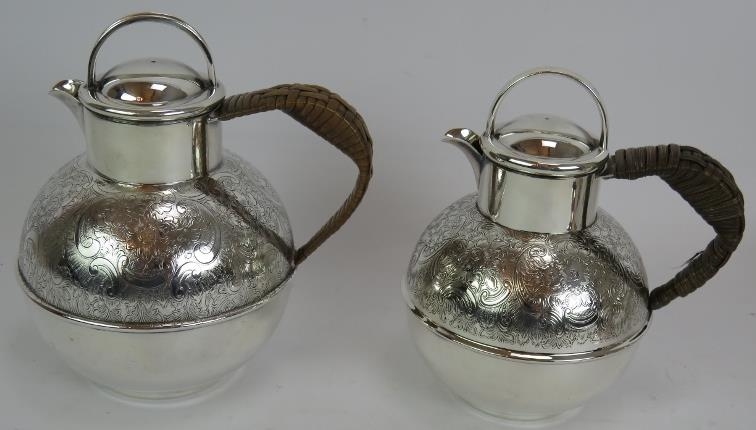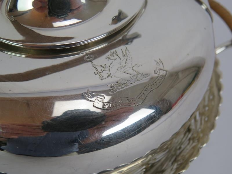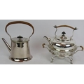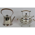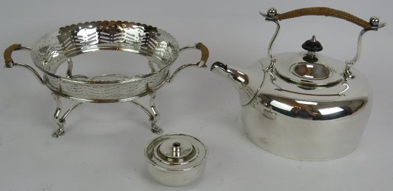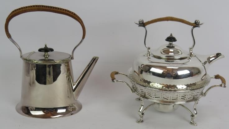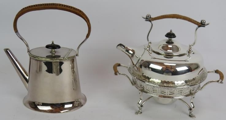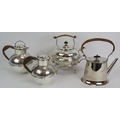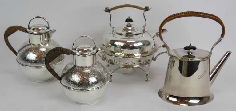 A silver plated spirit kettle and stand with rattan handle, a similar teapot and two plated Jersey cream pots with decorative shoulders and rattan handles. (4).