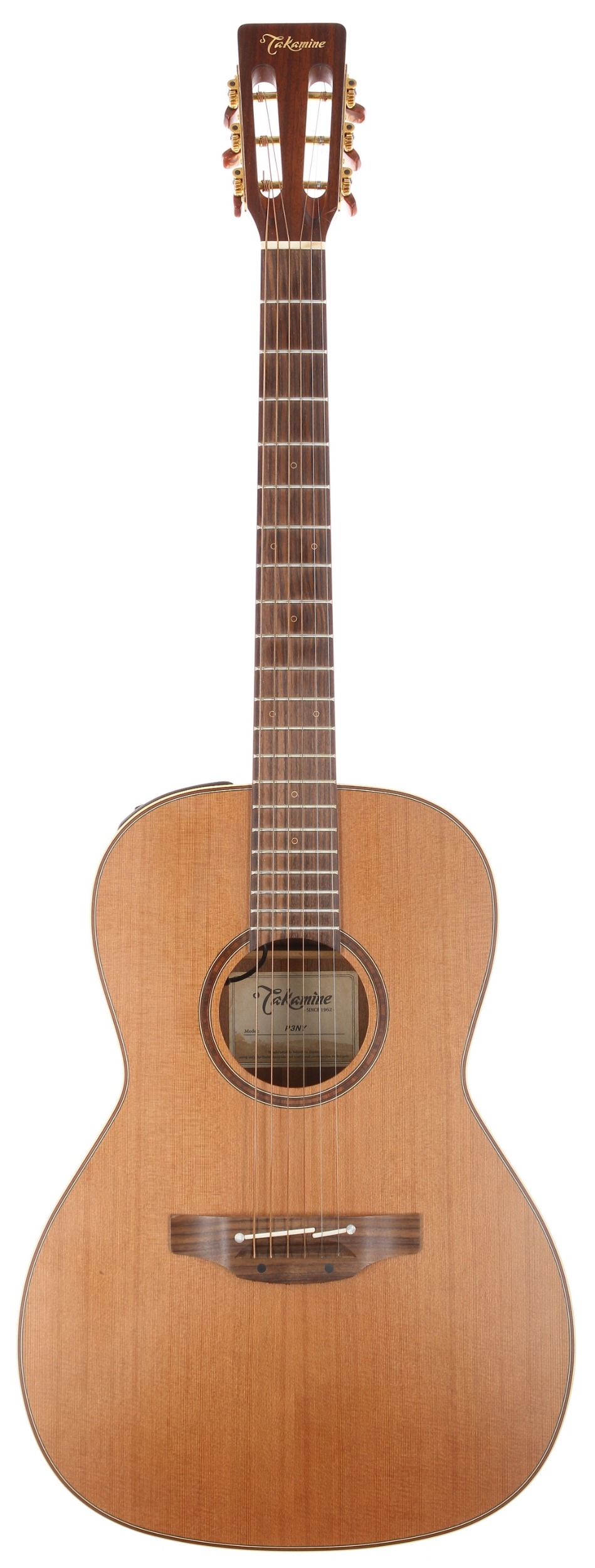 2019 Takamine P3NY electro-acoustic guitar, made in Japan; Back and sides: sapele; Top: cedar; Neck: mahogany, one ding to corner of head; Fretboard: rosewood; Frets: good; Electrics: working; Hardware: good; Case: original hard case; Overall condition: very good