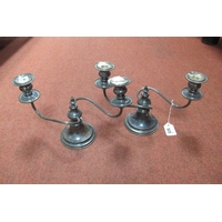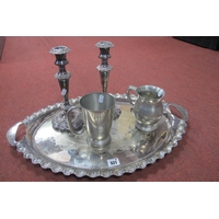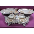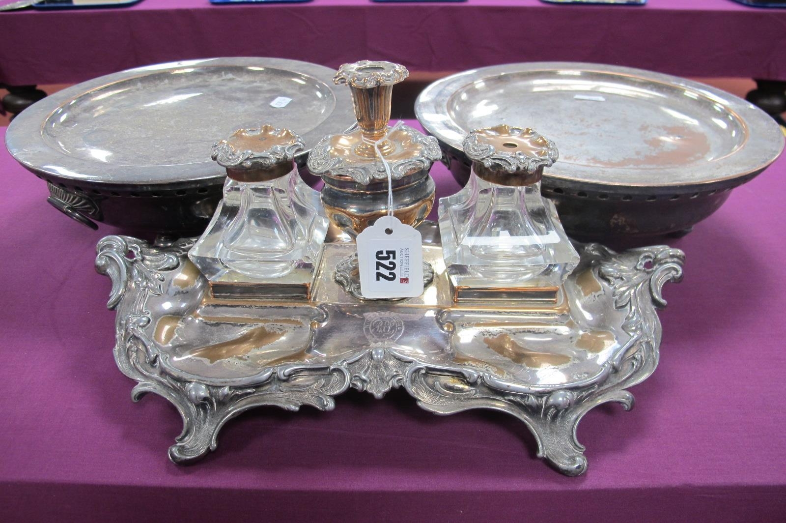 A Georgian Old Sheffield Plate Desk Stand, of leaf scroll design, initialled with motto, crossed keys makers mark, overall width 33.5cm (noticeable wear / damage; Together with A Pair of French Plated Plate Warmers, with twin handles, raised on ball feet. (3)