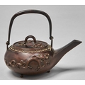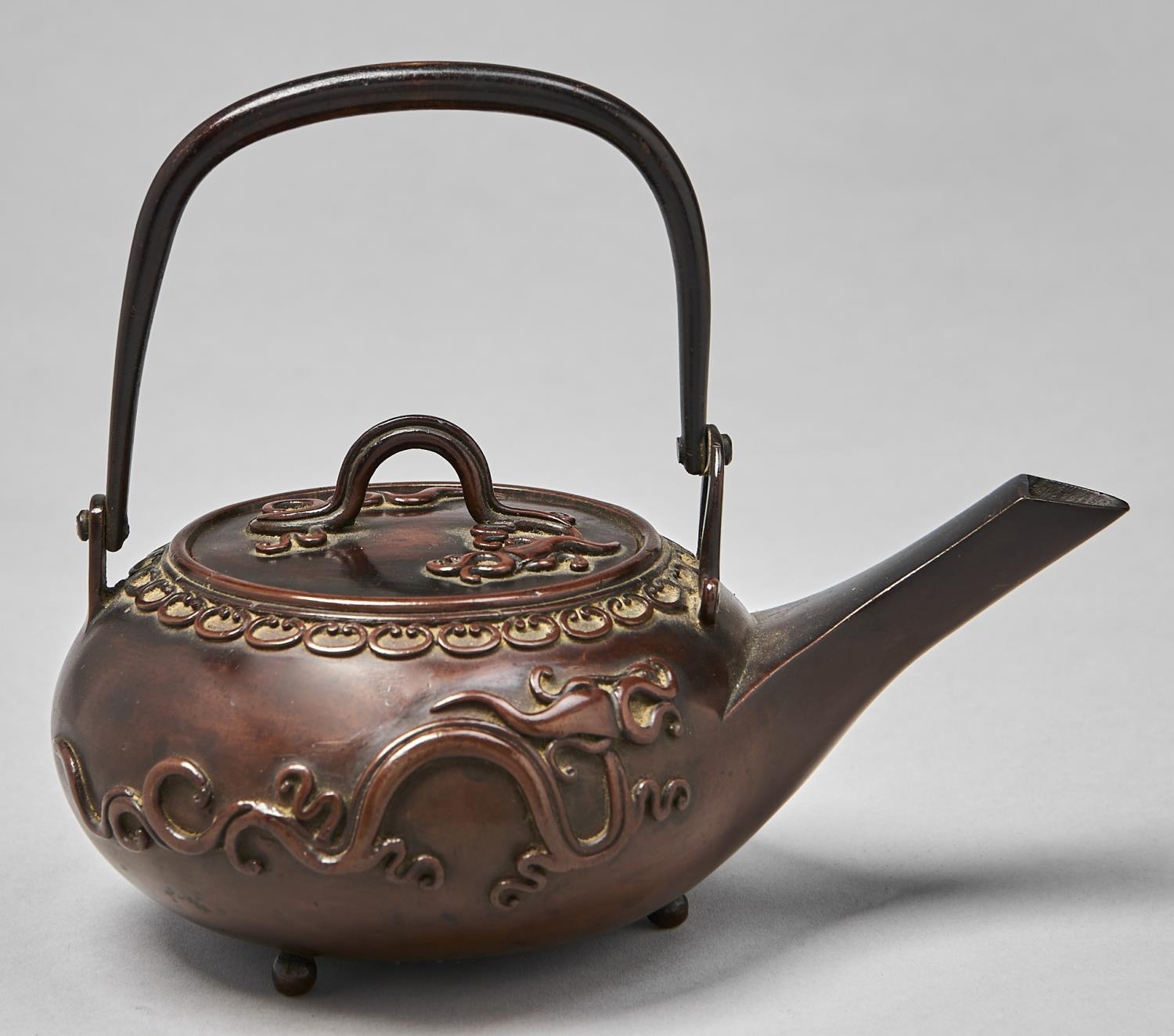 A Japanese bronze kettle and cover, Meiji period, of compressed form with straight spout, swing handle and three ball feet, applied to either side with highly stylised dragon, rich rubbed brown patina, 17cm h