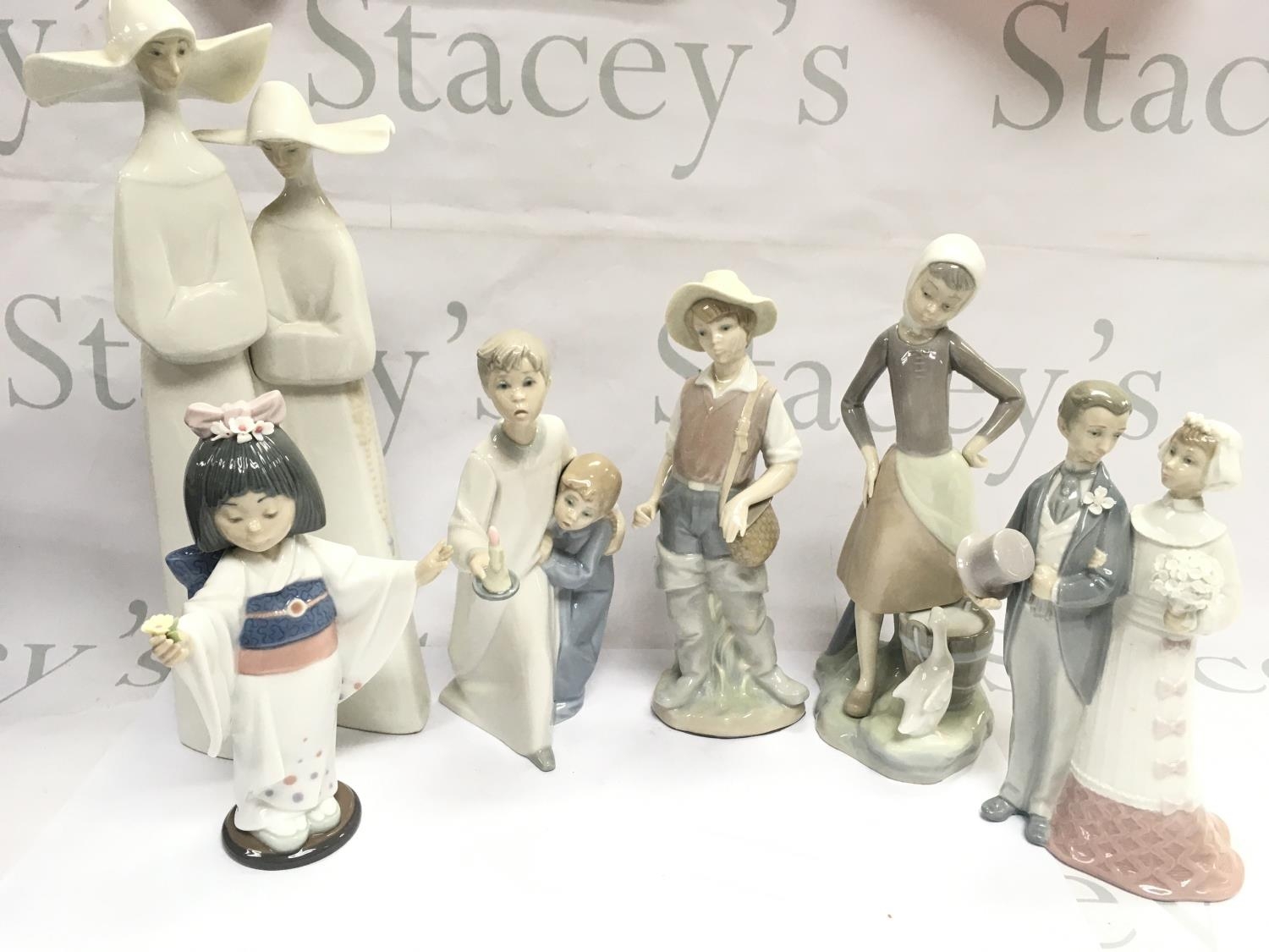 Lladro figures including Gone Fishing, Flower Glaze Japanese girl , Nuns, Bride and Groom etc. this lot cannot be posted