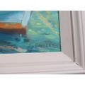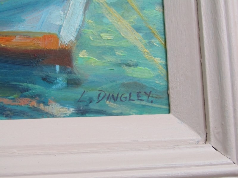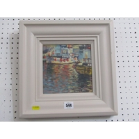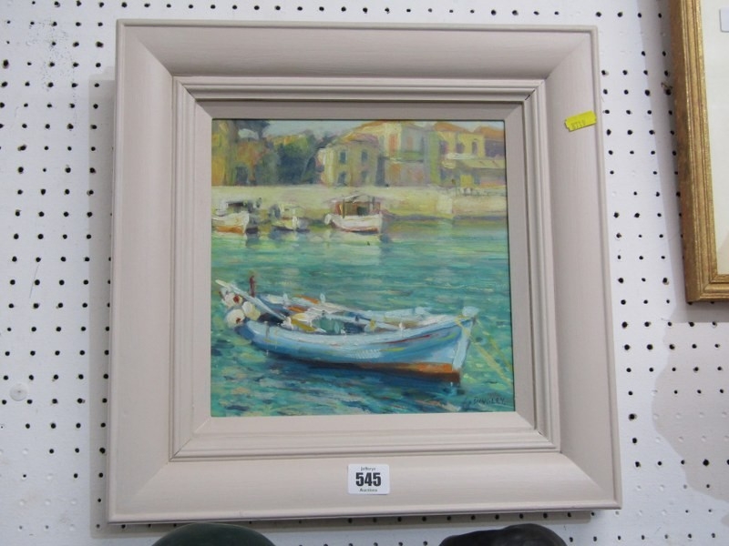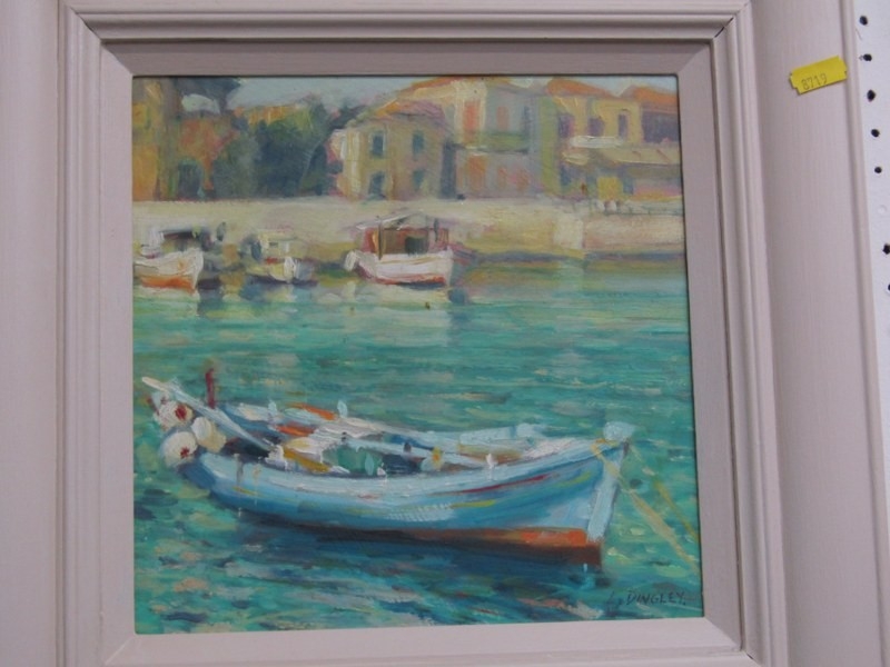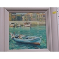 LAURENCE DINGLEY, oil on board "Fishing boats on a Mediterranean harbour", framed 38cm x 38cm