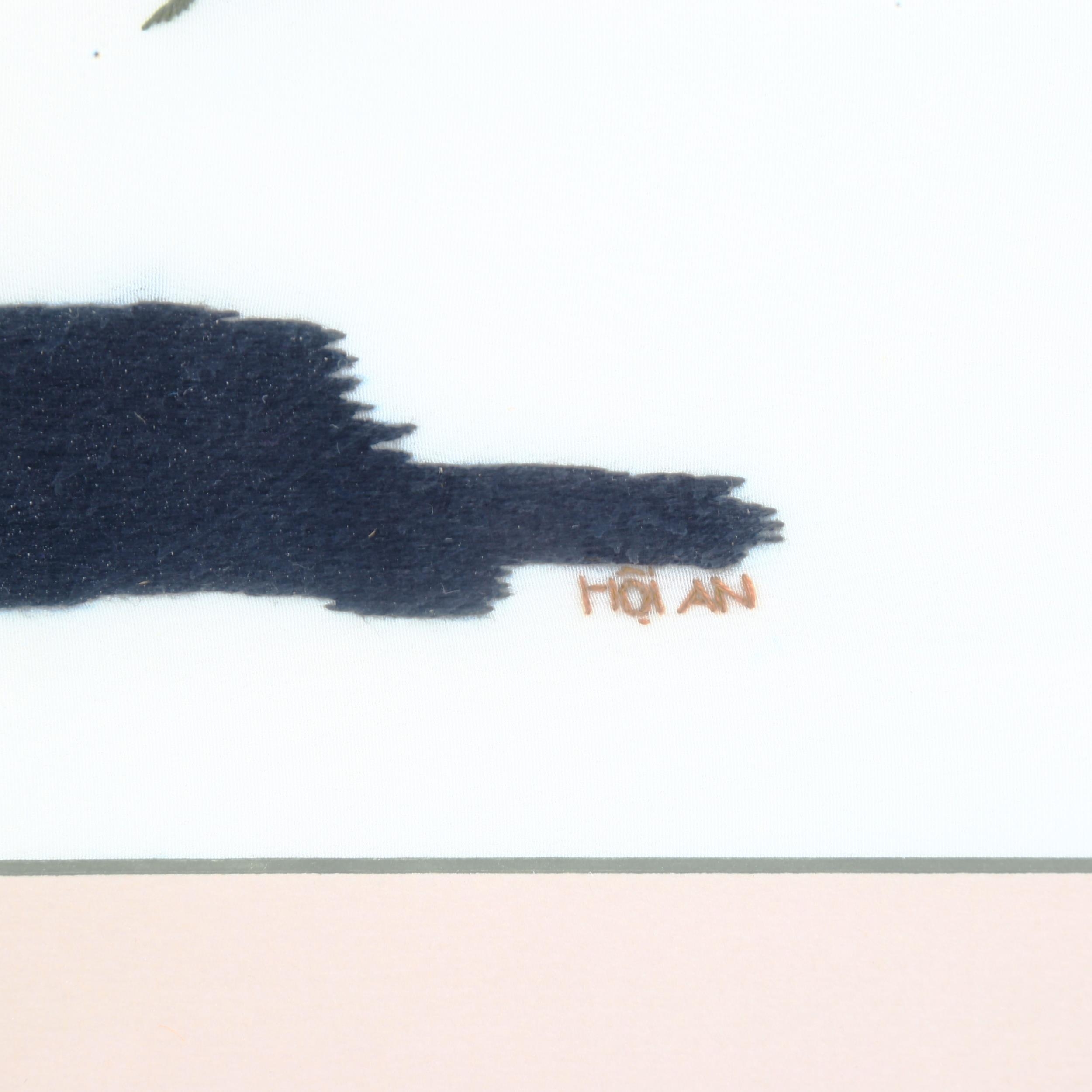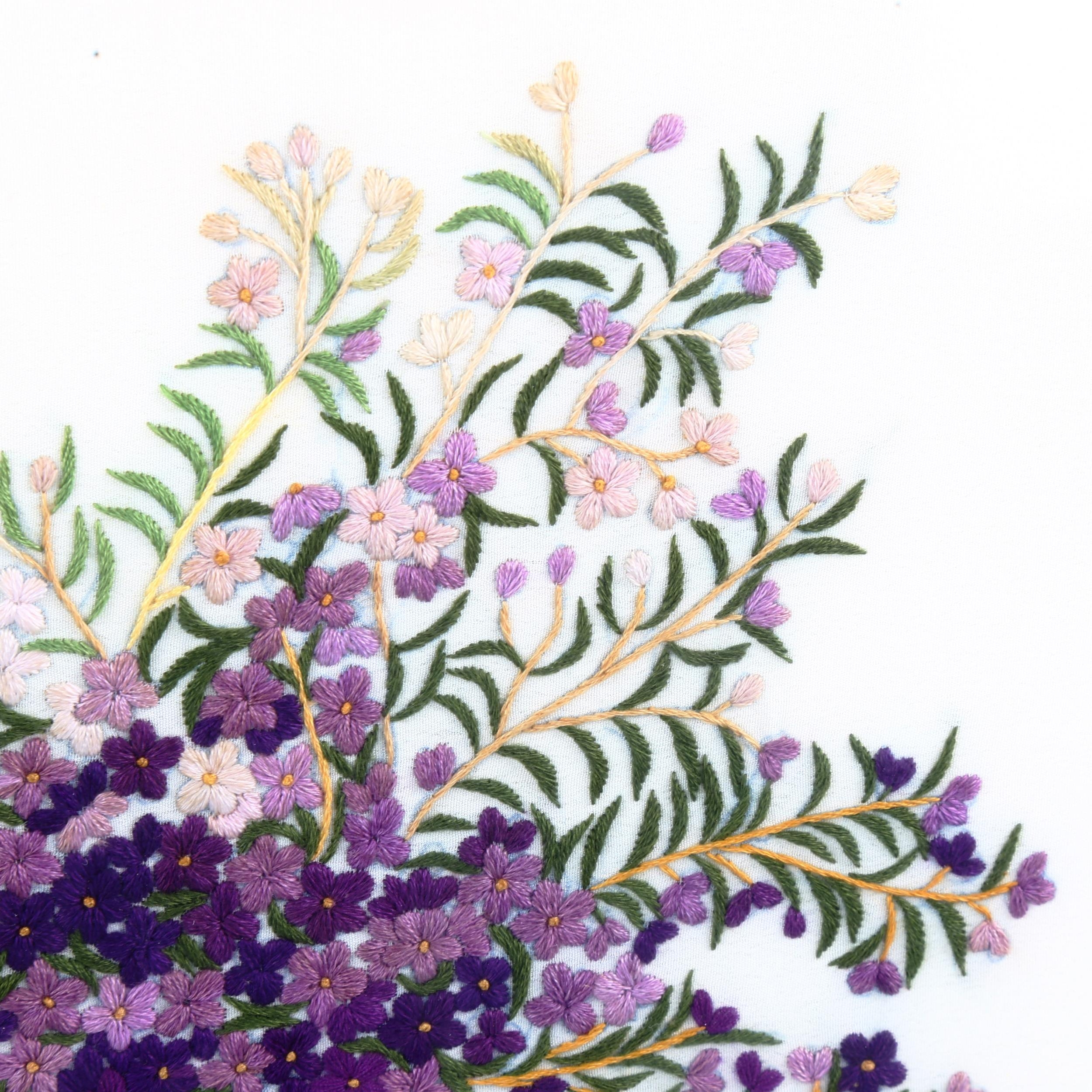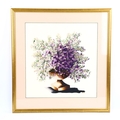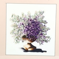 A silk embroidered picture, depicting lilac flowers in an urn, framed, overall frame dimensions 58cm x 55cm
