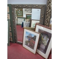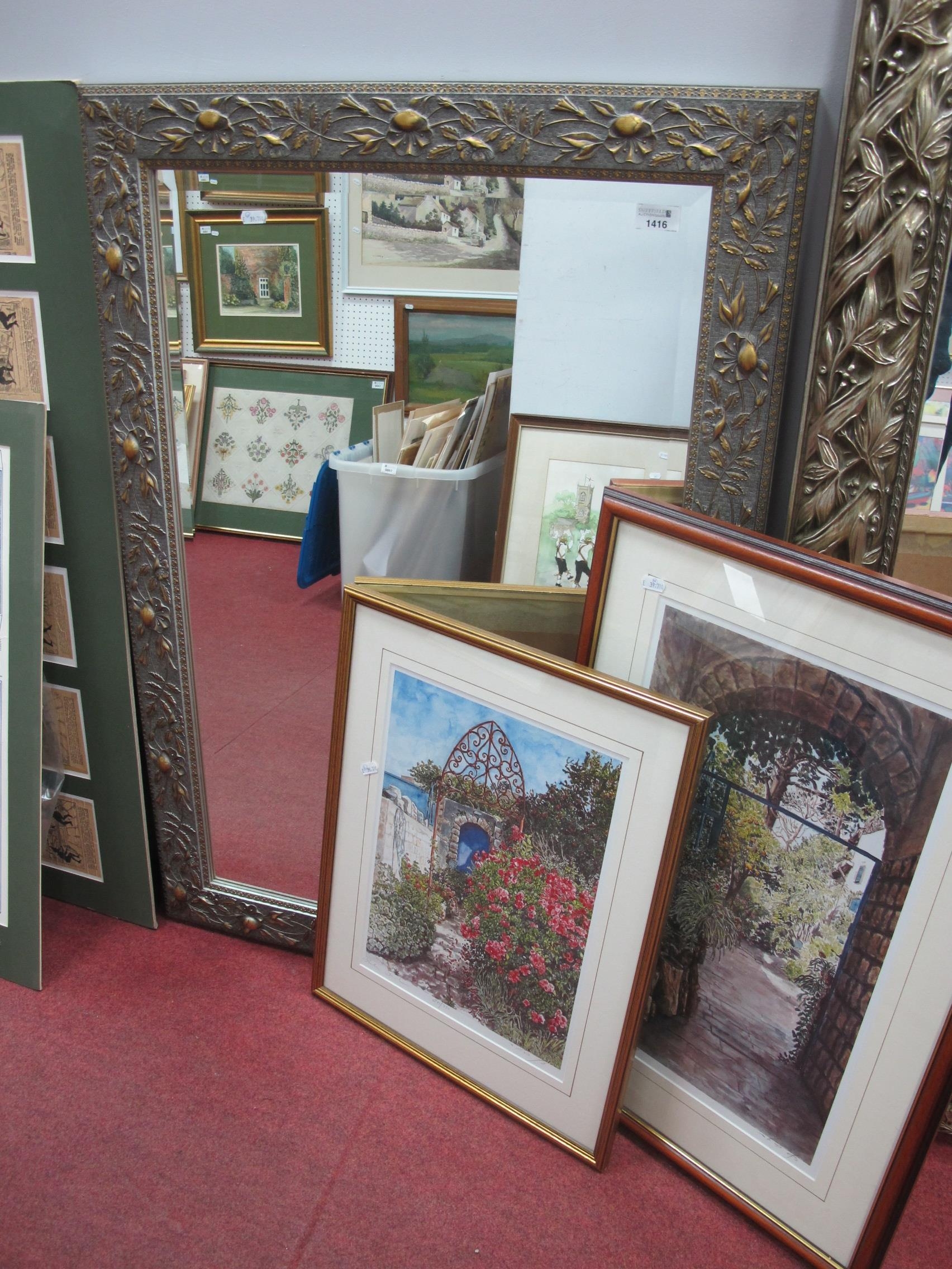 Bevelled Wall Mirror, circa late XX Century in silvered and gilt floral frame, 100 x 70cm, two Helen Bar-Lev signed prints (3)