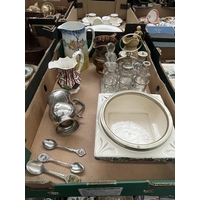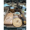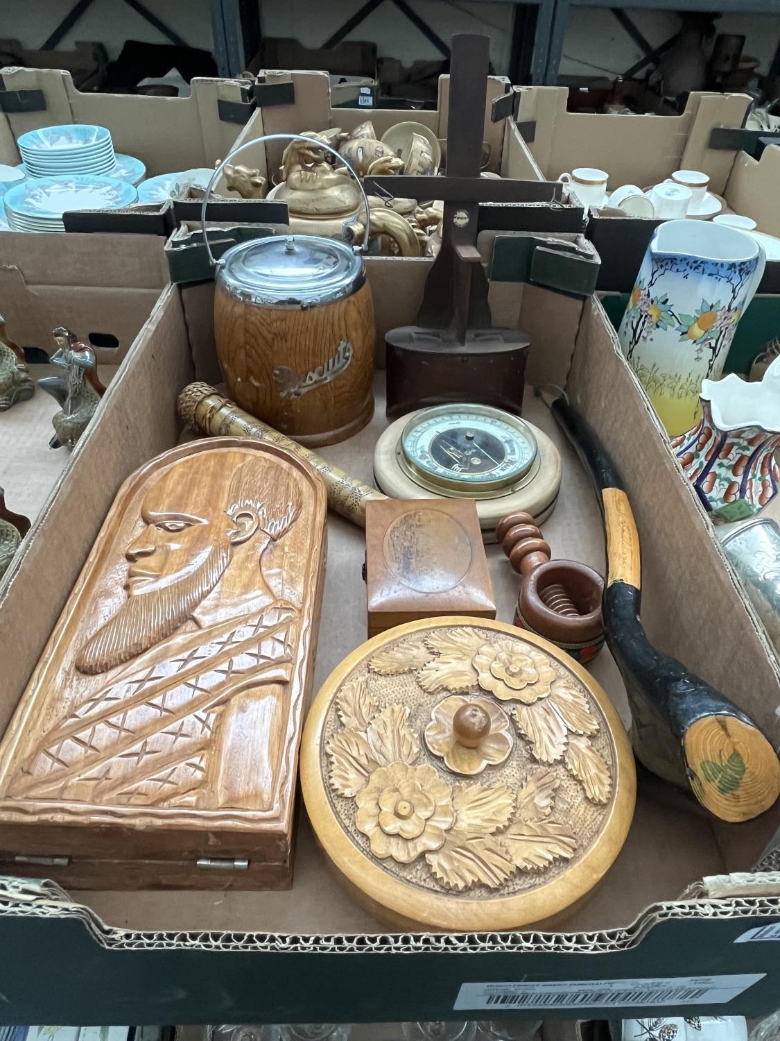 Box containing treen including a barometer, an Irish Shillelagh and a vintage stereoscope