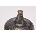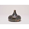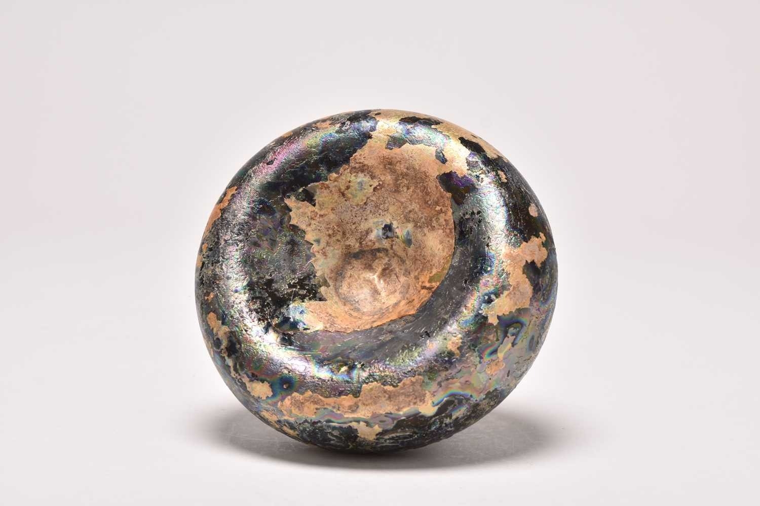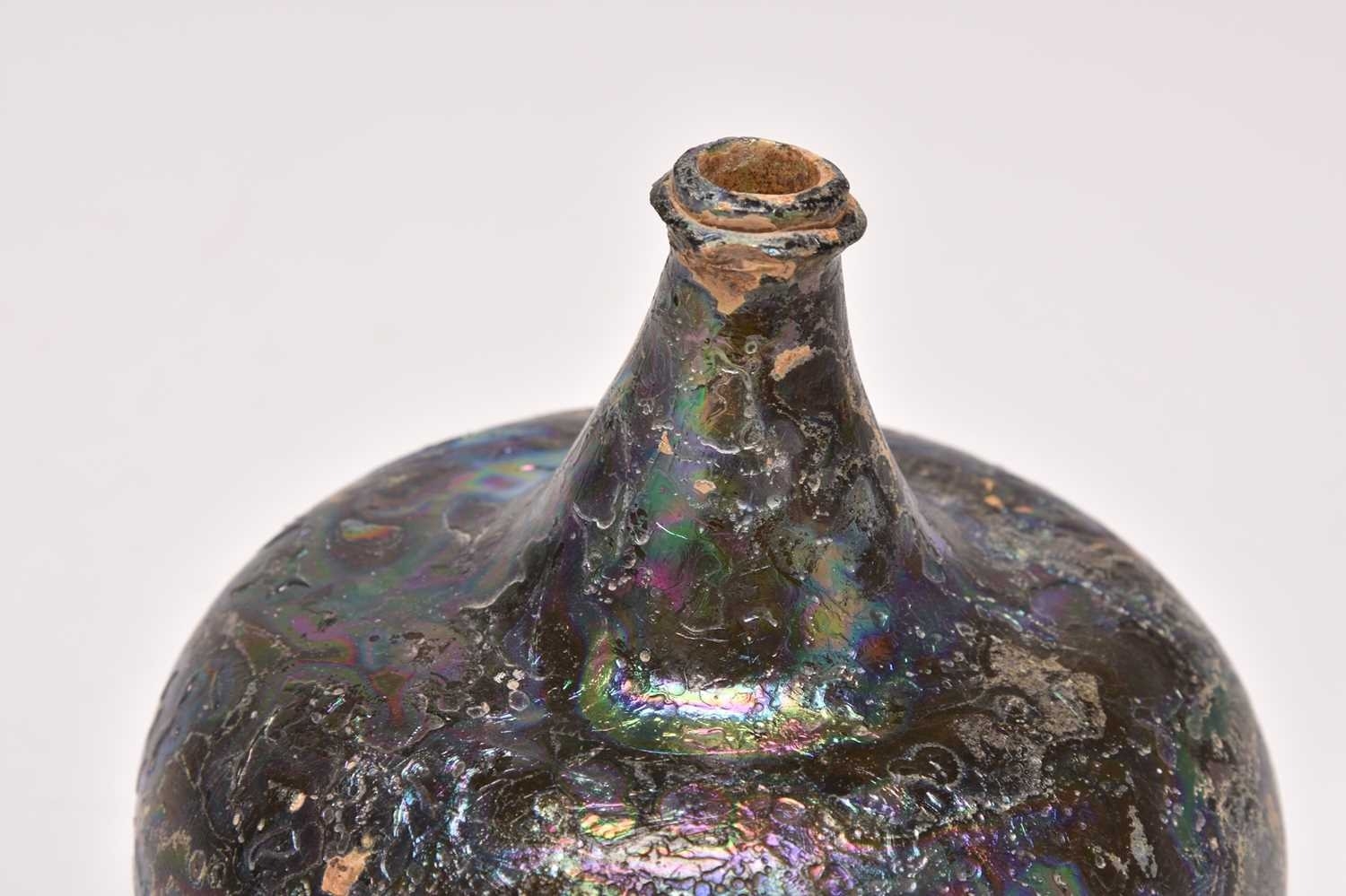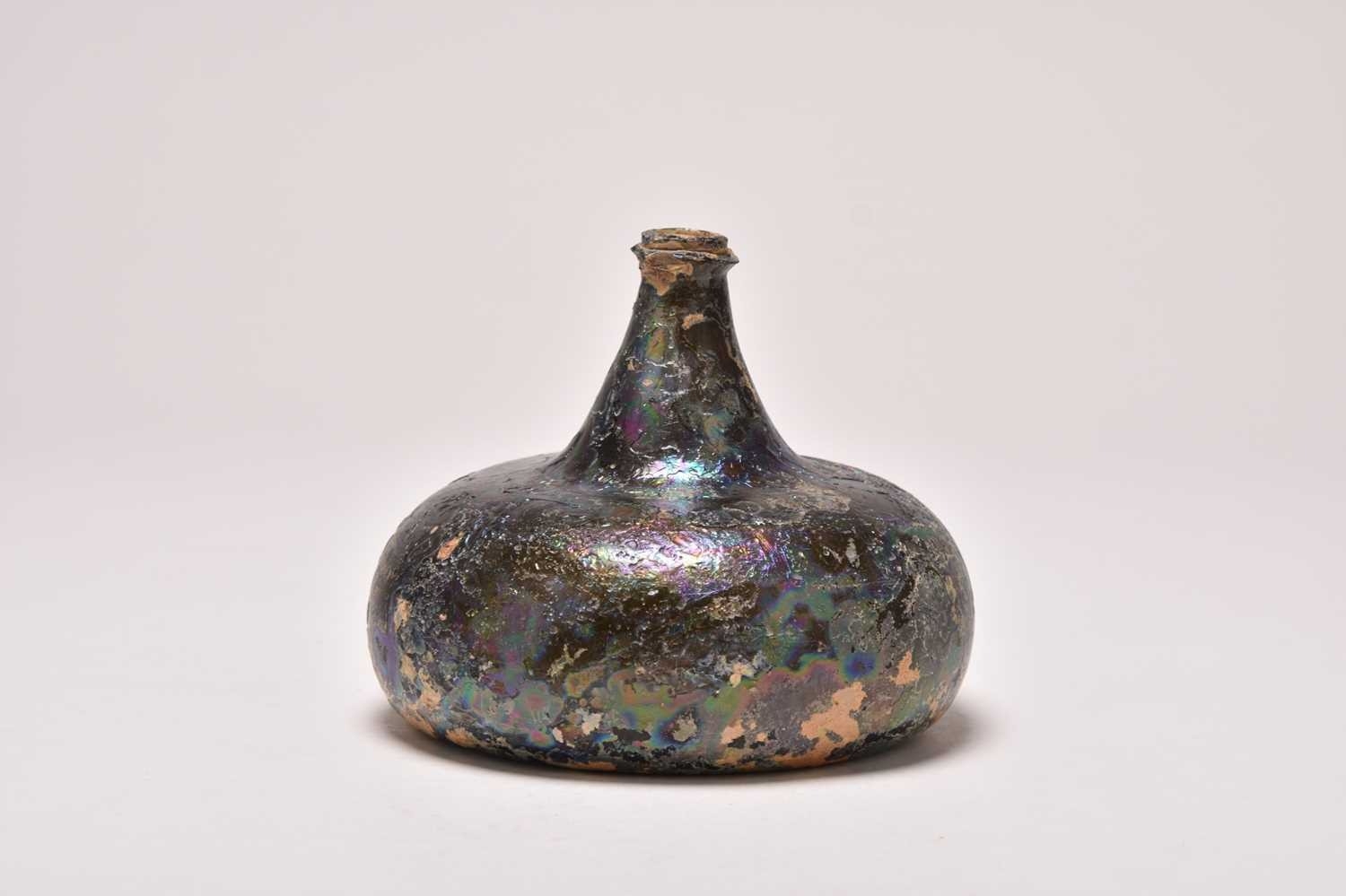 A nicely patinated glass wine bottle, early 18th century, of onion shape, with strong iridescence, deep kick the base and line-strung rim, 14cm high *Recovered from the ground during excavations at a local Shropshire property.