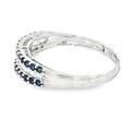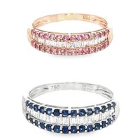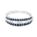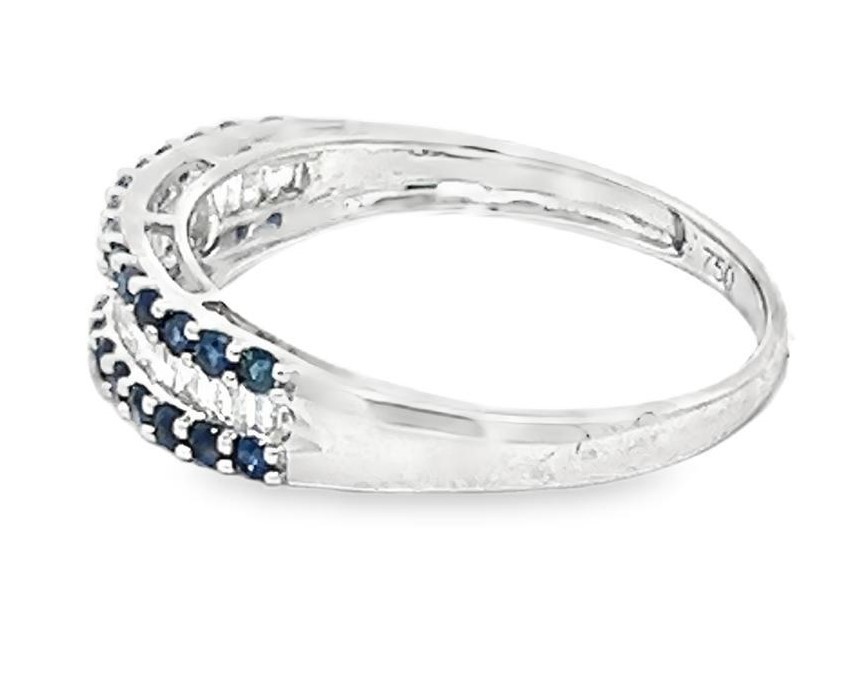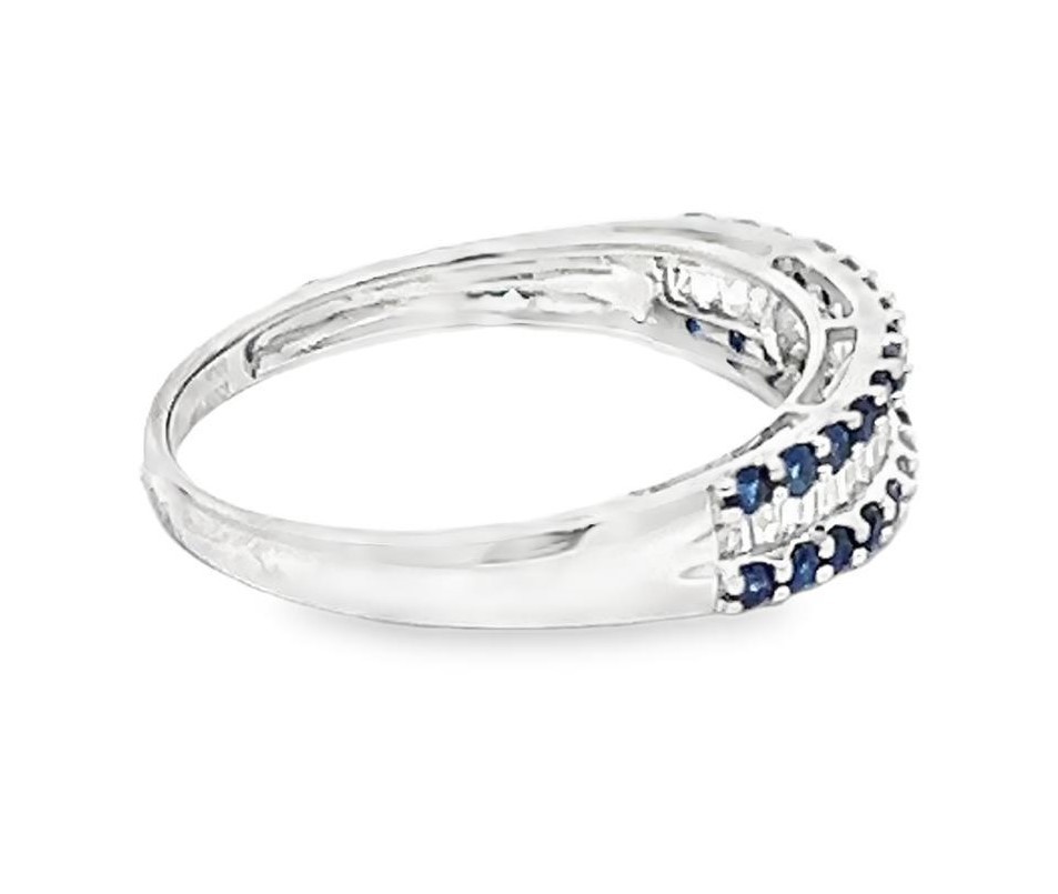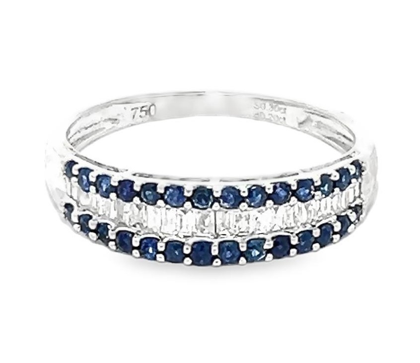 An 18ct white gold, sapphire and diamond three row ring, size K/L Comprising of a central row of baguette cut diamonds between two rows of round brilliant cut sapphires. 2.06g