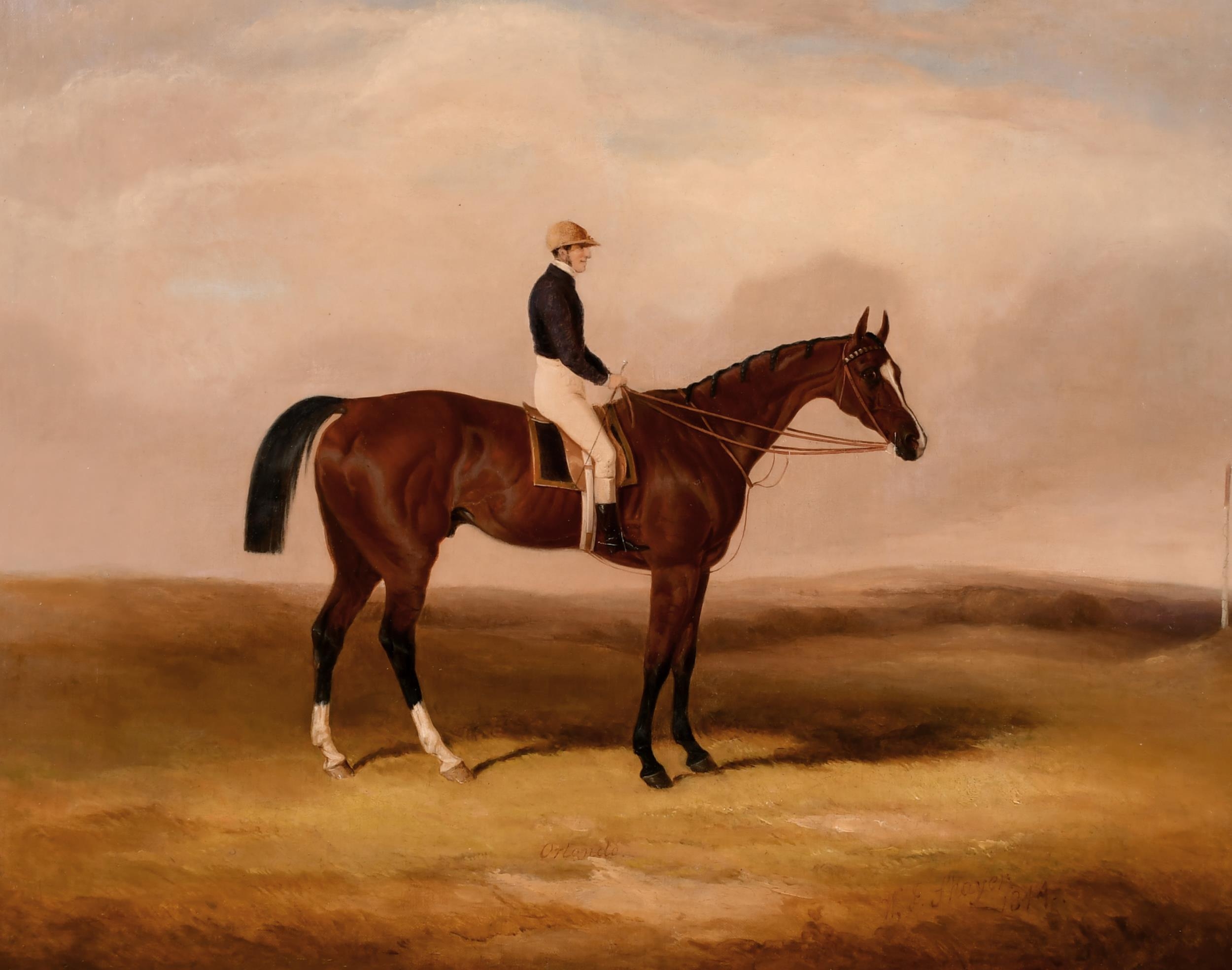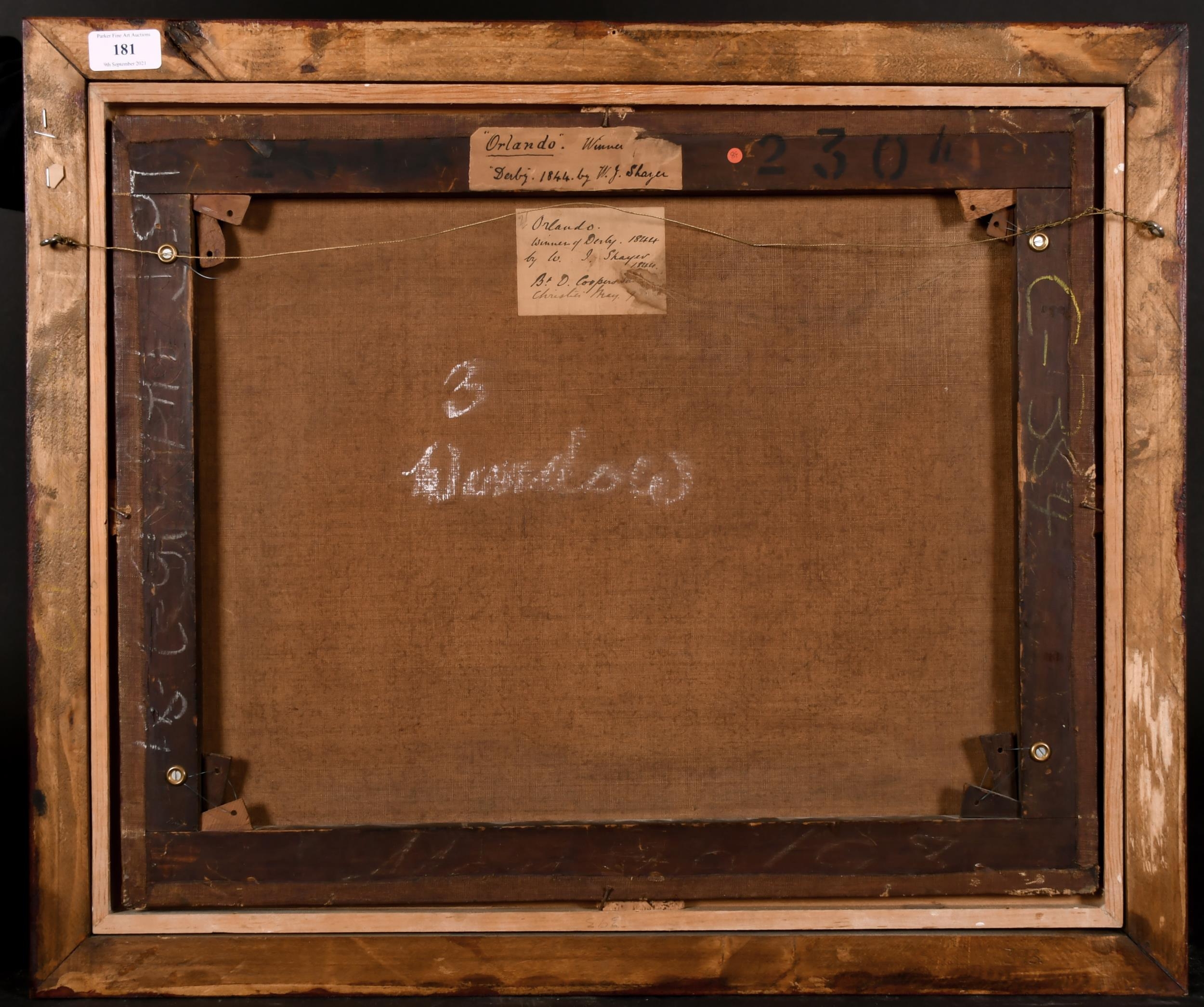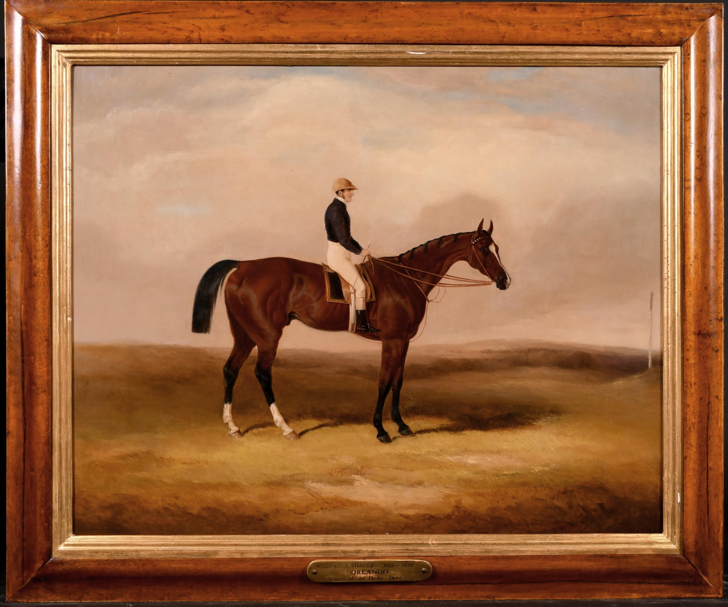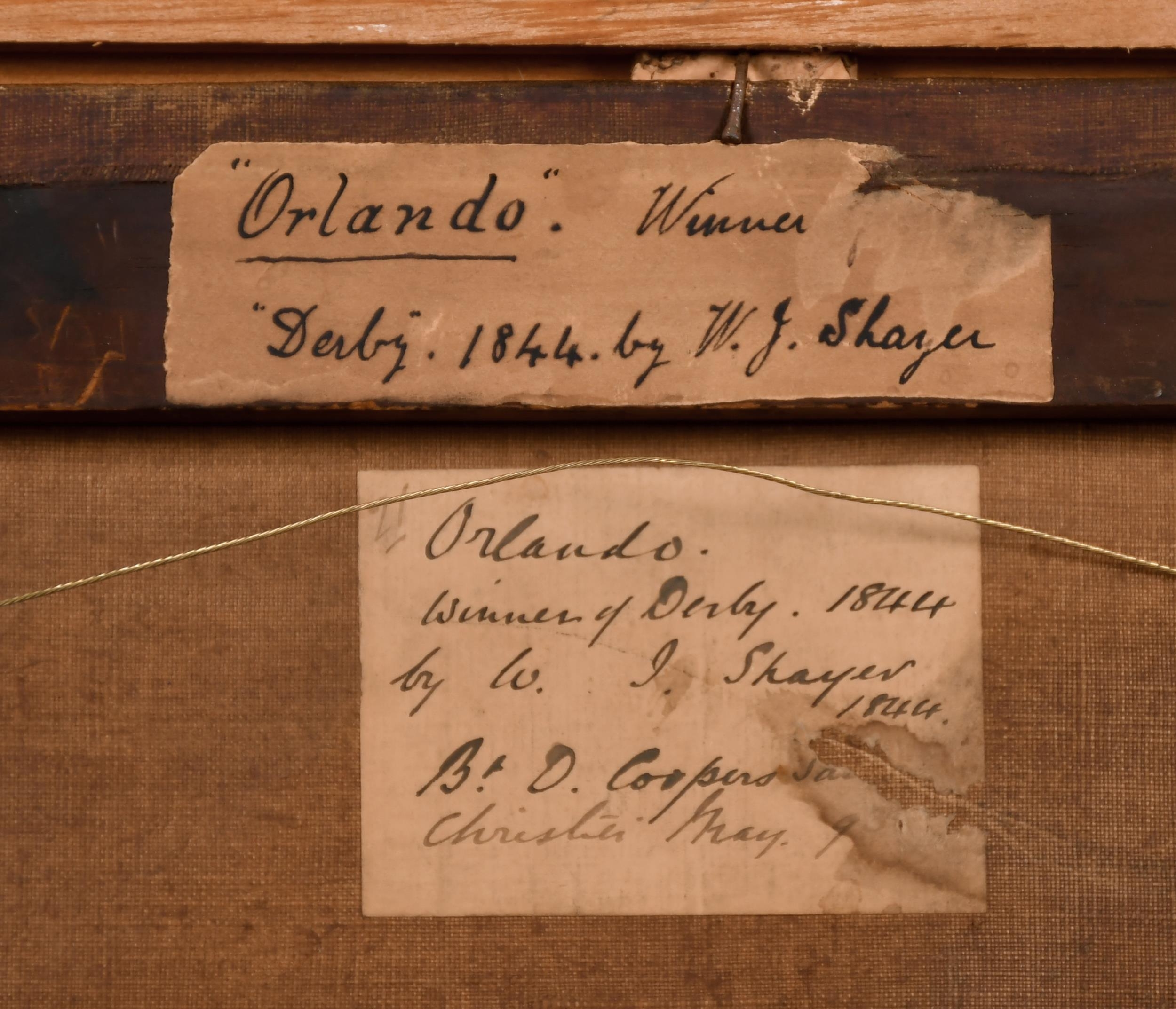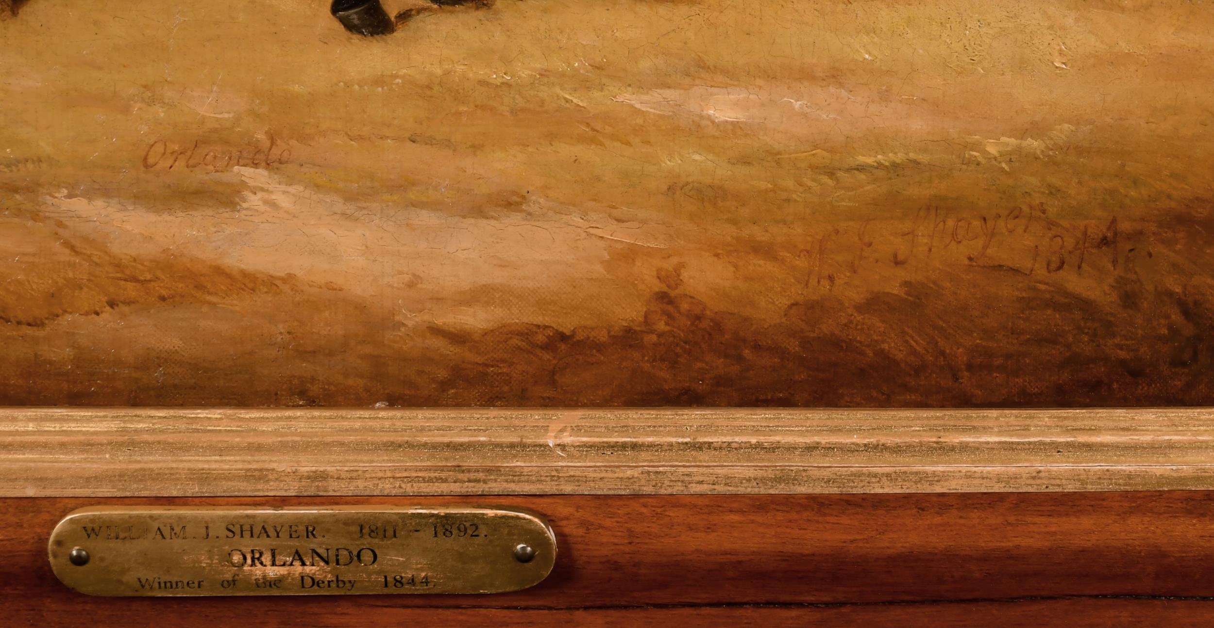 William Joseph Shayer (1811-1891) British. "Orlando, Winner of the Derby 1844", Oil on Canvas, Signed, Inscribed and Dated 1844, and Inscribed on labels verso, in a Maple Frame, 17" x 21" (43.2 x 53.3cm). Provenance: D. Coopers Sale, Christies, May '93 (1893). Notes: Jockey Nat Flatman, Trainer W Cooper, Owner Jonathan Peel