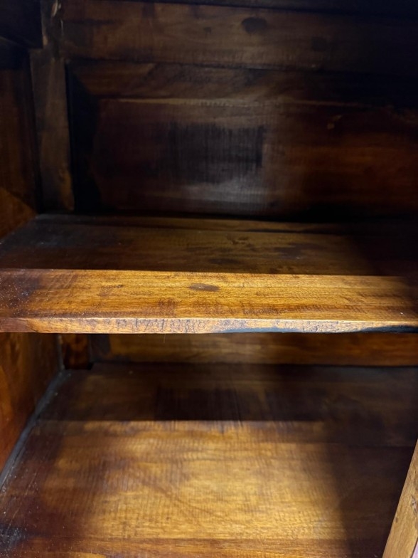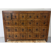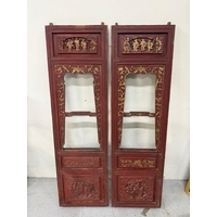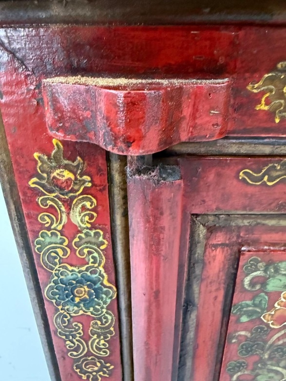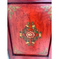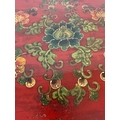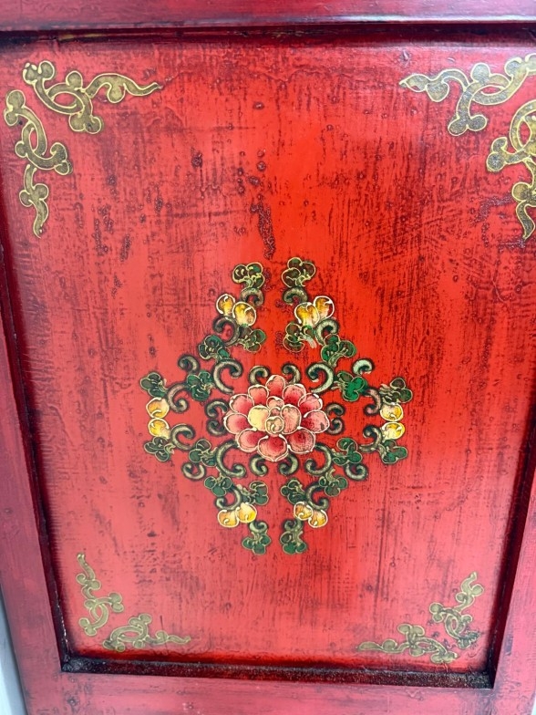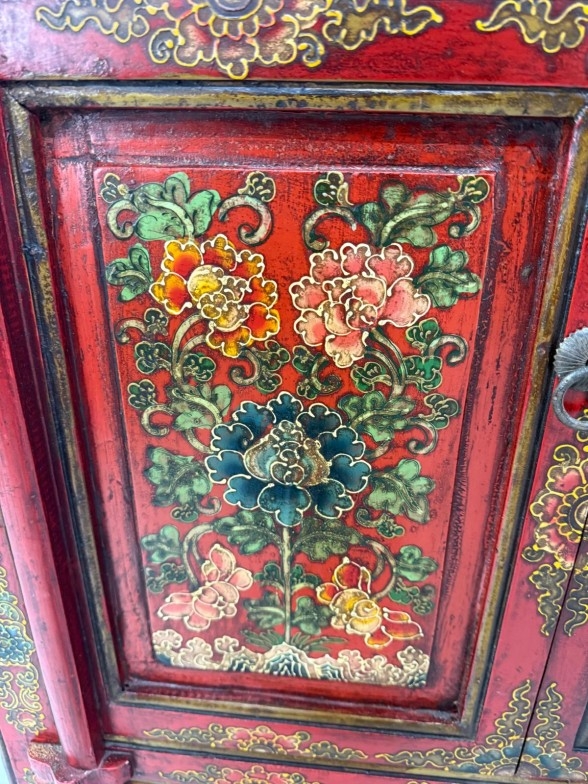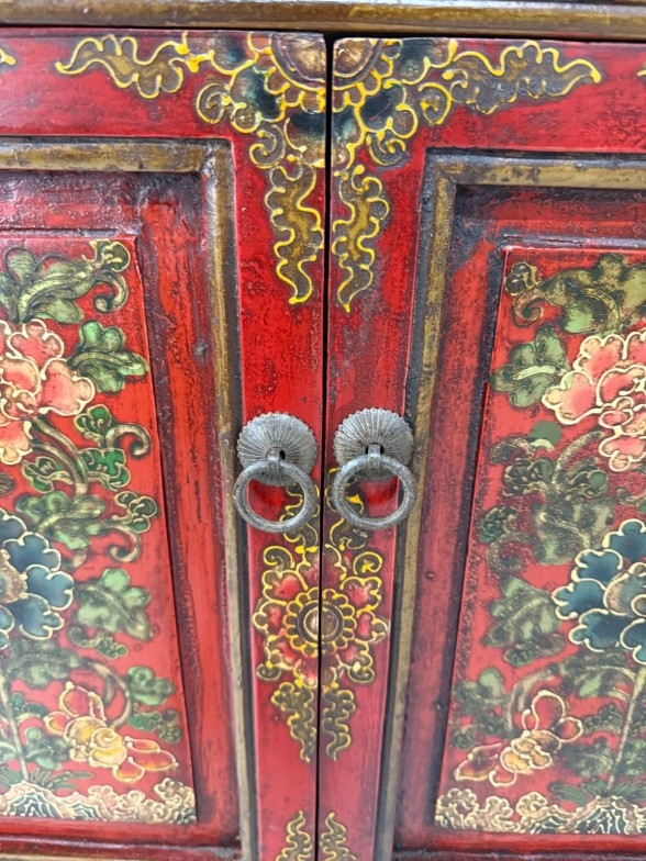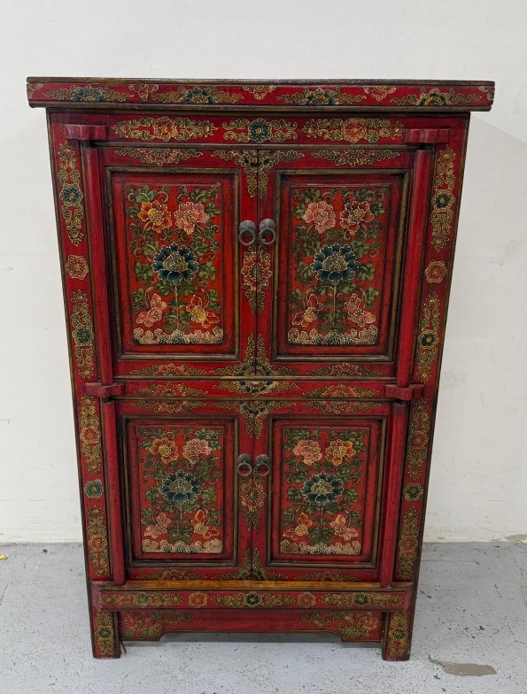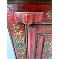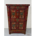 A Chinese style hall cabinet with two cupboards, red grounds and decorated with green and gilt flowers H 120c, W75cm D45cm