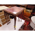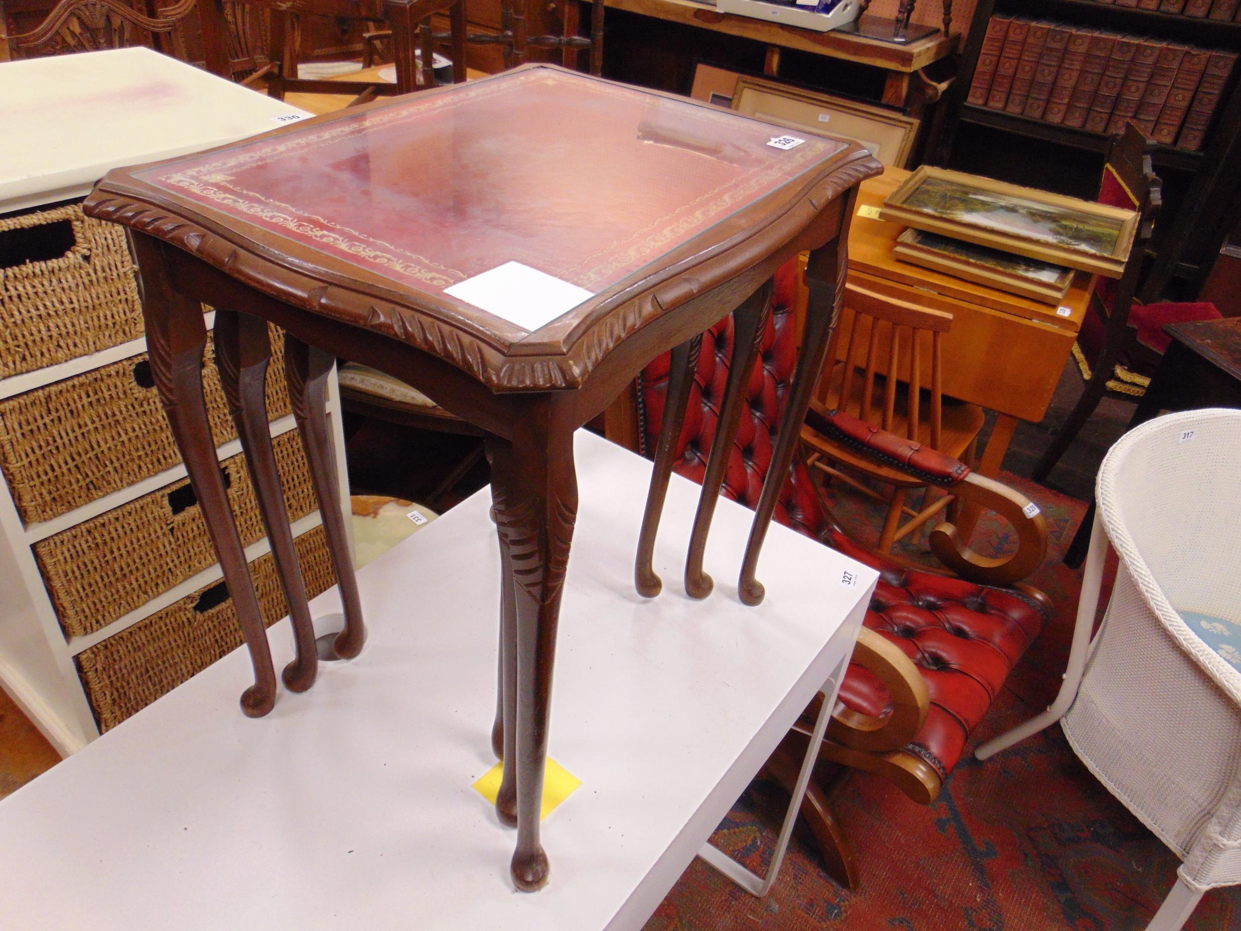 Reproduction glass topped red leather nest of three tables, on cabriole supports. The tallest 22" high.