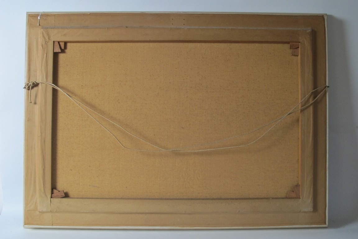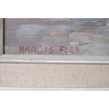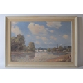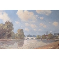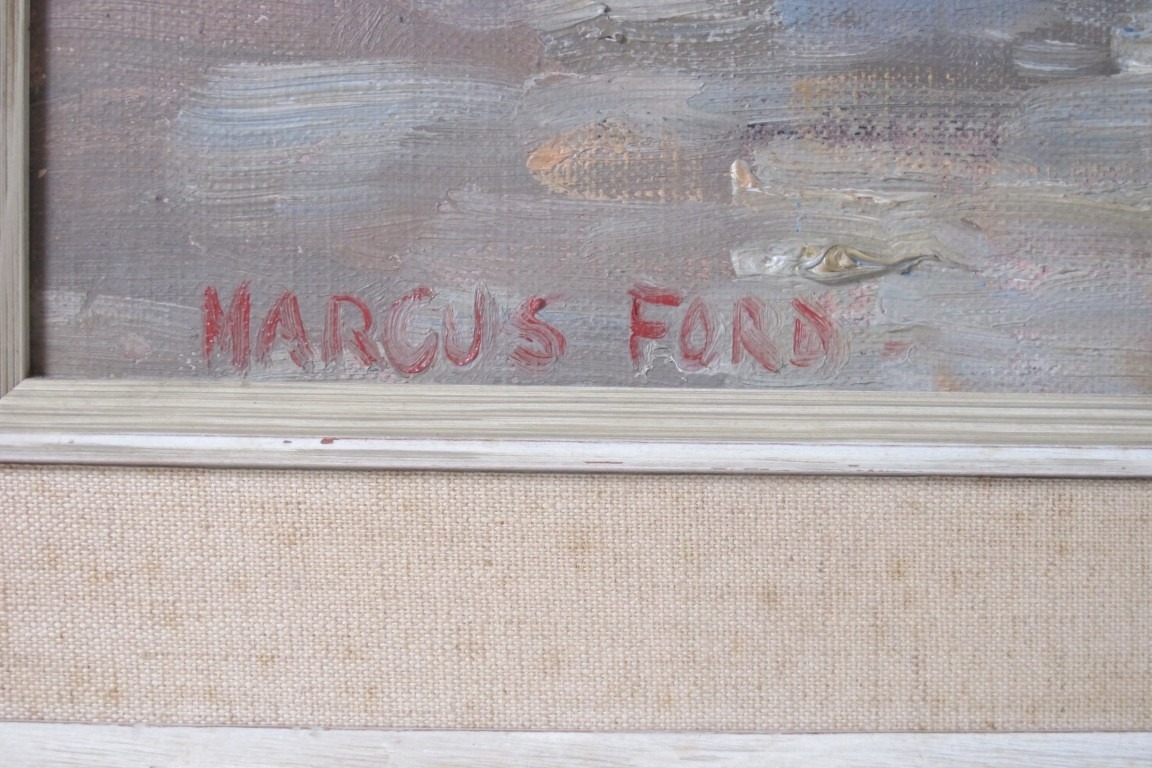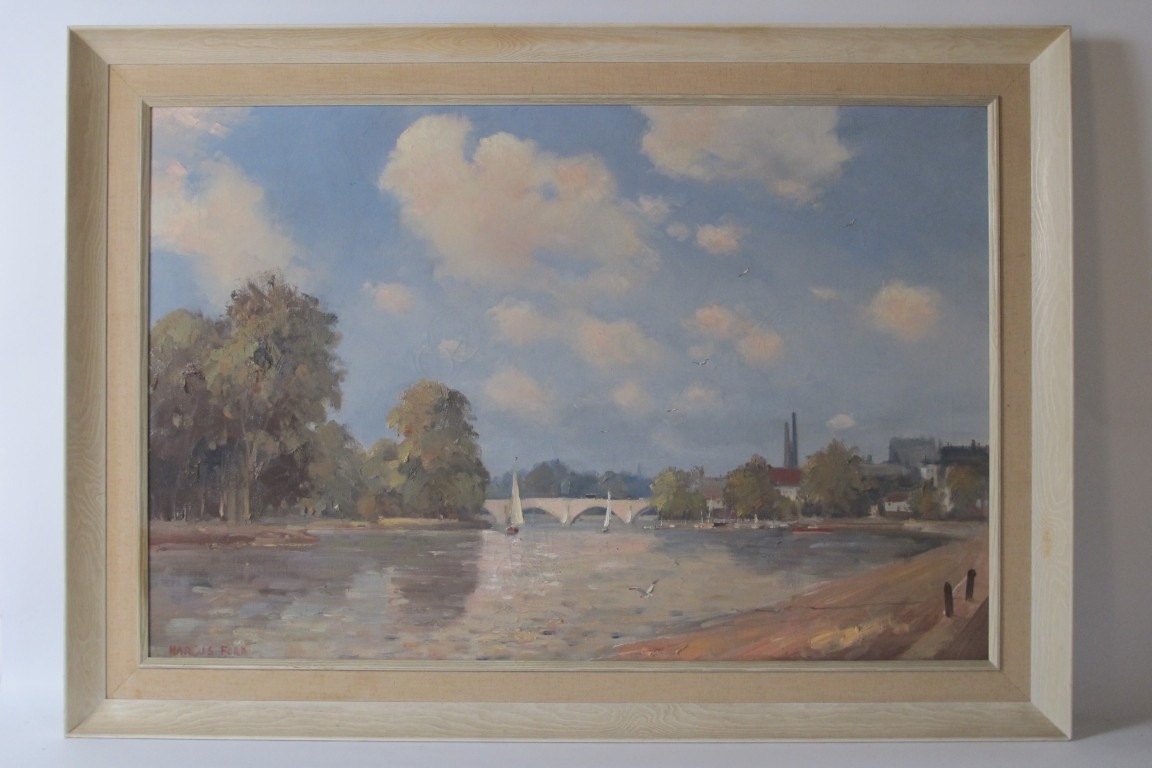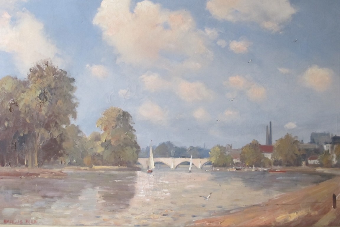 Marcus Ford (1914-1989), a 20th century oil on canvas, sailing boats on a river with a bridge and buildings in the background, signed to the lower left in a hessian lined frame. 76x107cm approx.