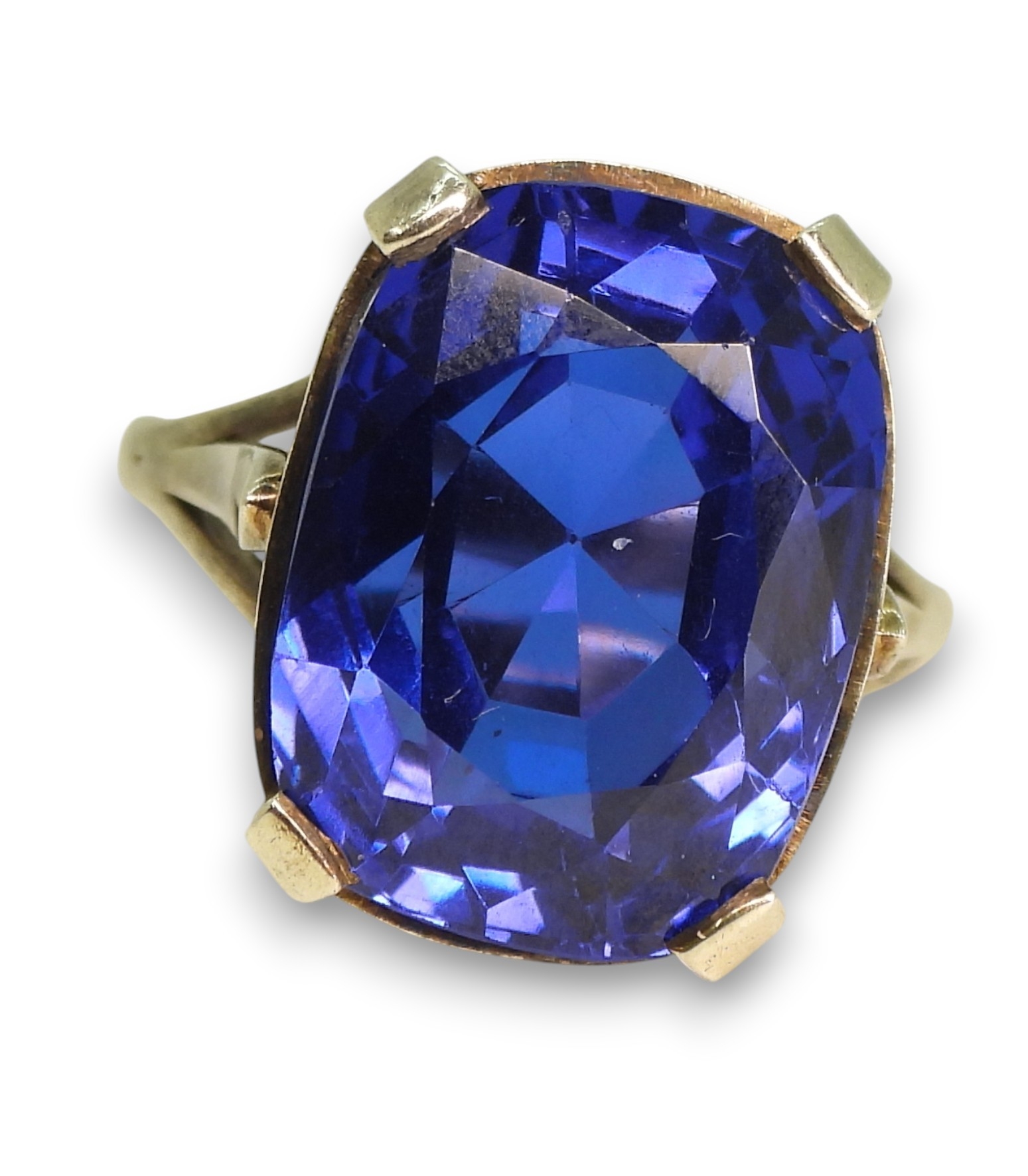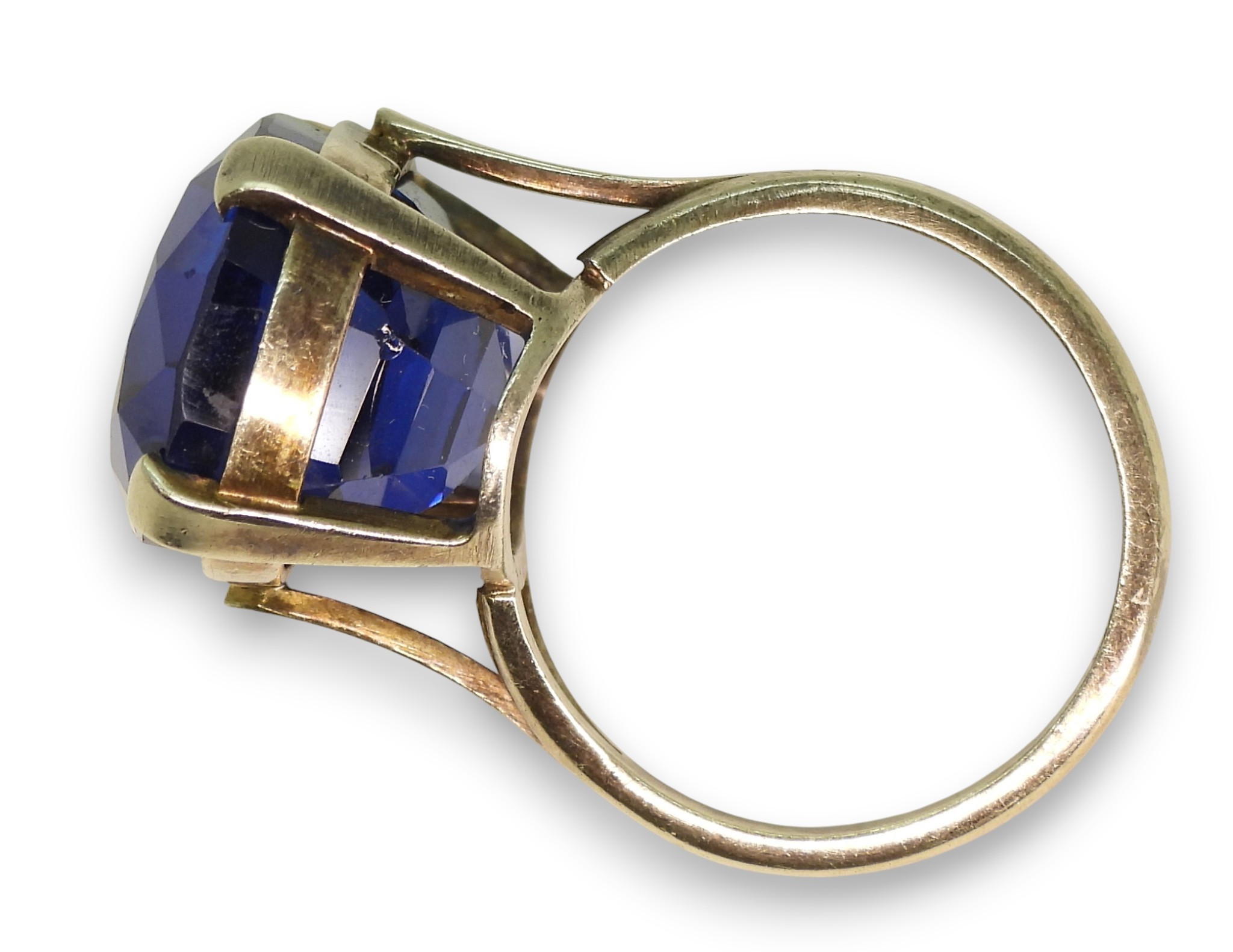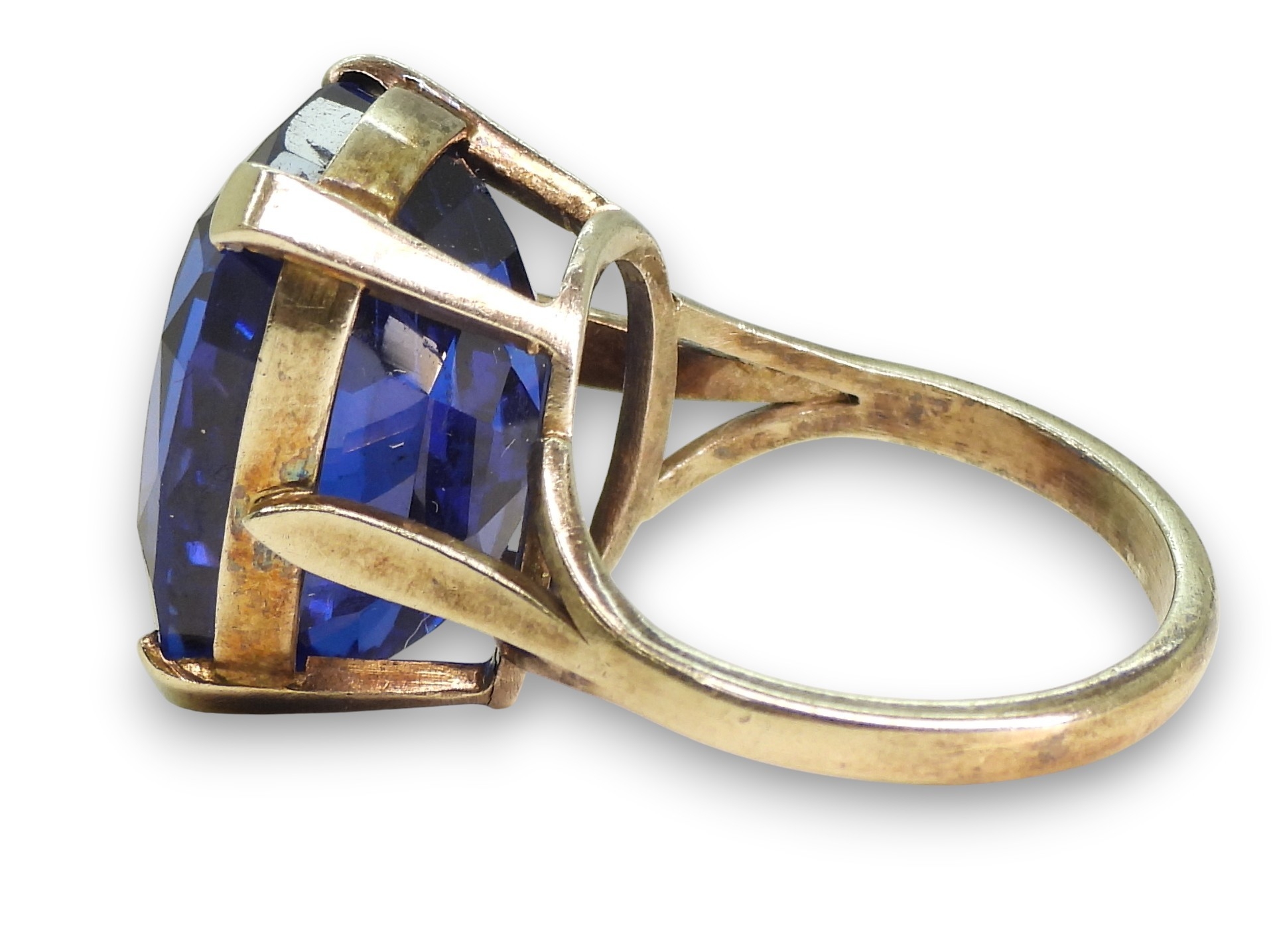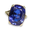 A statement blue glass gem ring in an unhallmarked handmade white metal mount, size L1/2, weight 7.6gms