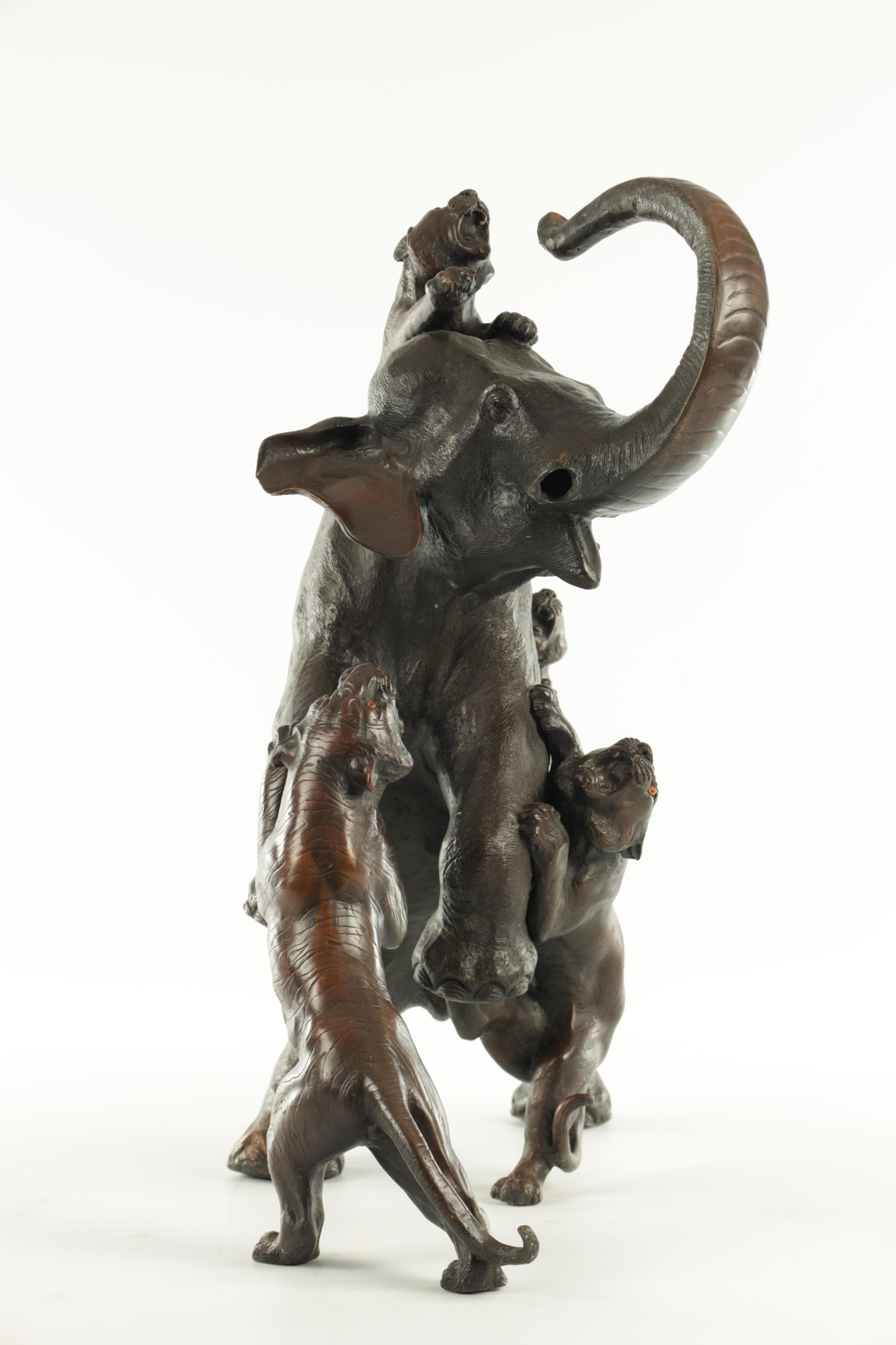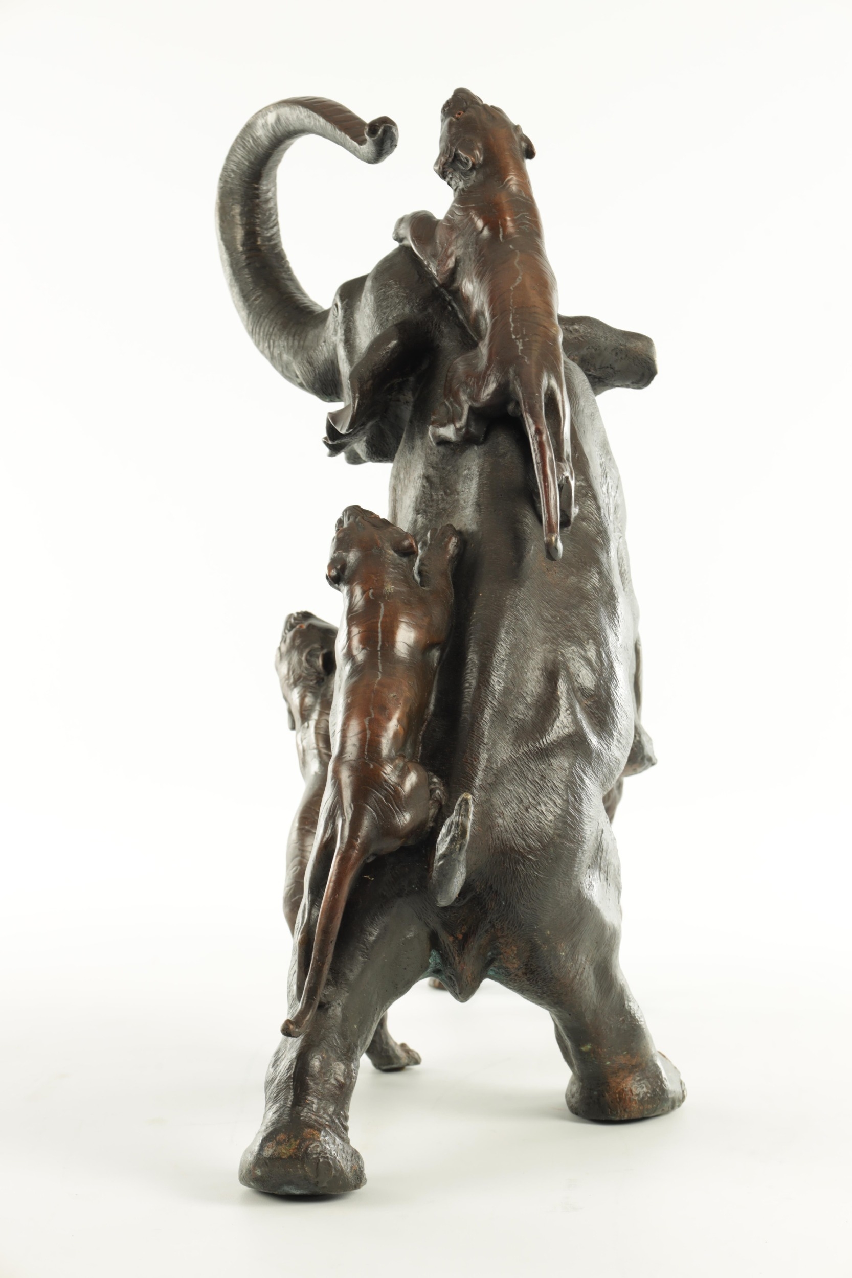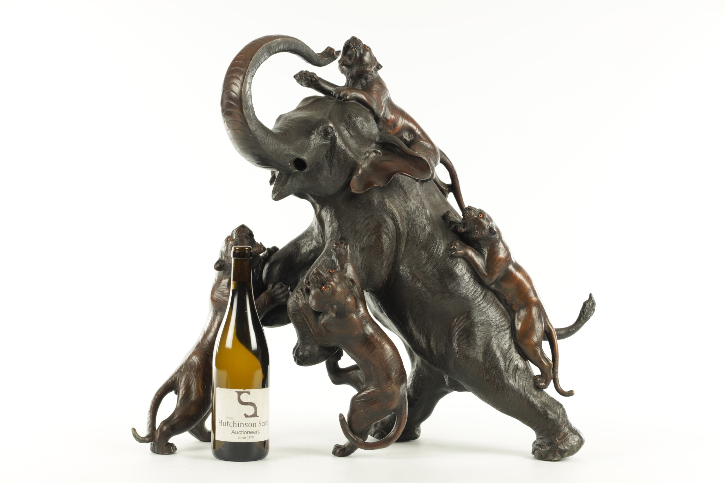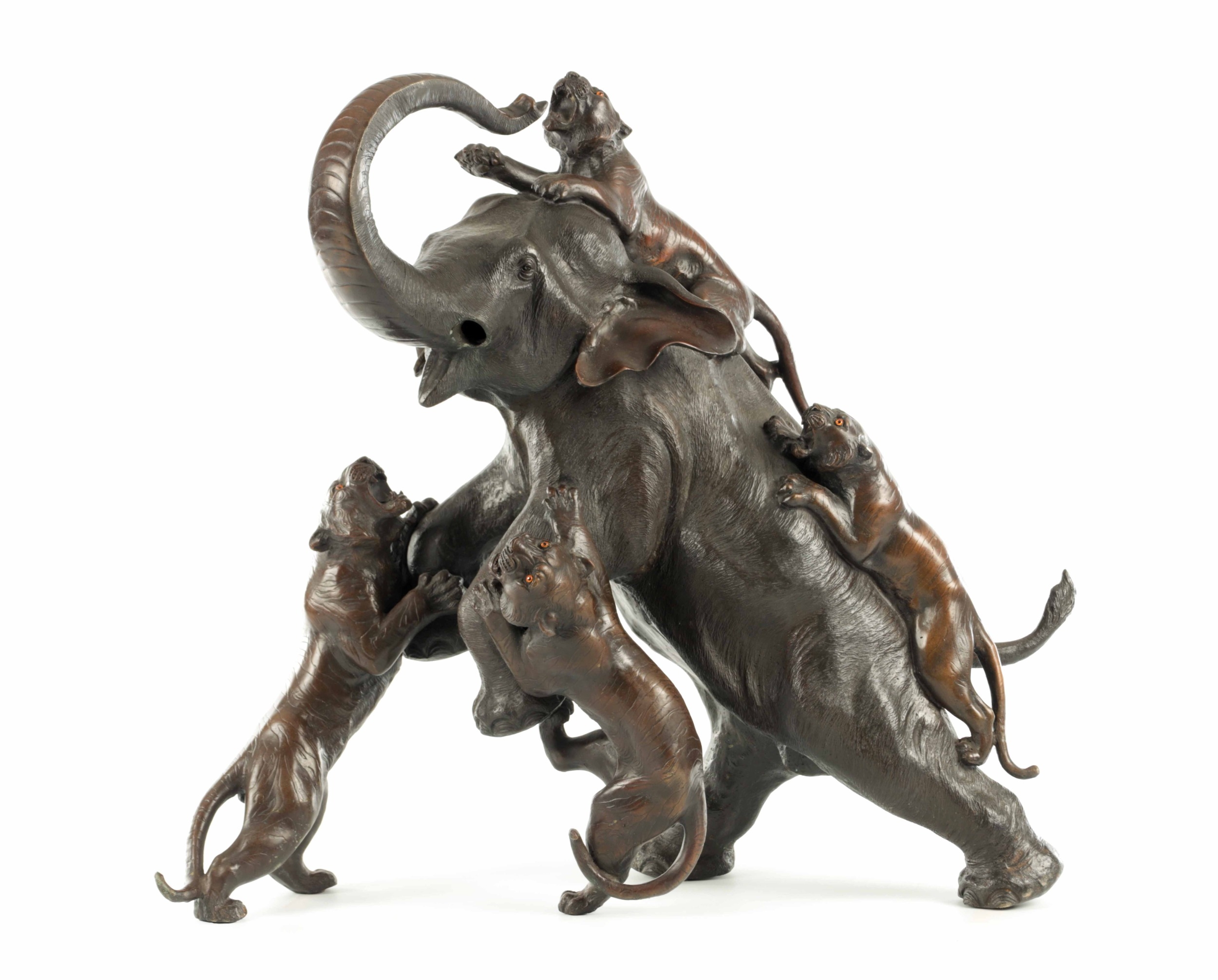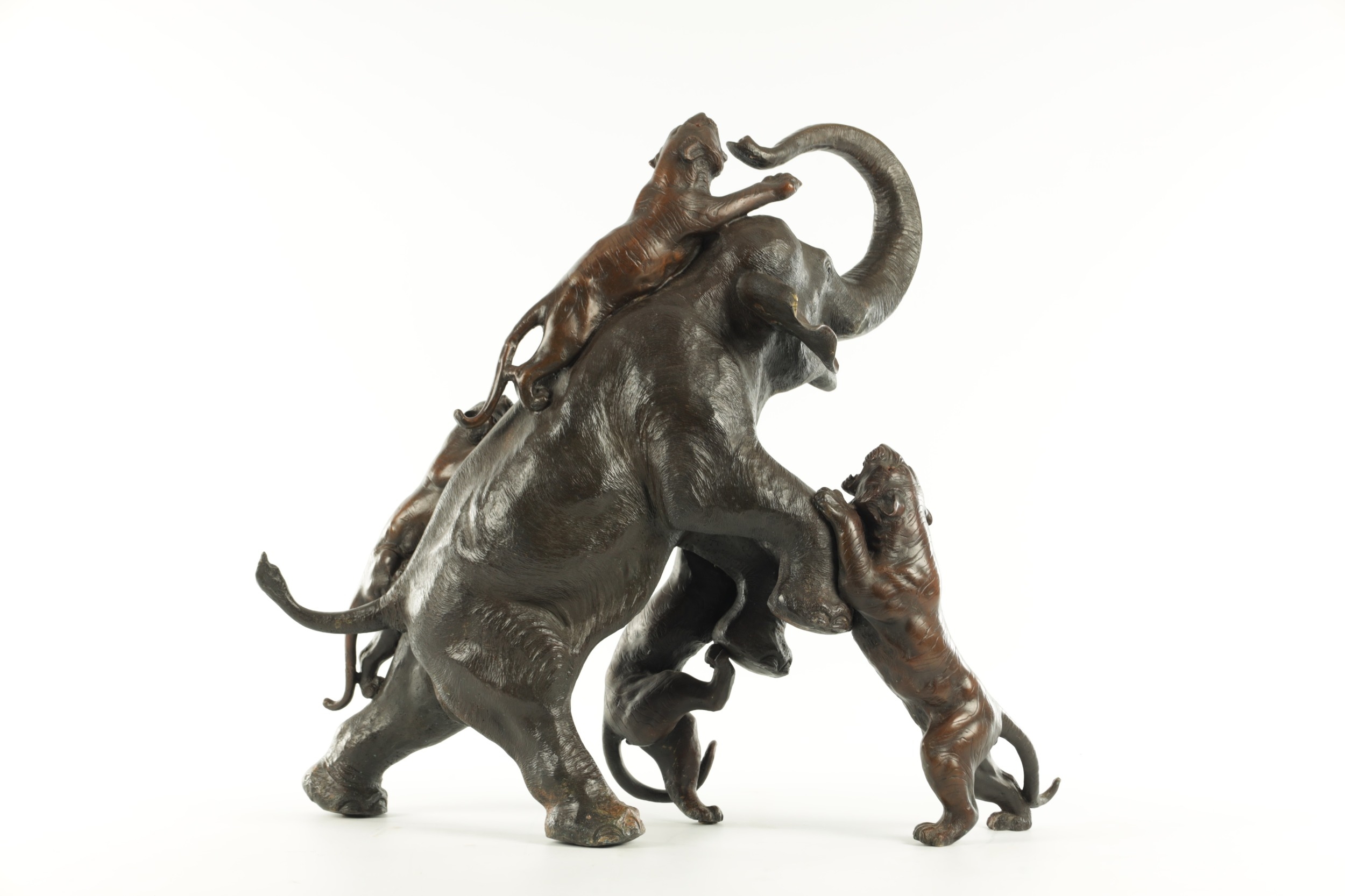 AN IMPRESSIVE JAPANESE MEIJI PERIOD BRONZE ANIMAL SCULPTURE OF TIGERS AND AN ELEPHANT with insect glass eyes and signature to the underside of the foot. (59cm high, )
