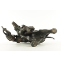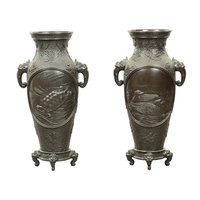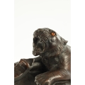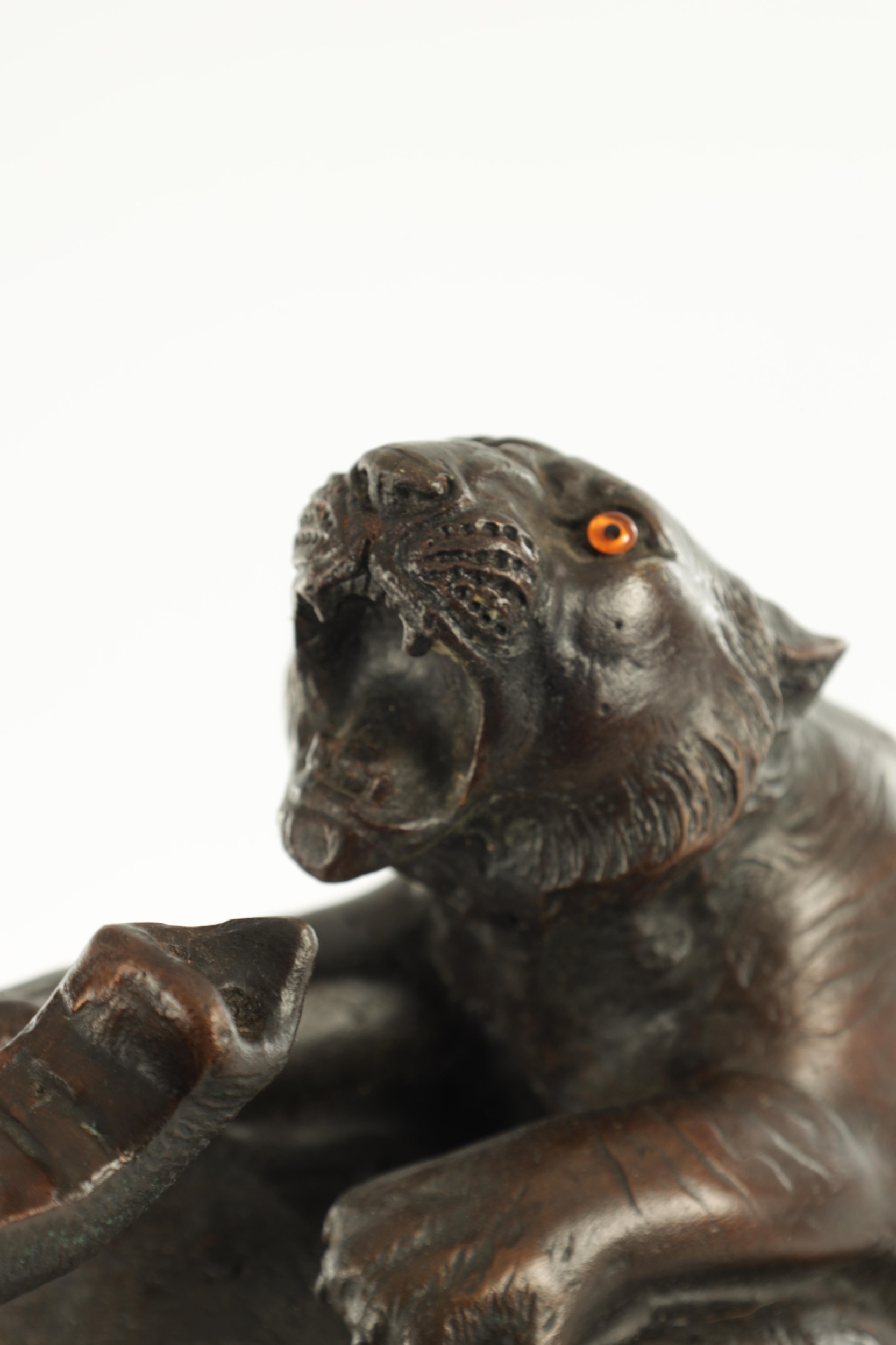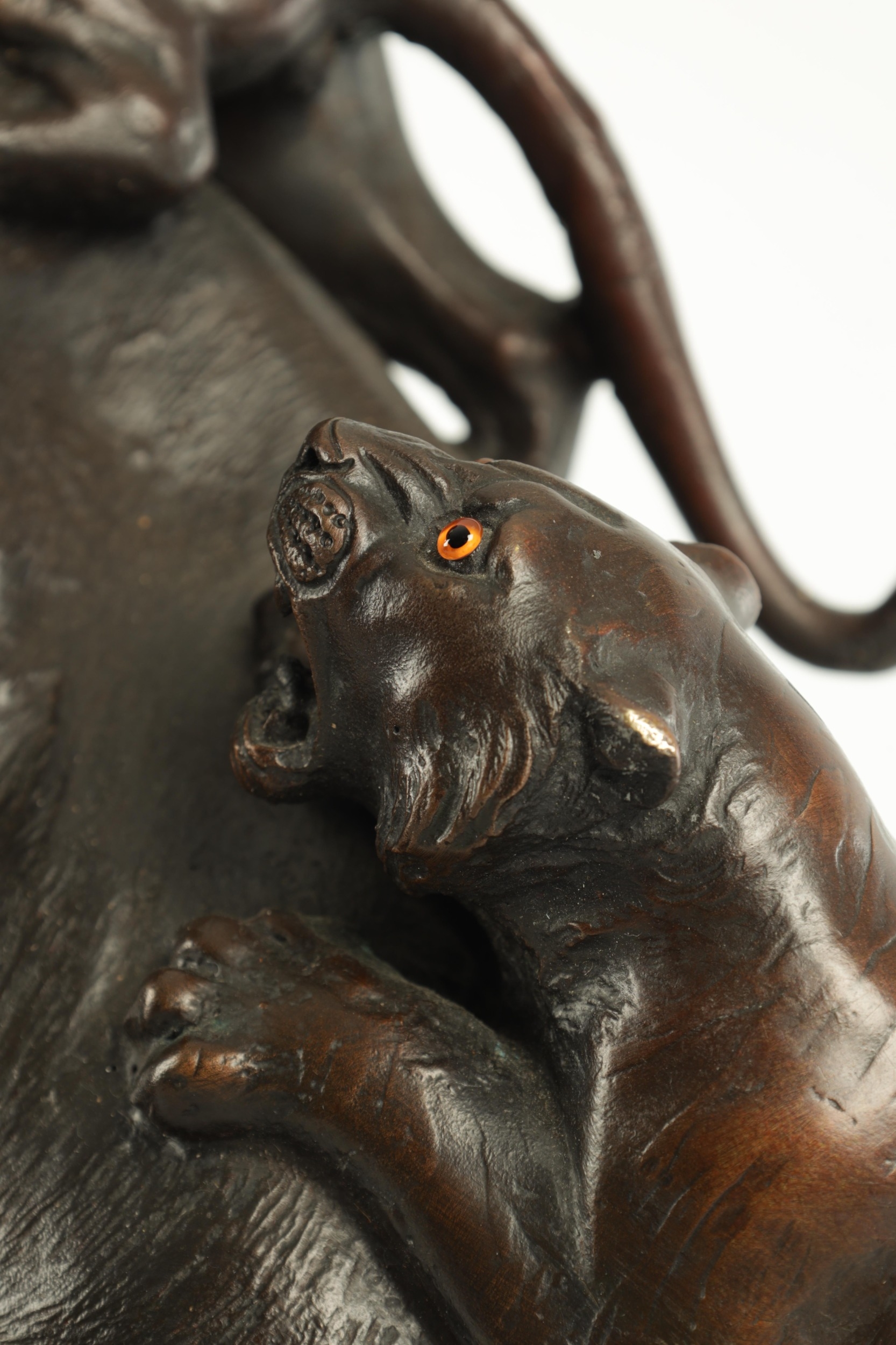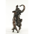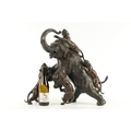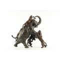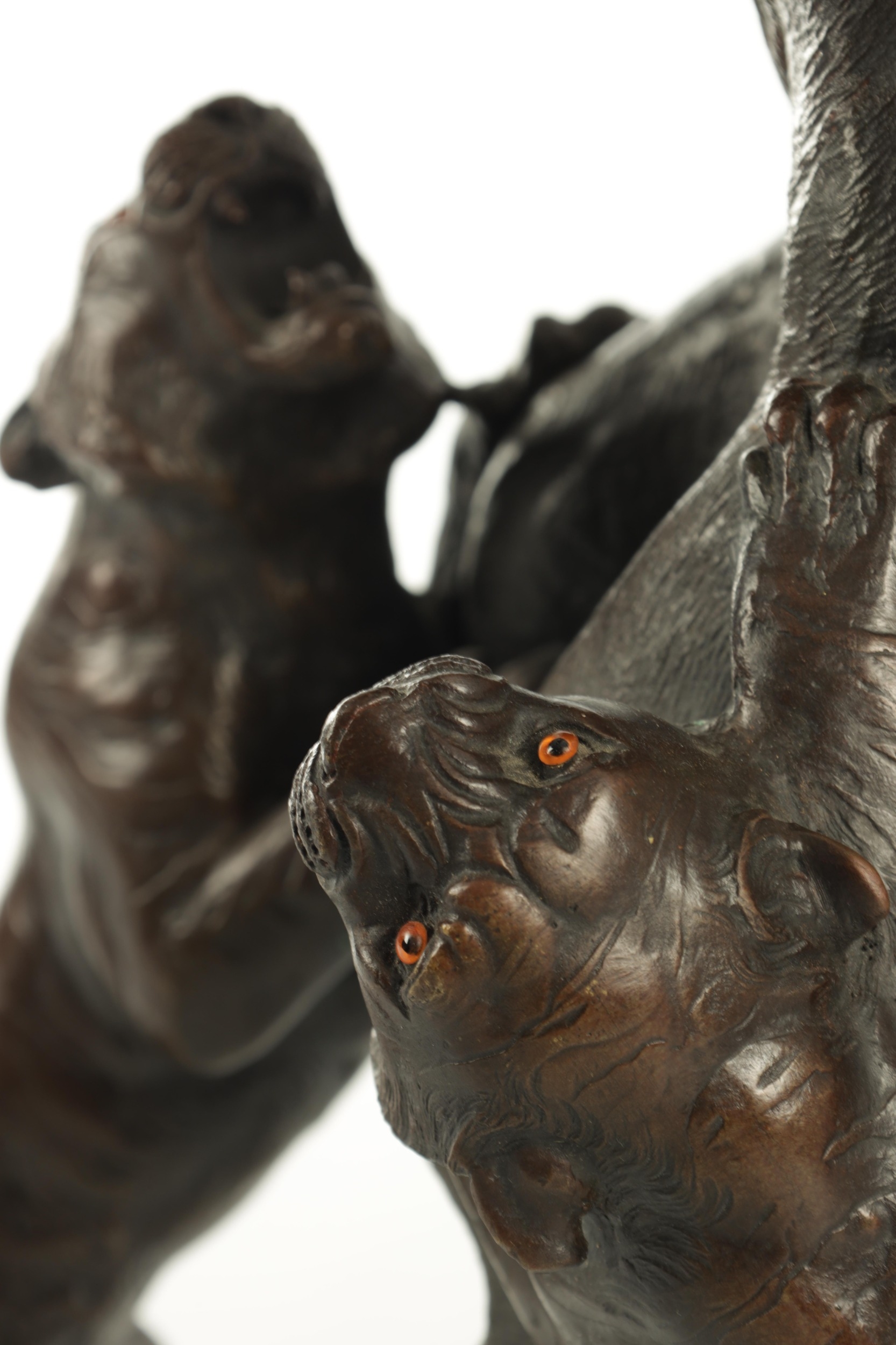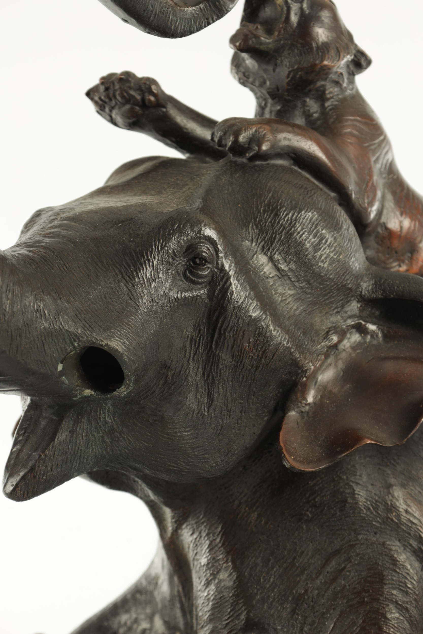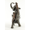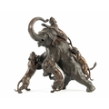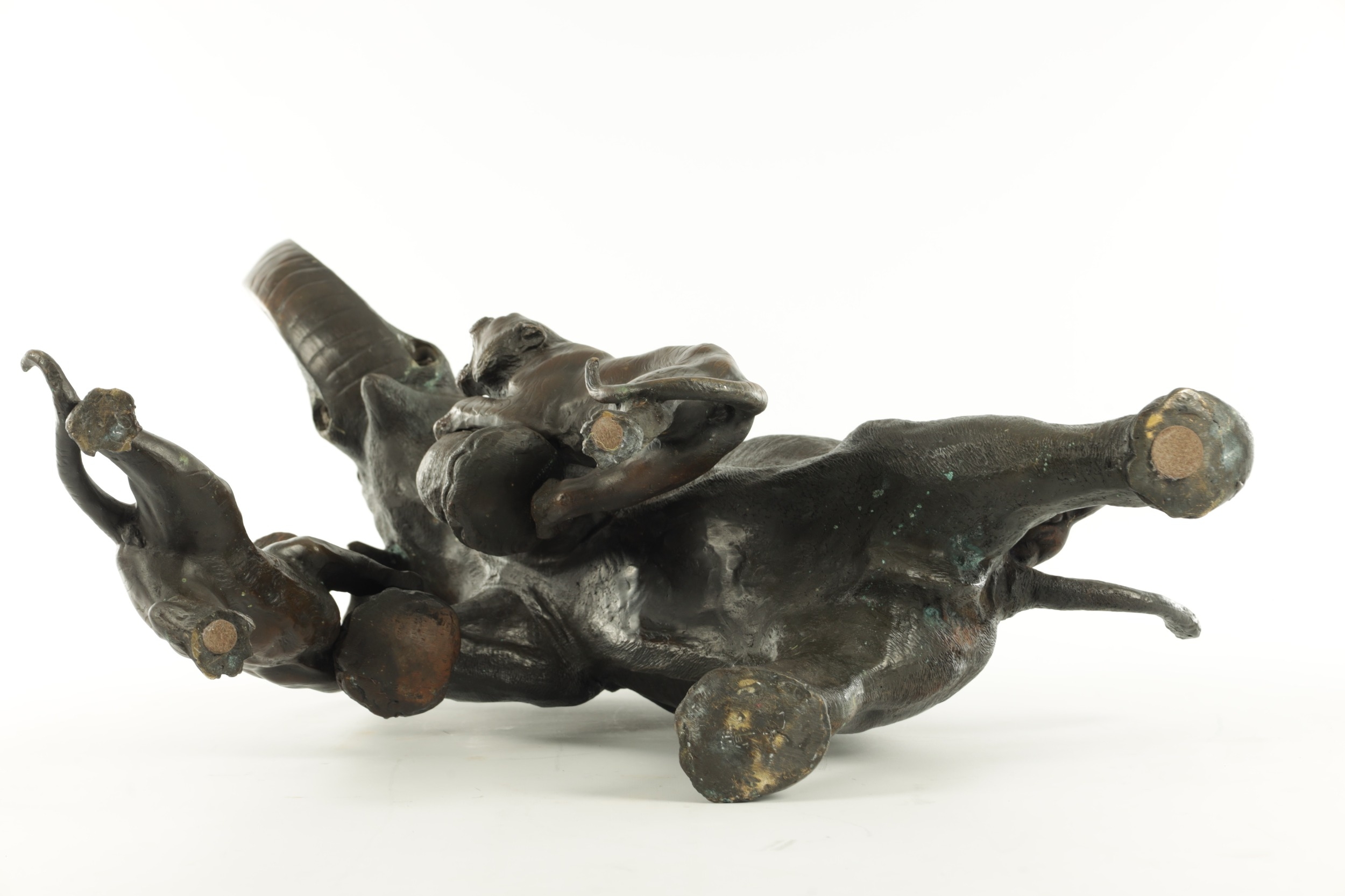 AN IMPRESSIVE JAPANESE MEIJI PERIOD BRONZE ANIMAL SCULPTURE OF TIGERS AND AN ELEPHANT with insect glass eyes and signature to the underside of the foot. (59cm high, )