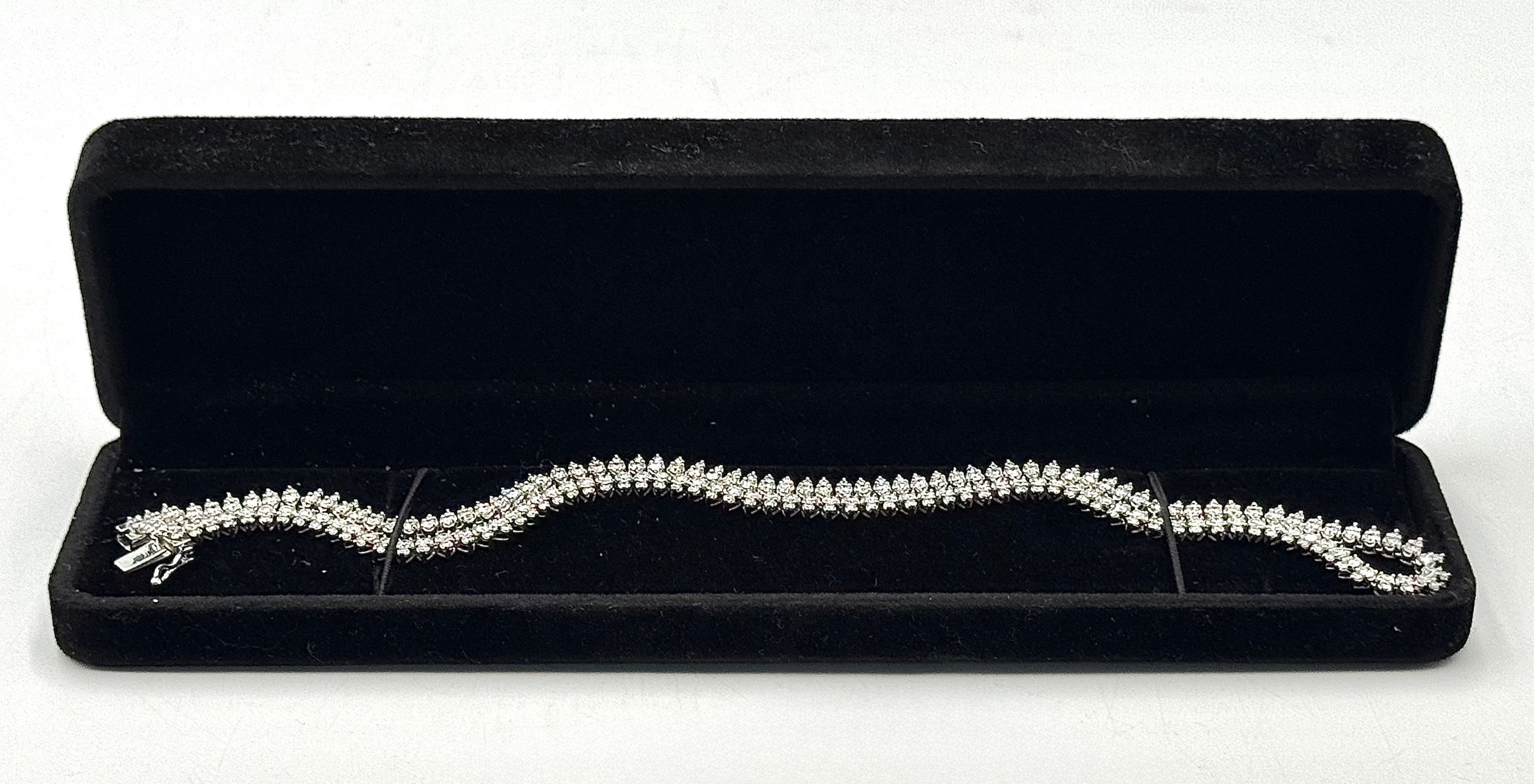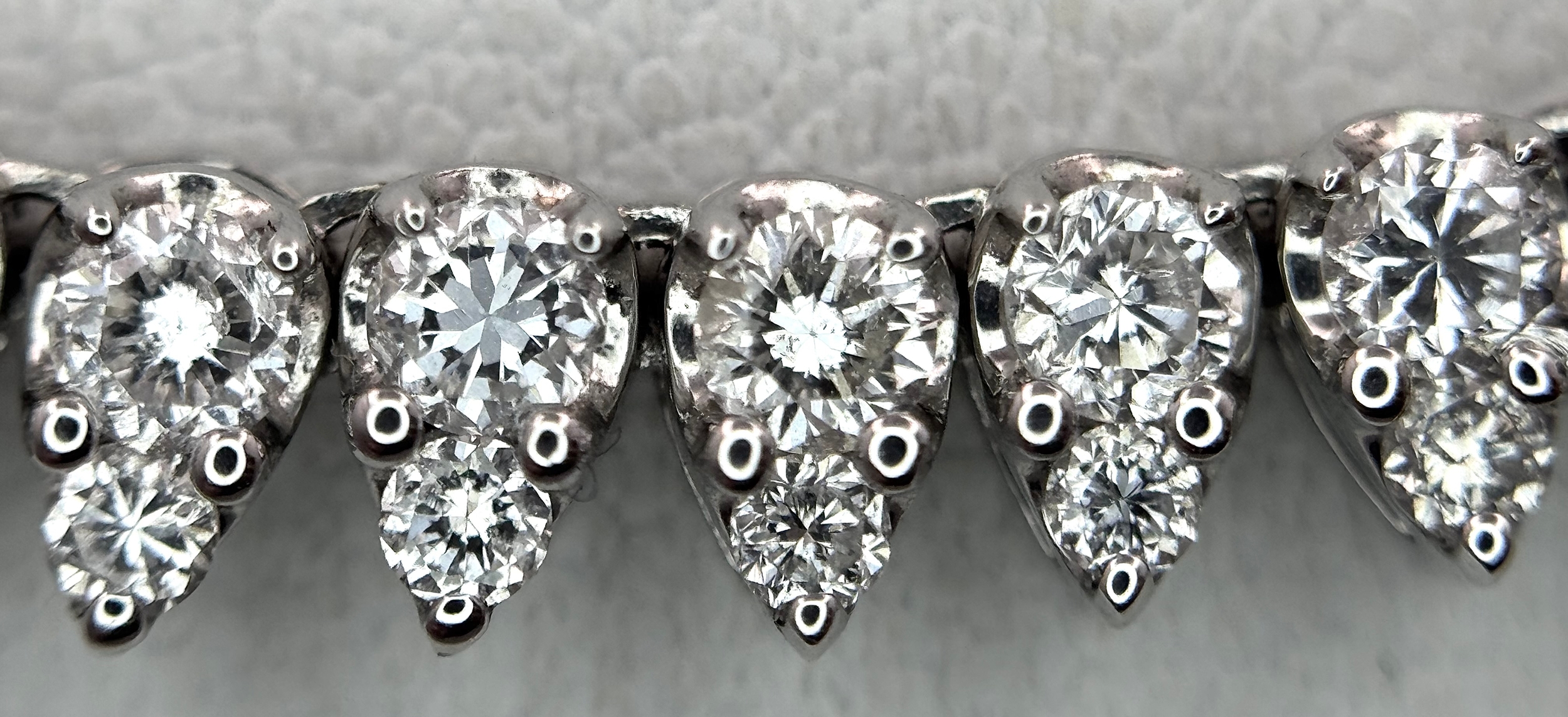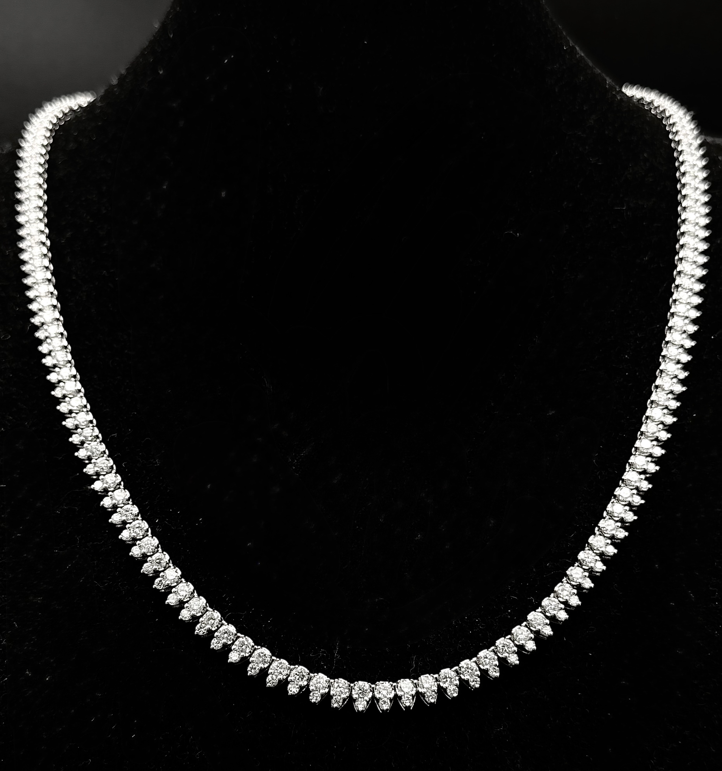 An 18K White Gold Diamond Tennis Necklace. 10ctw of round brilliant cut diamonds. G-H colour. SI1/2 clarity. 45cm. 31g total weight.