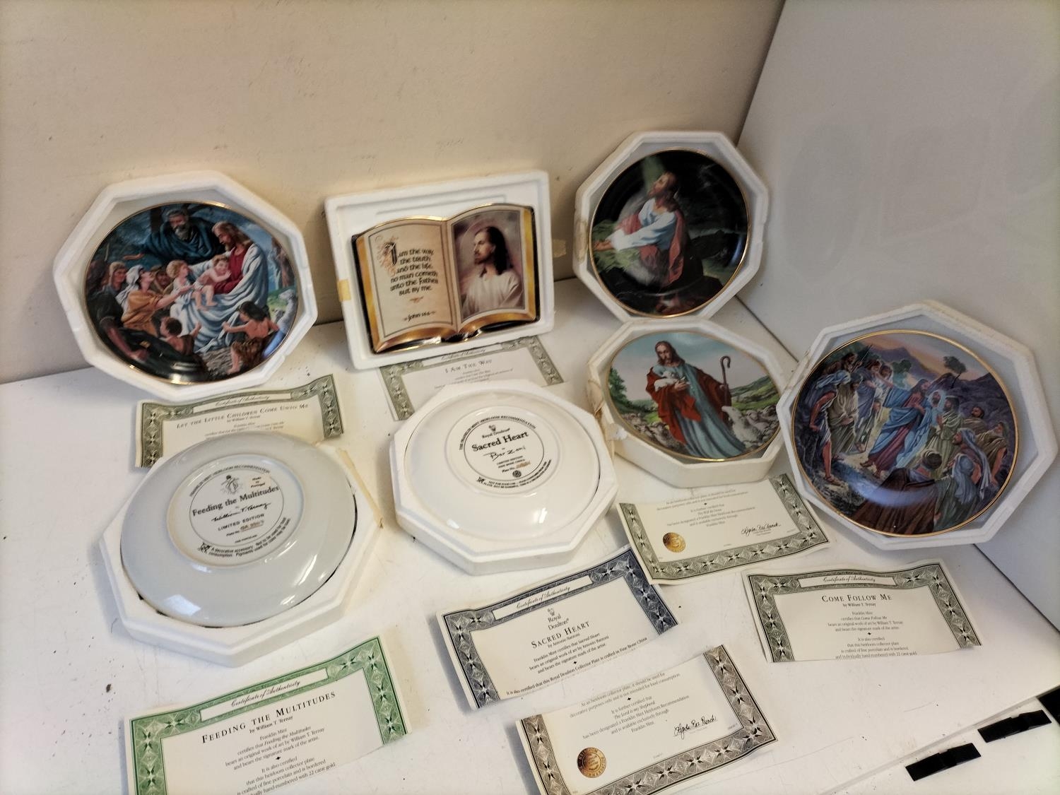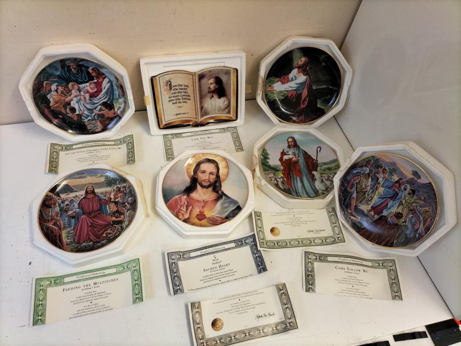 Religious China Plaques (7). Approx 21cm Diameter. Boxed.