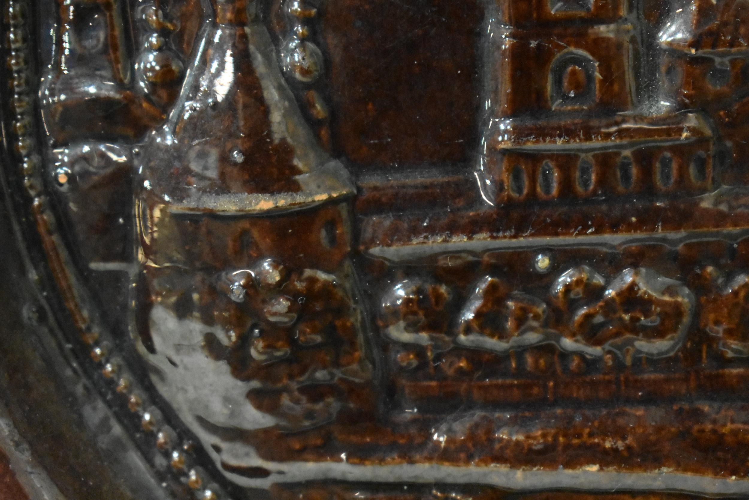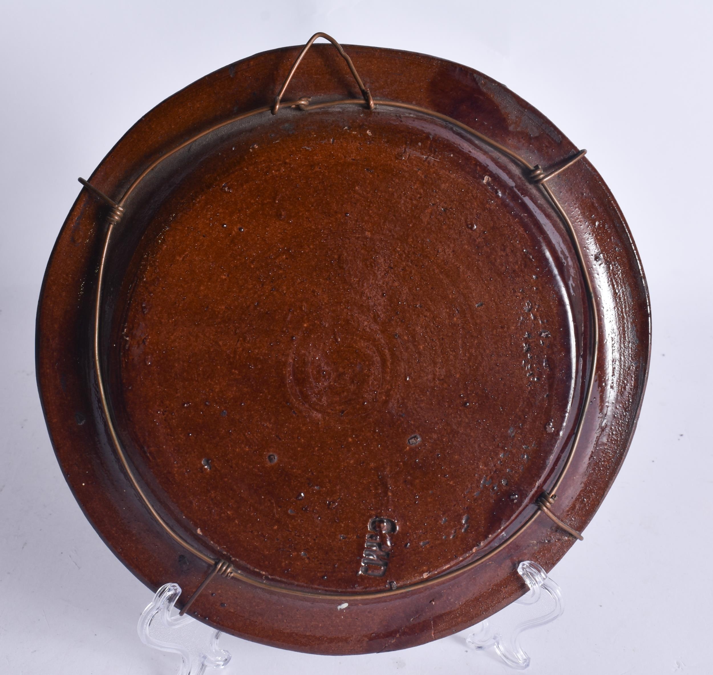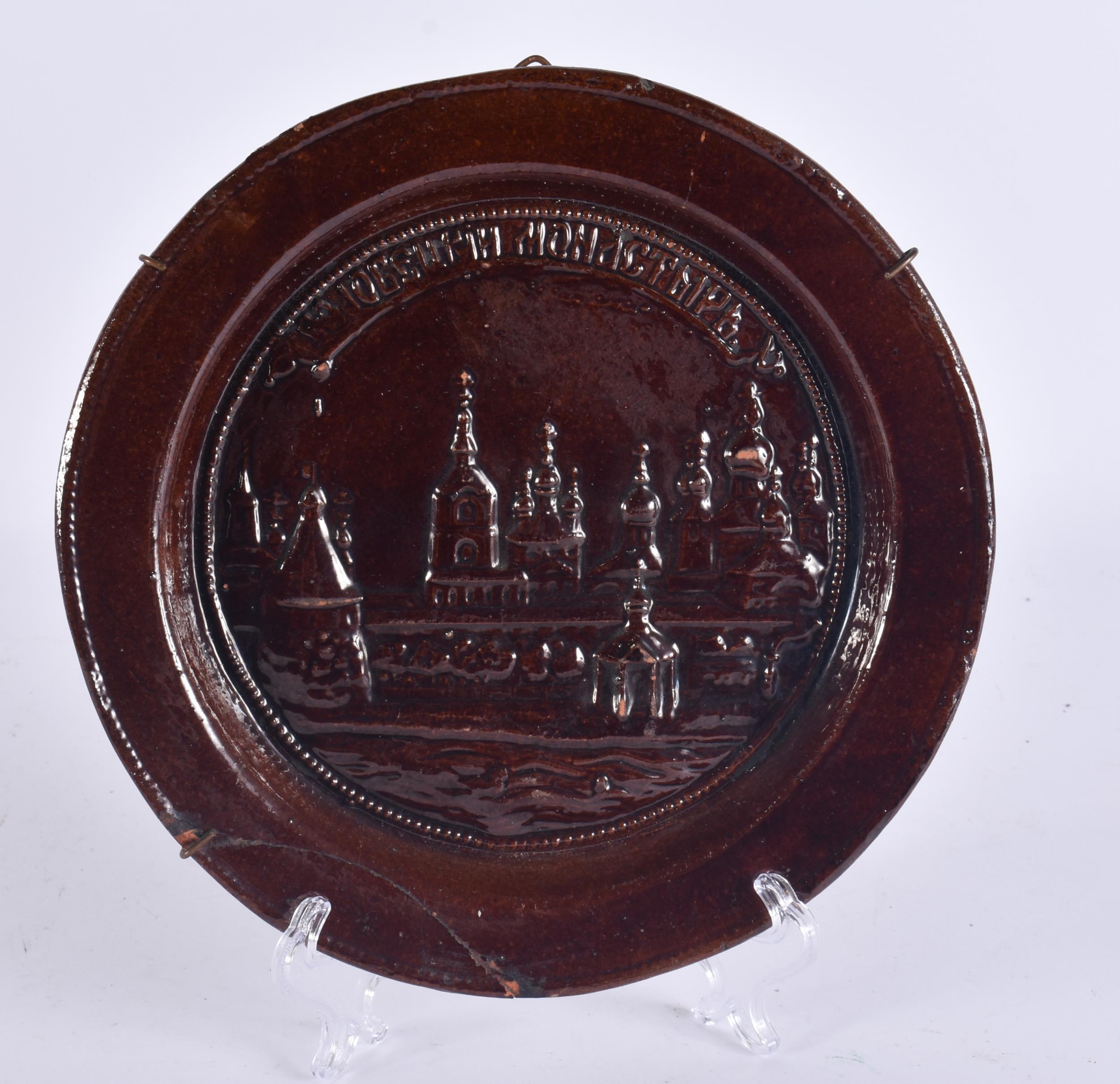 AN EXTREMELY RARE ANTIQUE RUSSIAN TREACLE GLAZED POTTERY PLATE. 21.5 cm wide.