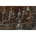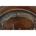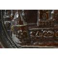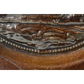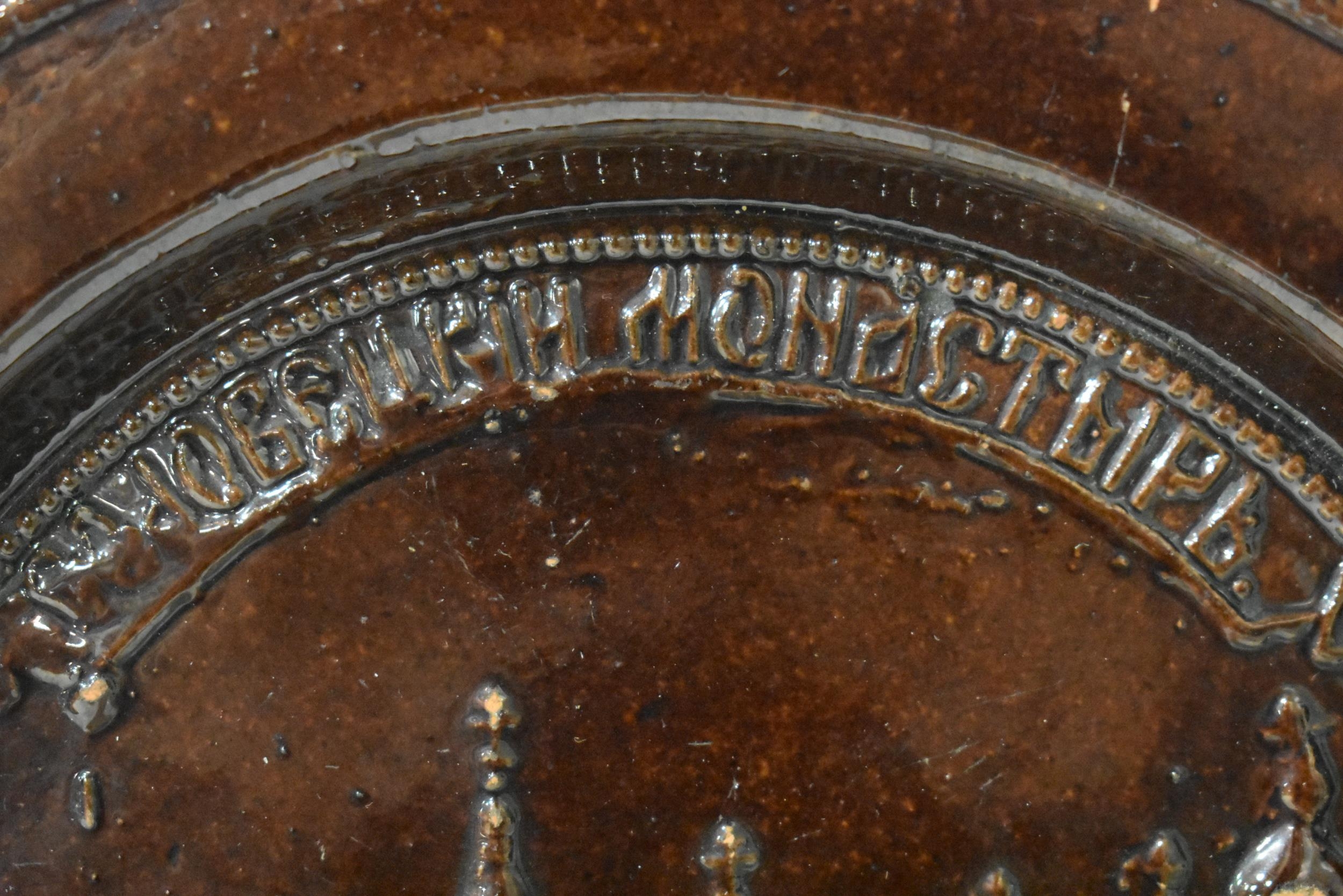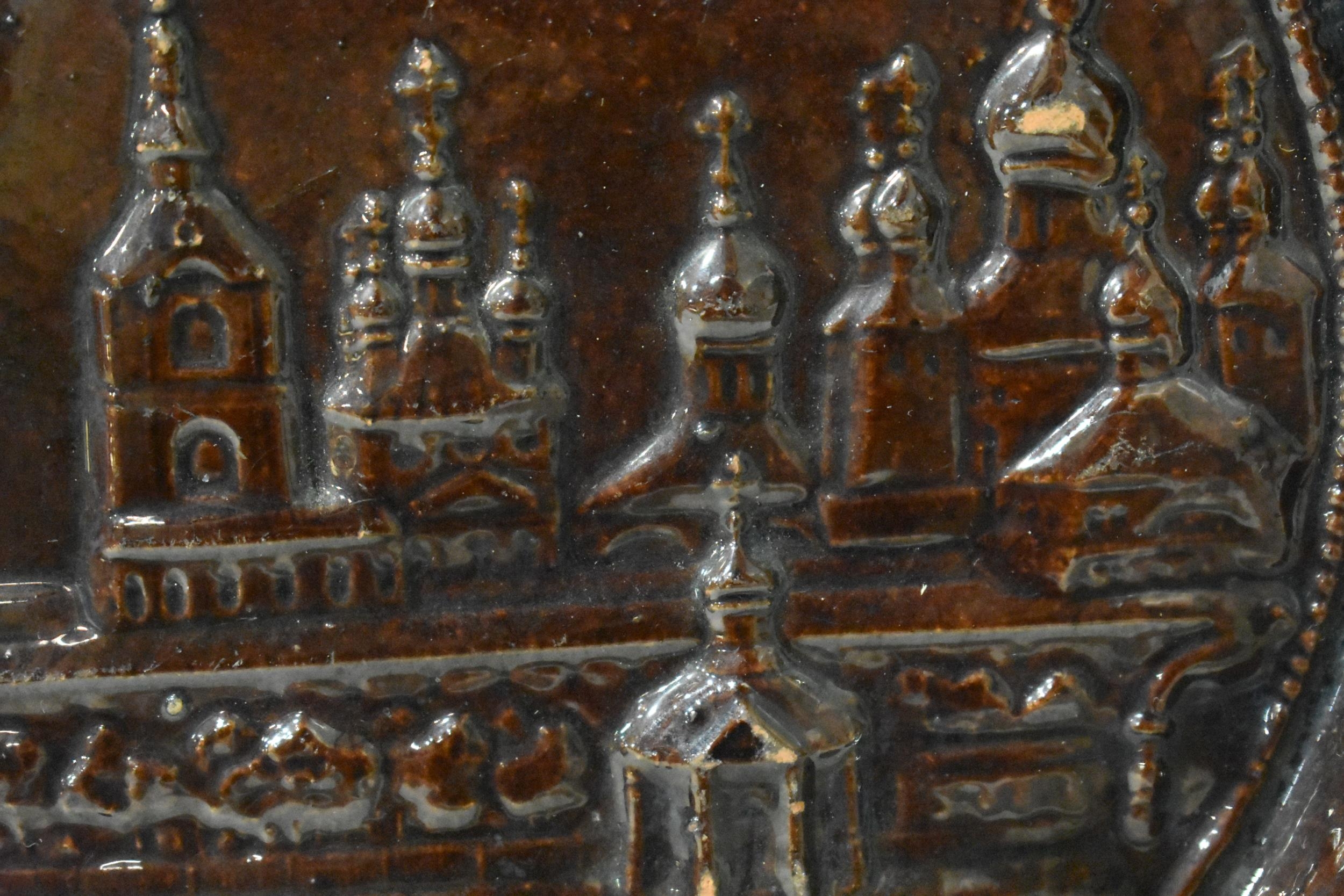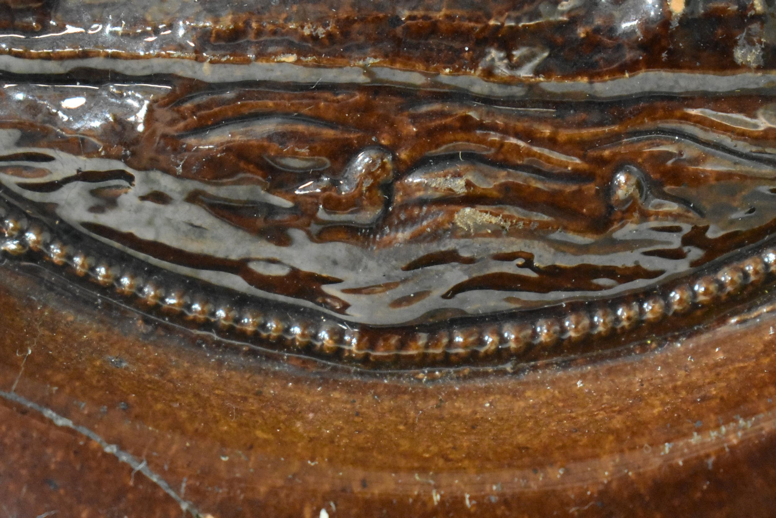 AN EXTREMELY RARE ANTIQUE RUSSIAN TREACLE GLAZED POTTERY PLATE. 21.5 cm wide.