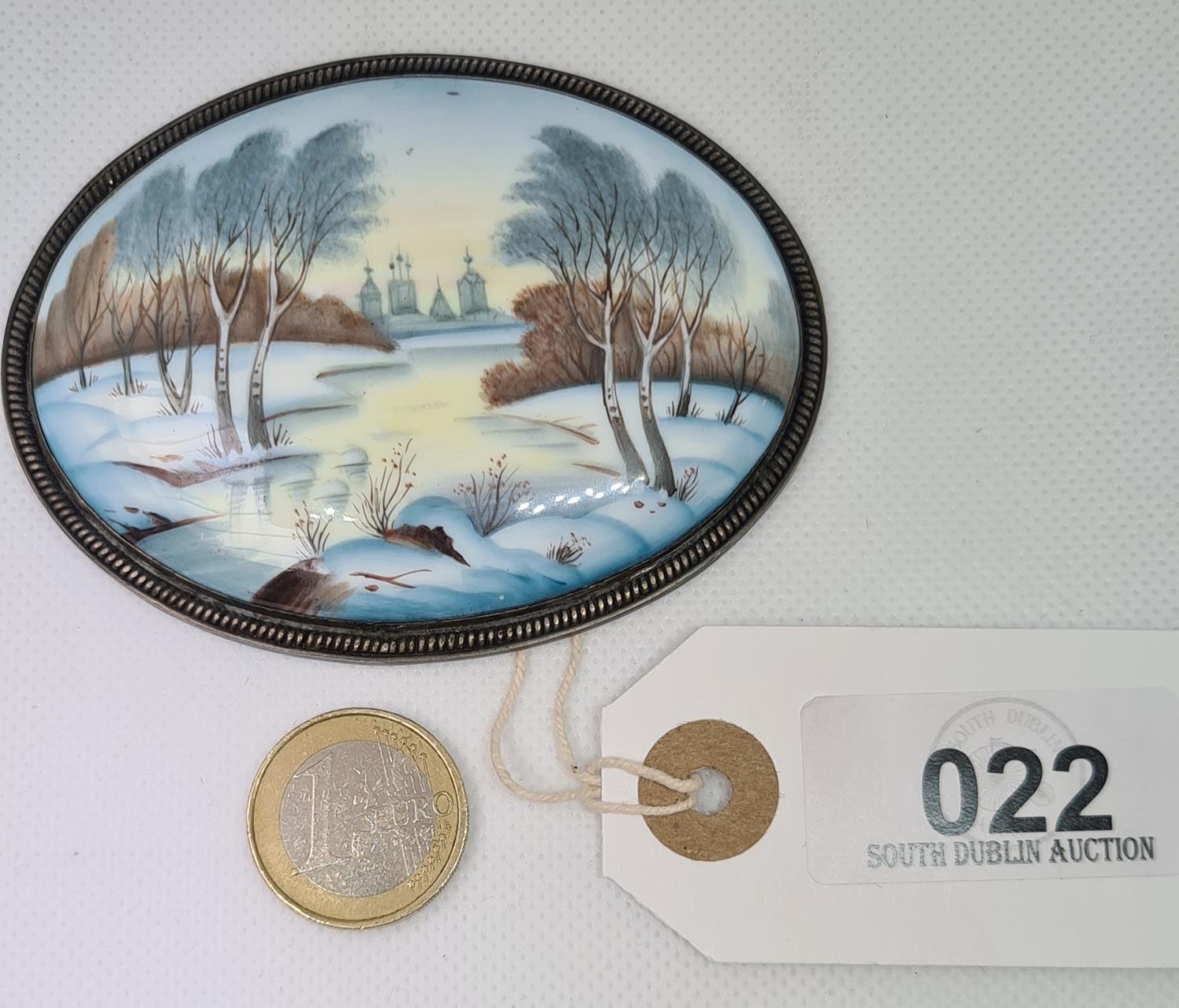 Super Russian hand painted enamel winter scene.