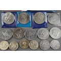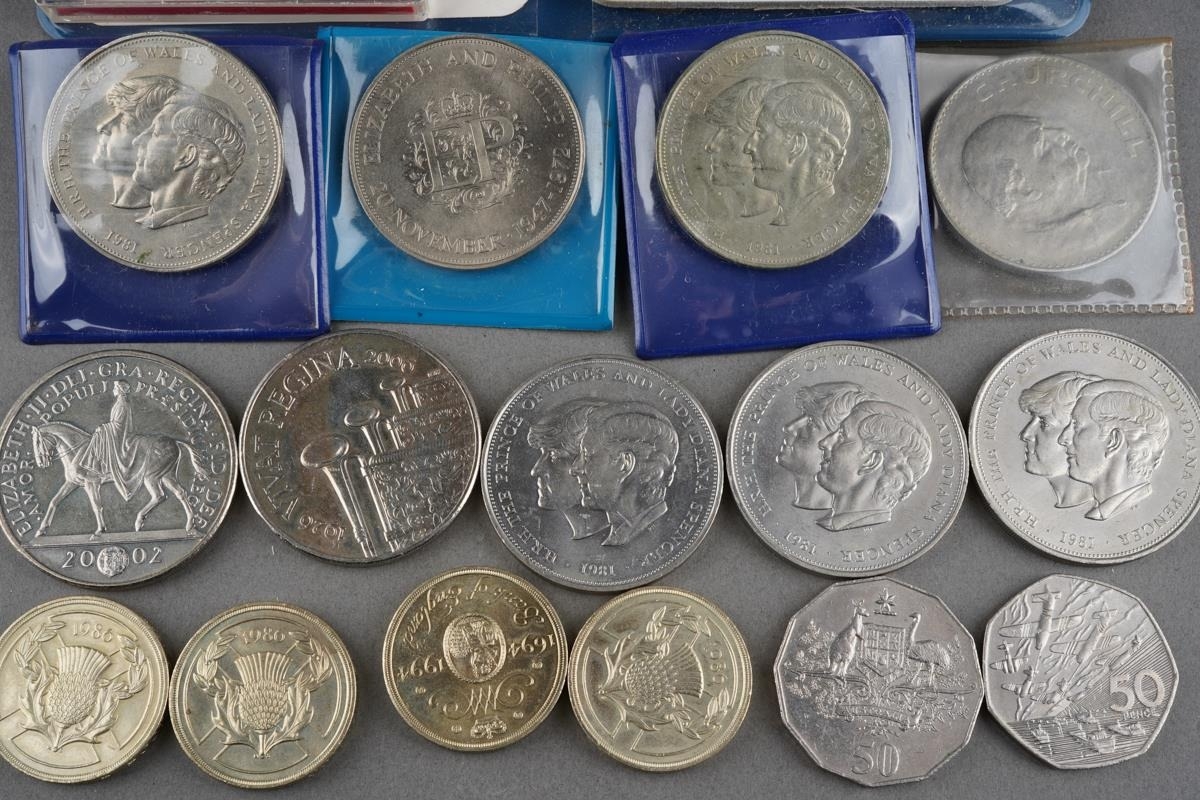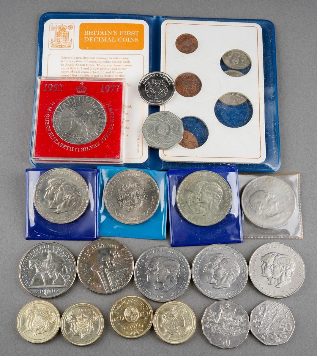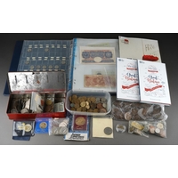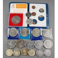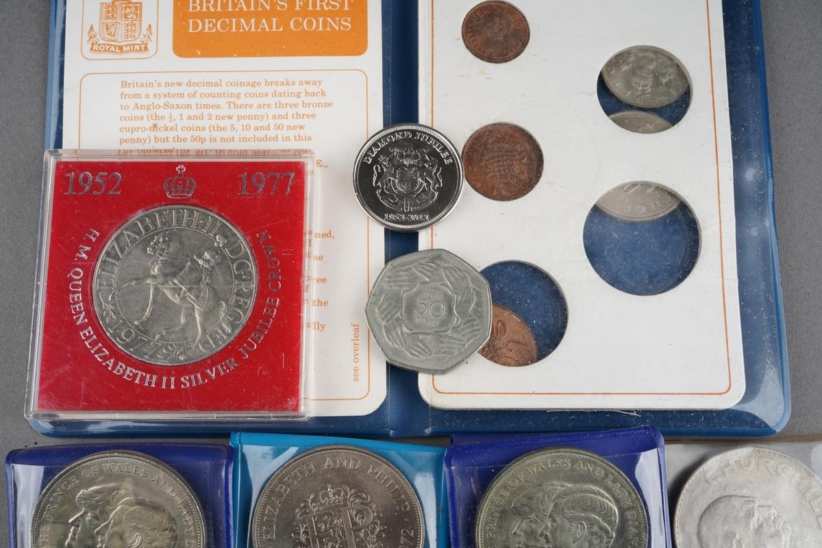 A collection of coins to include Britain's first decimal coin set, crowns, Churchill, commemorative etc. ( 1 bag)