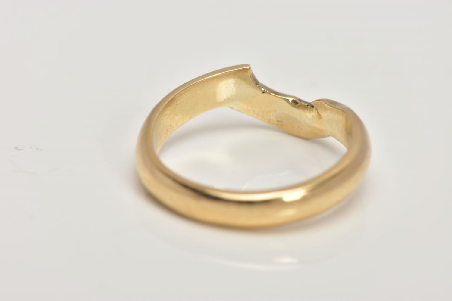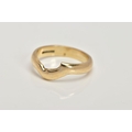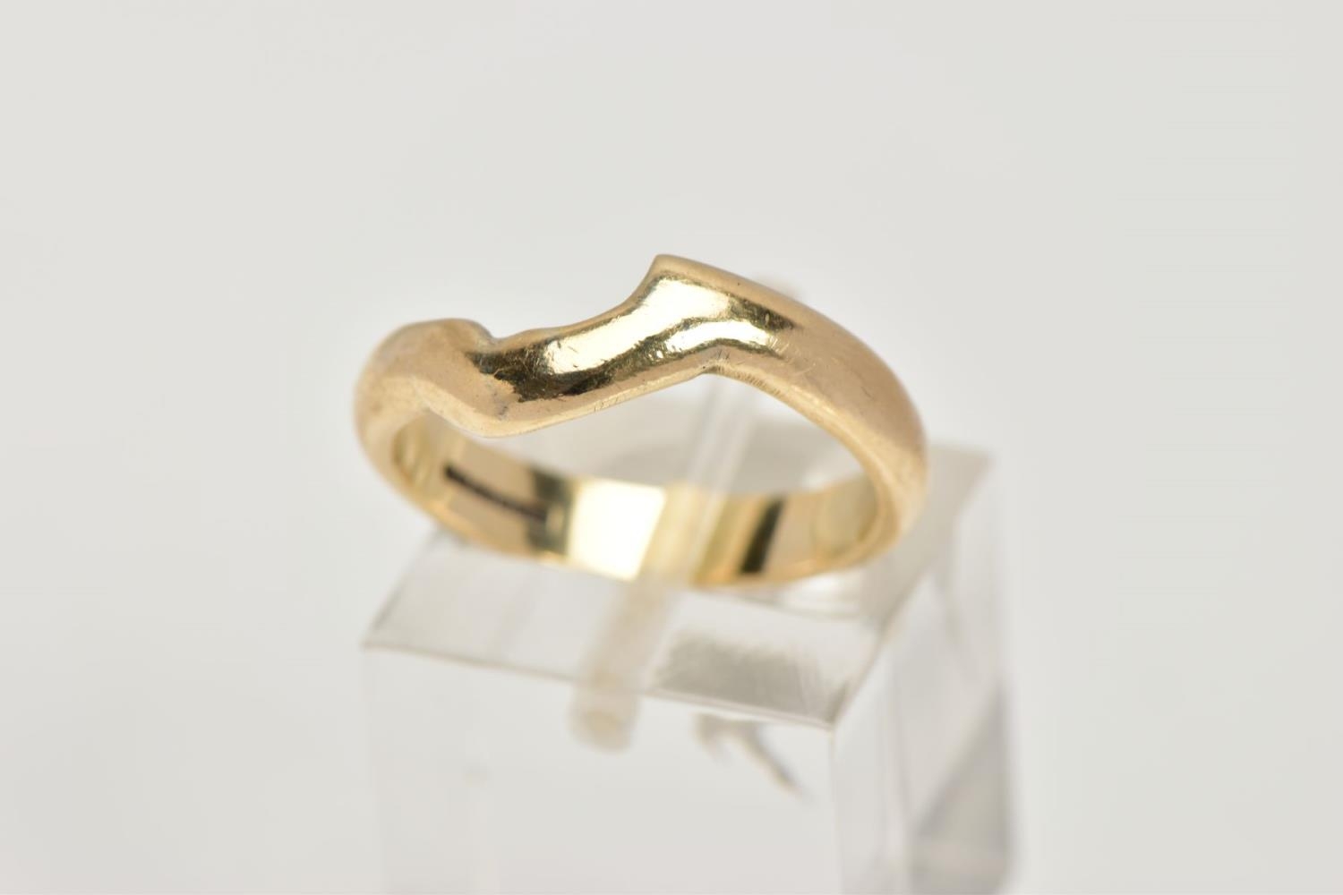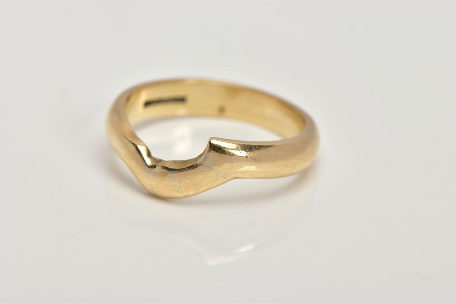 A 9CT GOLD MISSHAPEN BAND, plain polished band, misshapen in one place as if adjusted to fit under another ring, hallmarked 9ct gold Birmingham, ring size N, approximate gross weight 3.6 grams (condition report: general light wear, surface marks and misshapen)