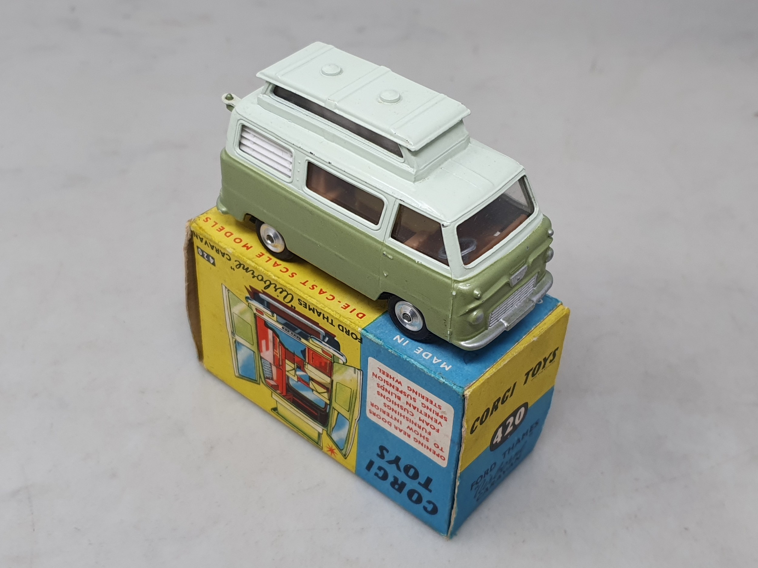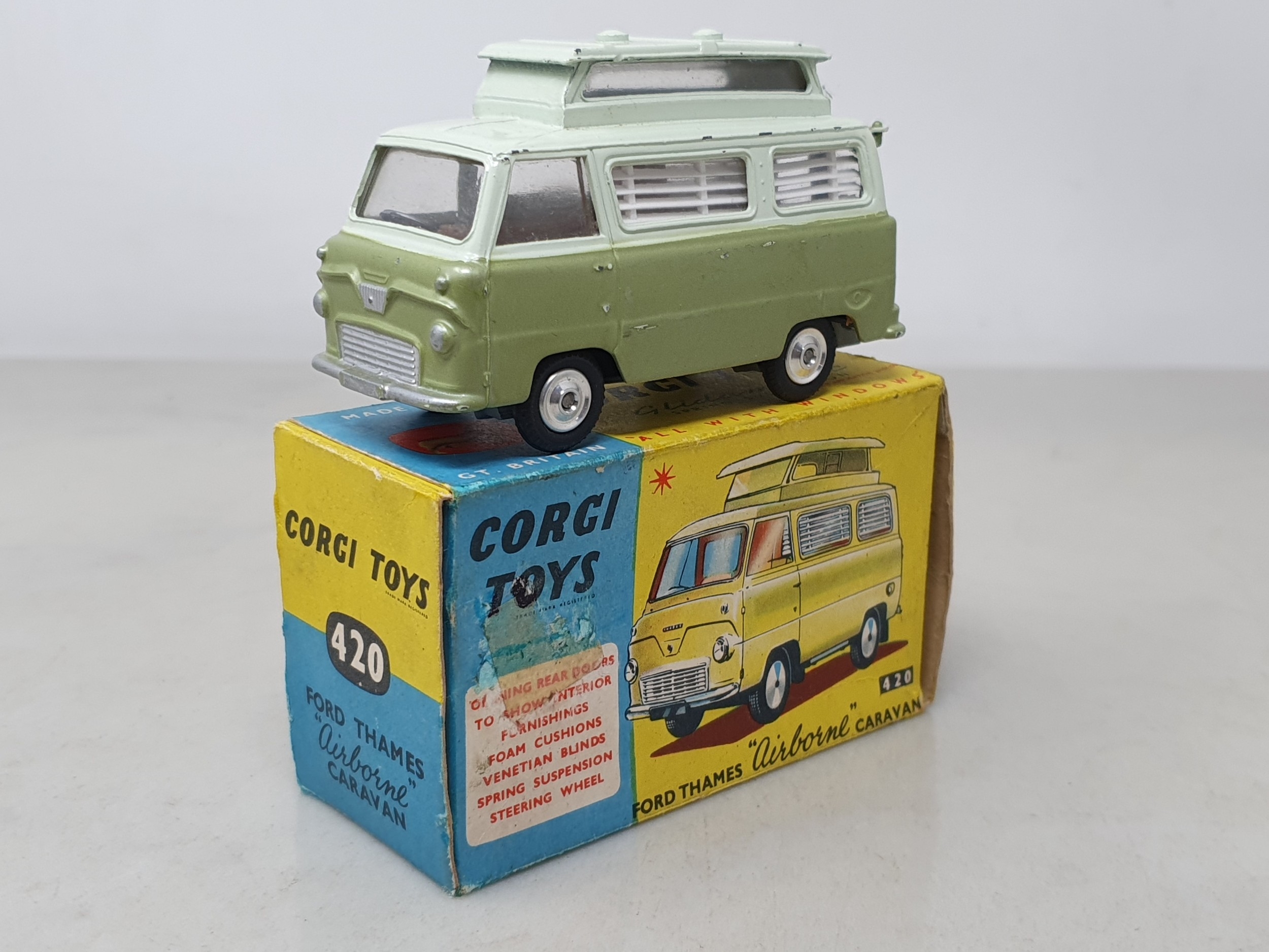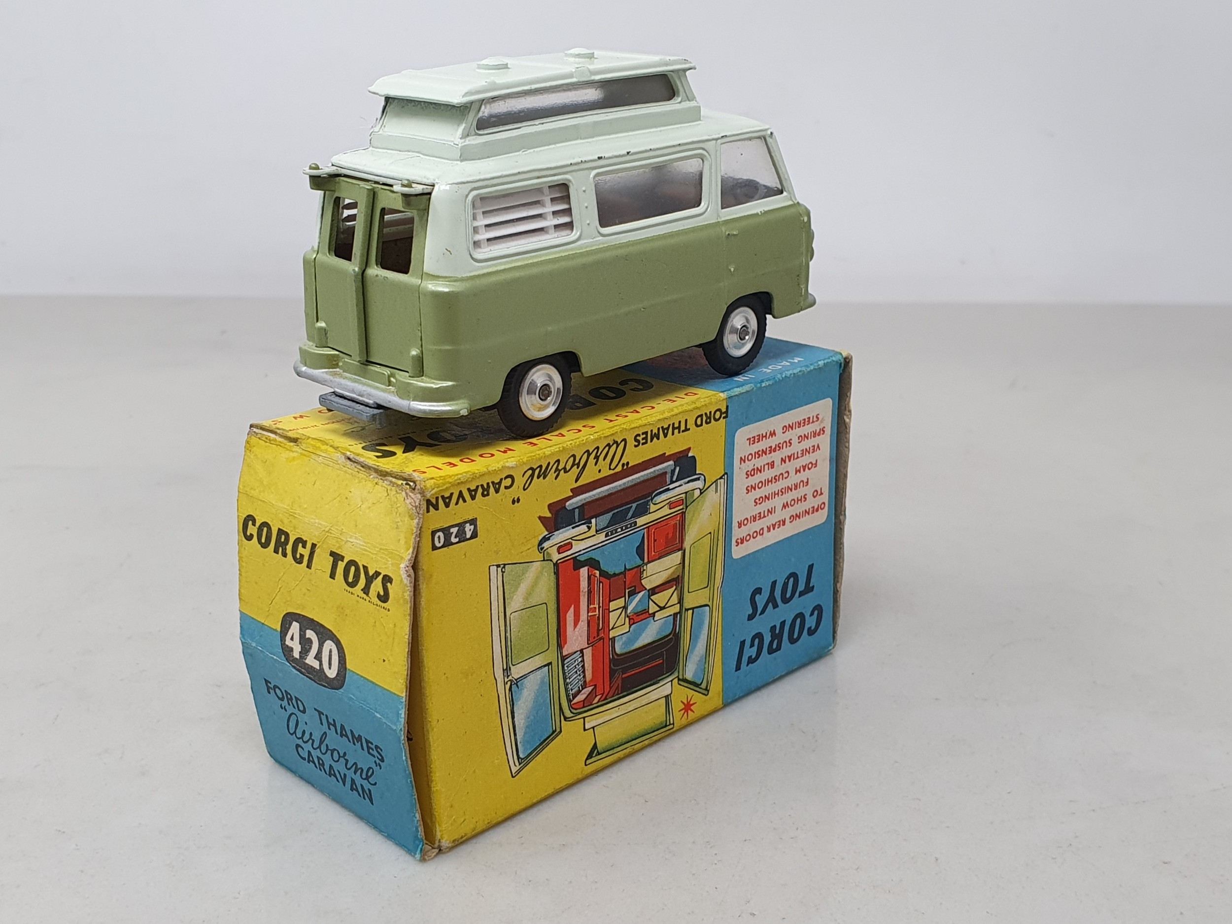 A boxed Corgi Toys No.420 metallic green and white Ford Thames 'Airborne' Caravan, Ex plus, box G