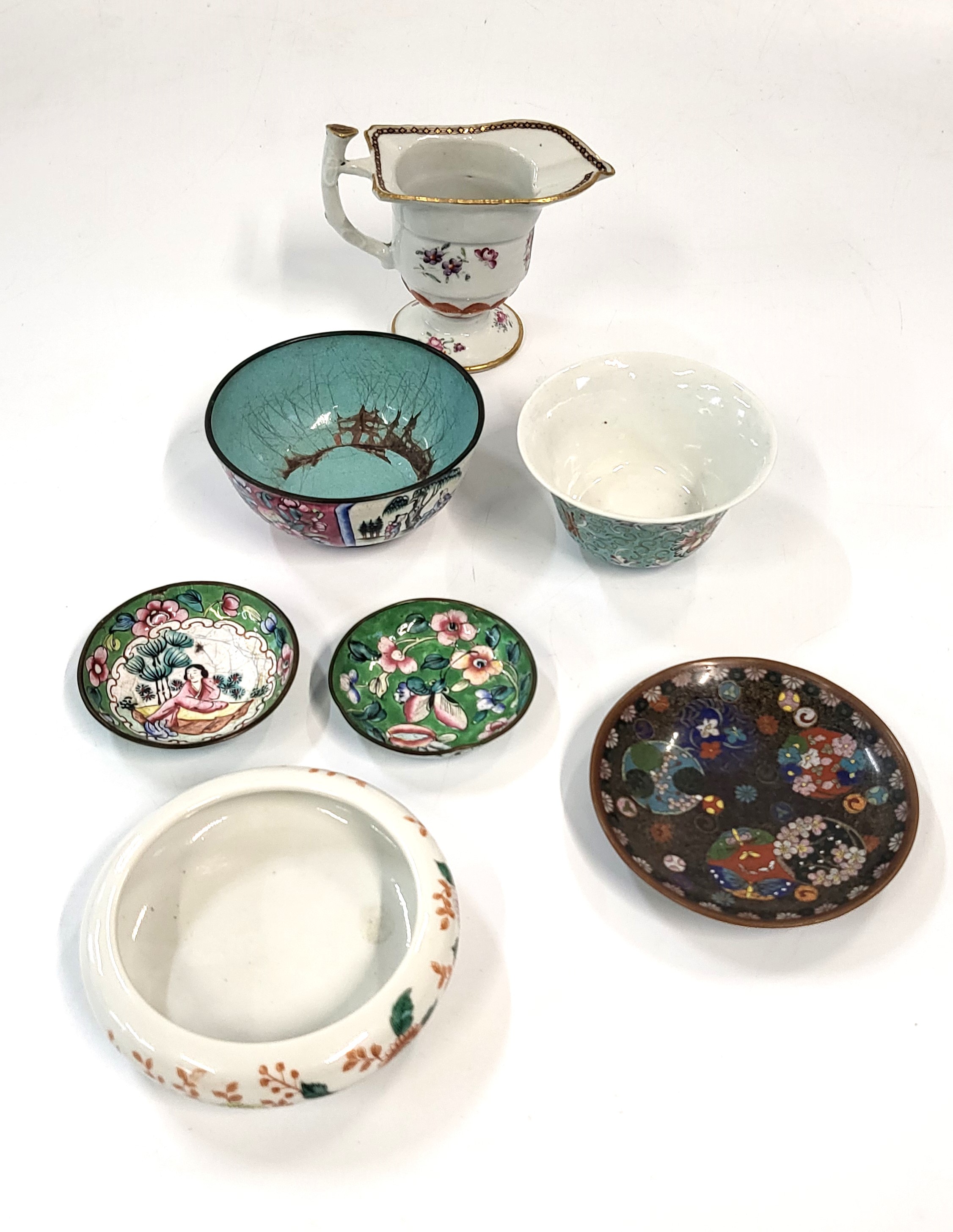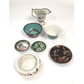 Seven items of Chinese porcelain and Cloisonne including plates, bowls and a jug.