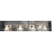 The larger open bowl has grazing/ cracking to the glaze. The matching two small bowls, some of the glazing underneath is chipped away.