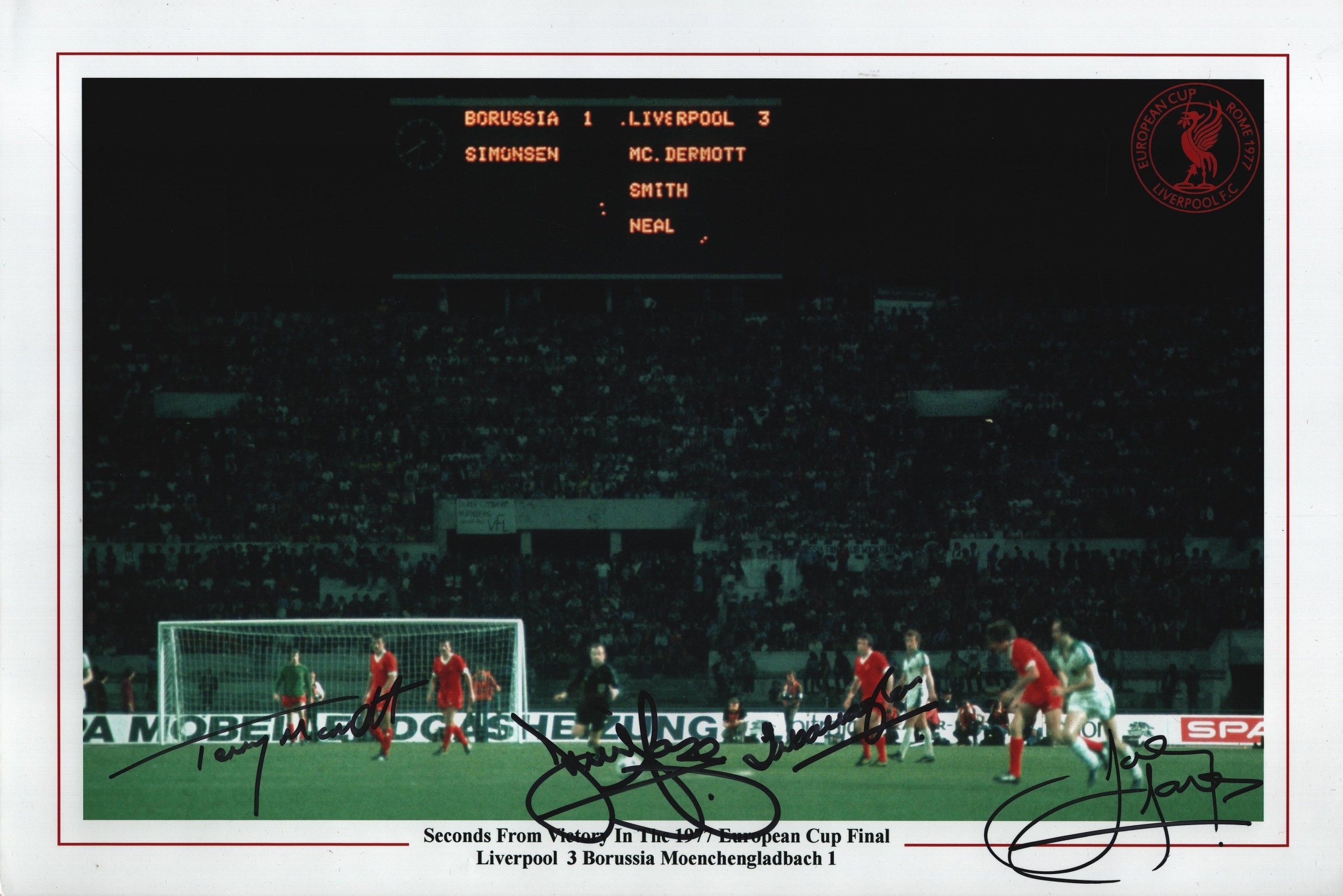 Terry McDermott, Jimmy Case, Ian Callaghan & Joey Jones multi signed 15x10 inch colour montage print. 'Seconds From Victory In The 1977 / European Cup Final Liverpool 3 Borussia Moenchengladbach 1'.