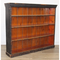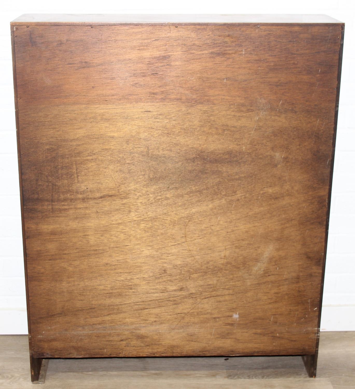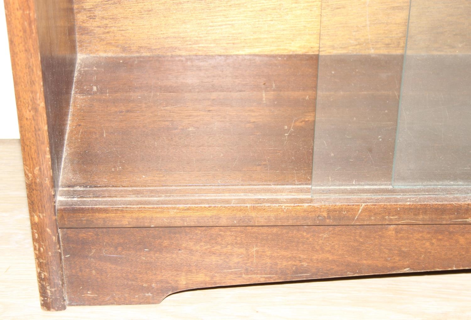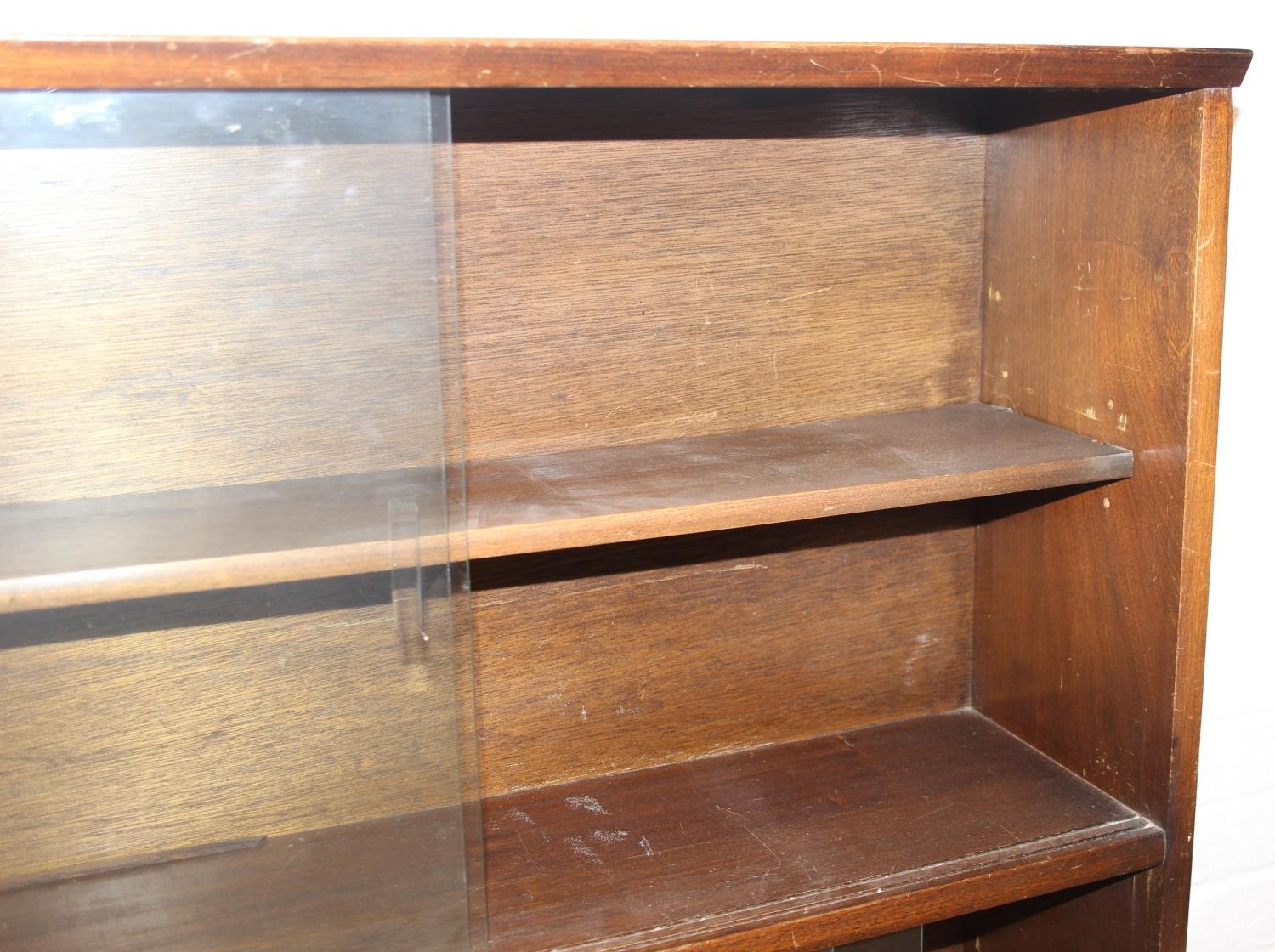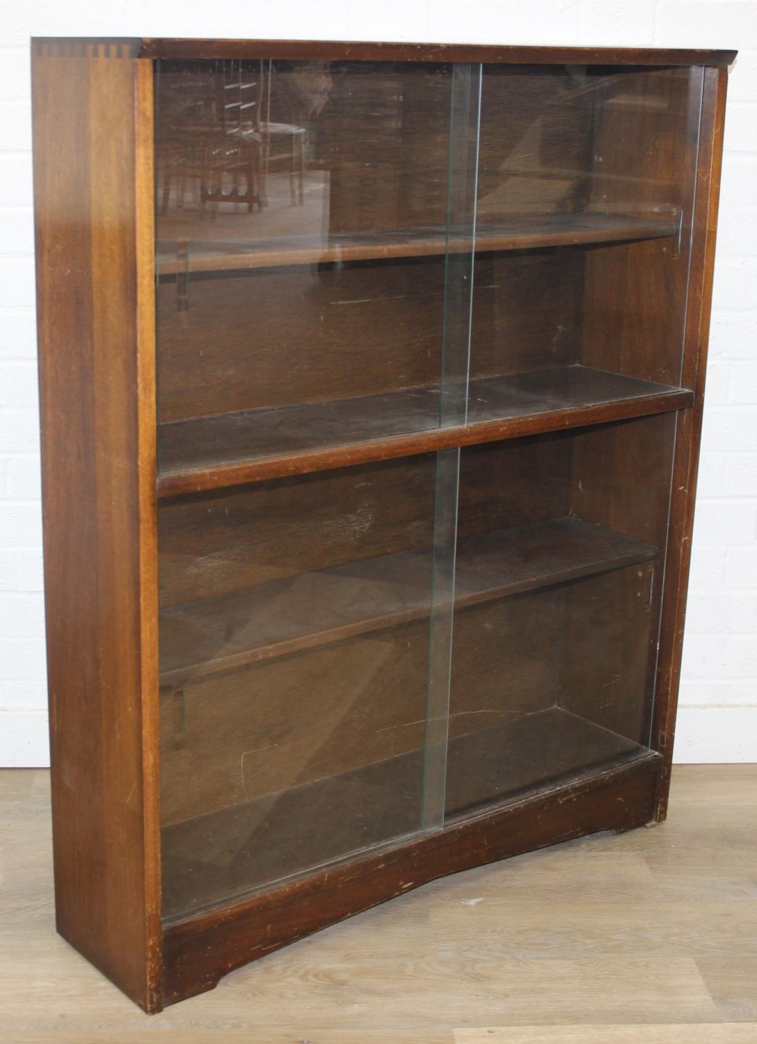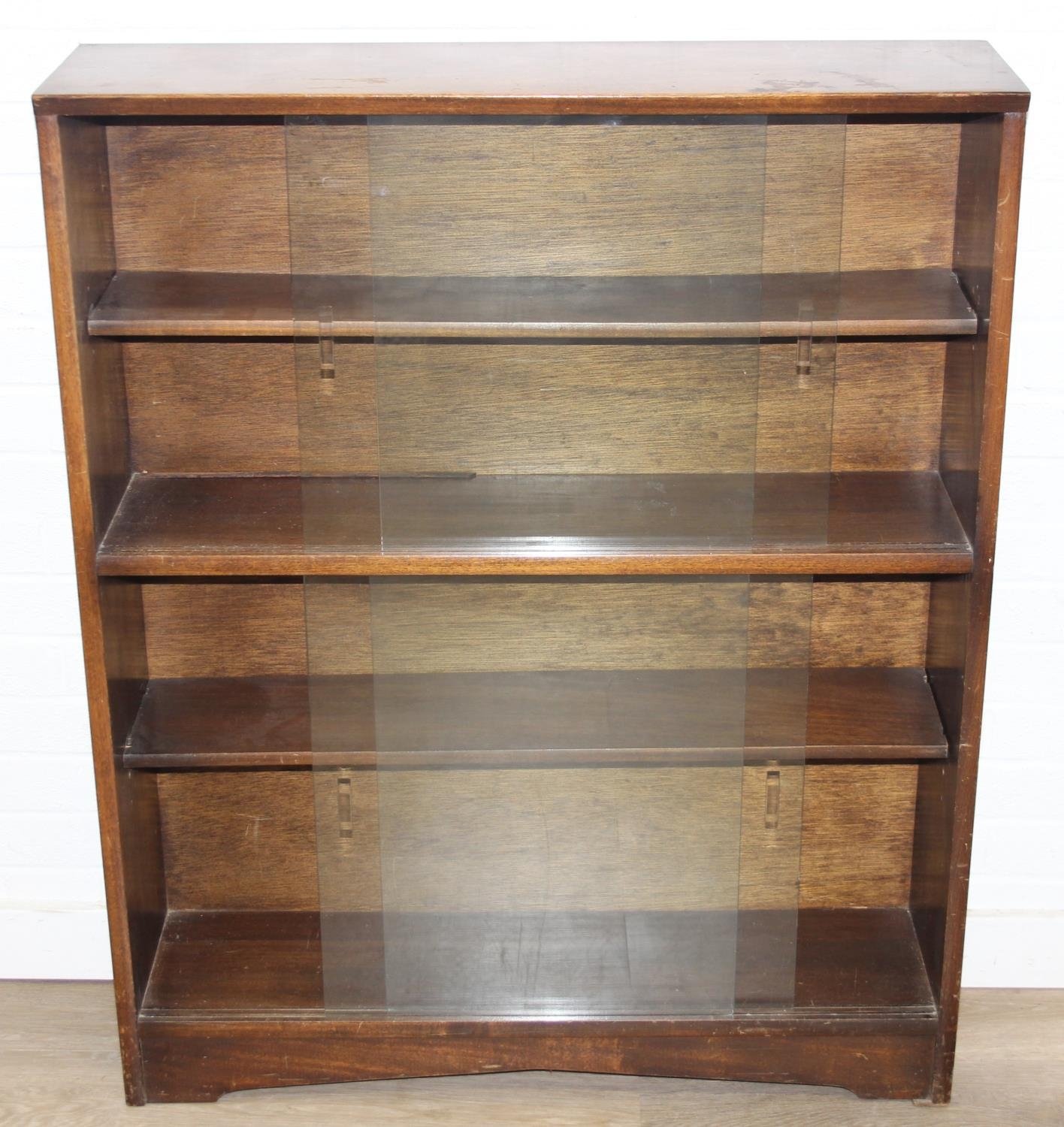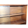 Mid-20th century oak bookcase with two sets of glass sliding doors, 91cm x 25cm x 113cm