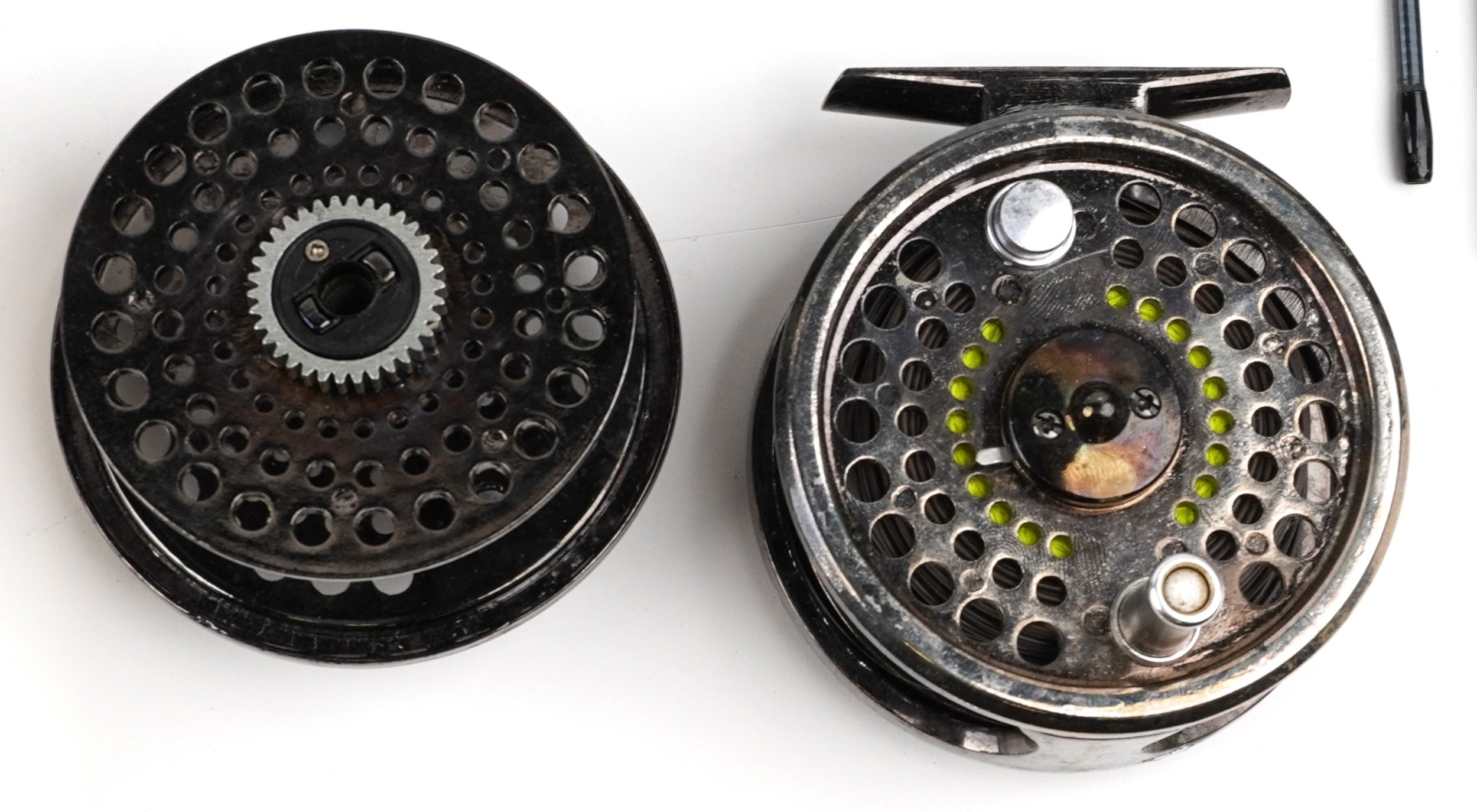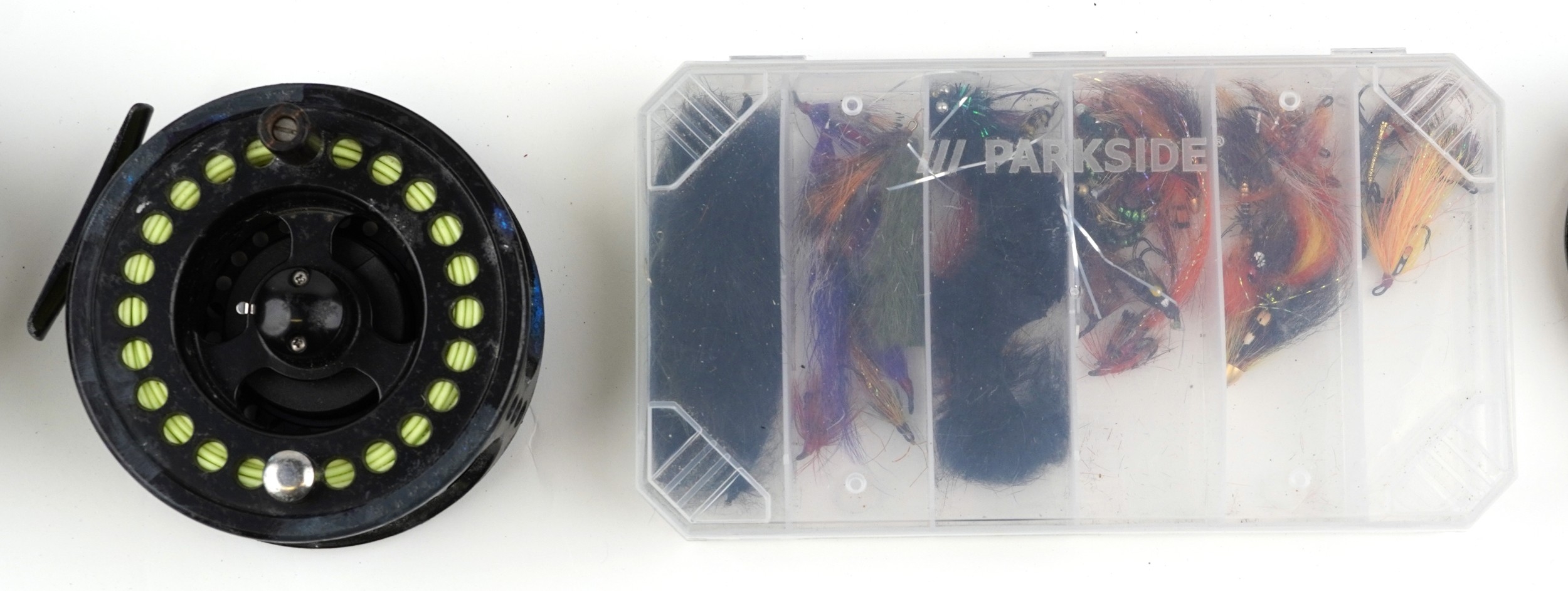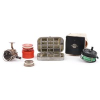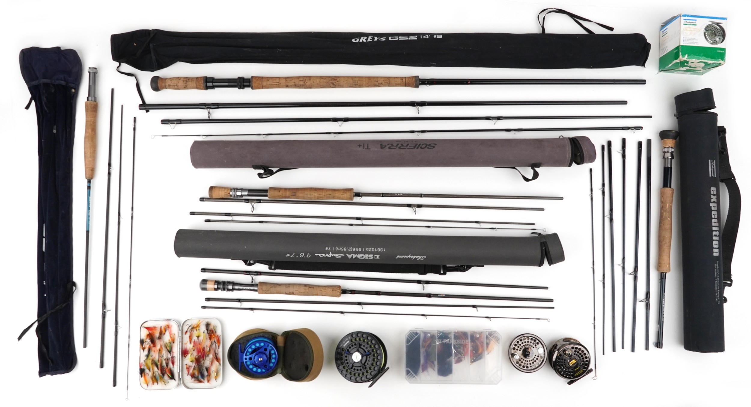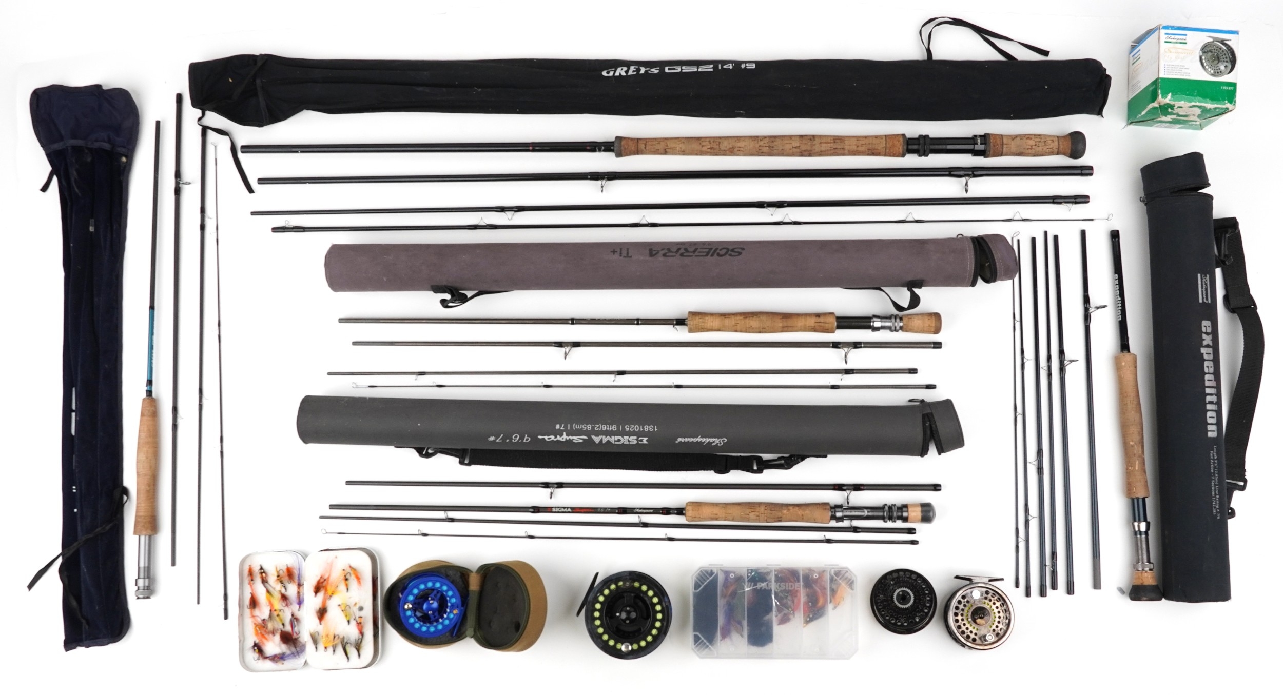 Vintage and later salmon fly fishing rods, reels and accessories including a tin of flies, Okuma 10/11 salmon reel, Shakespeare 3+4 trout reel, Shakespeare Expedition trout rod and Greys salmon rod.