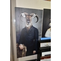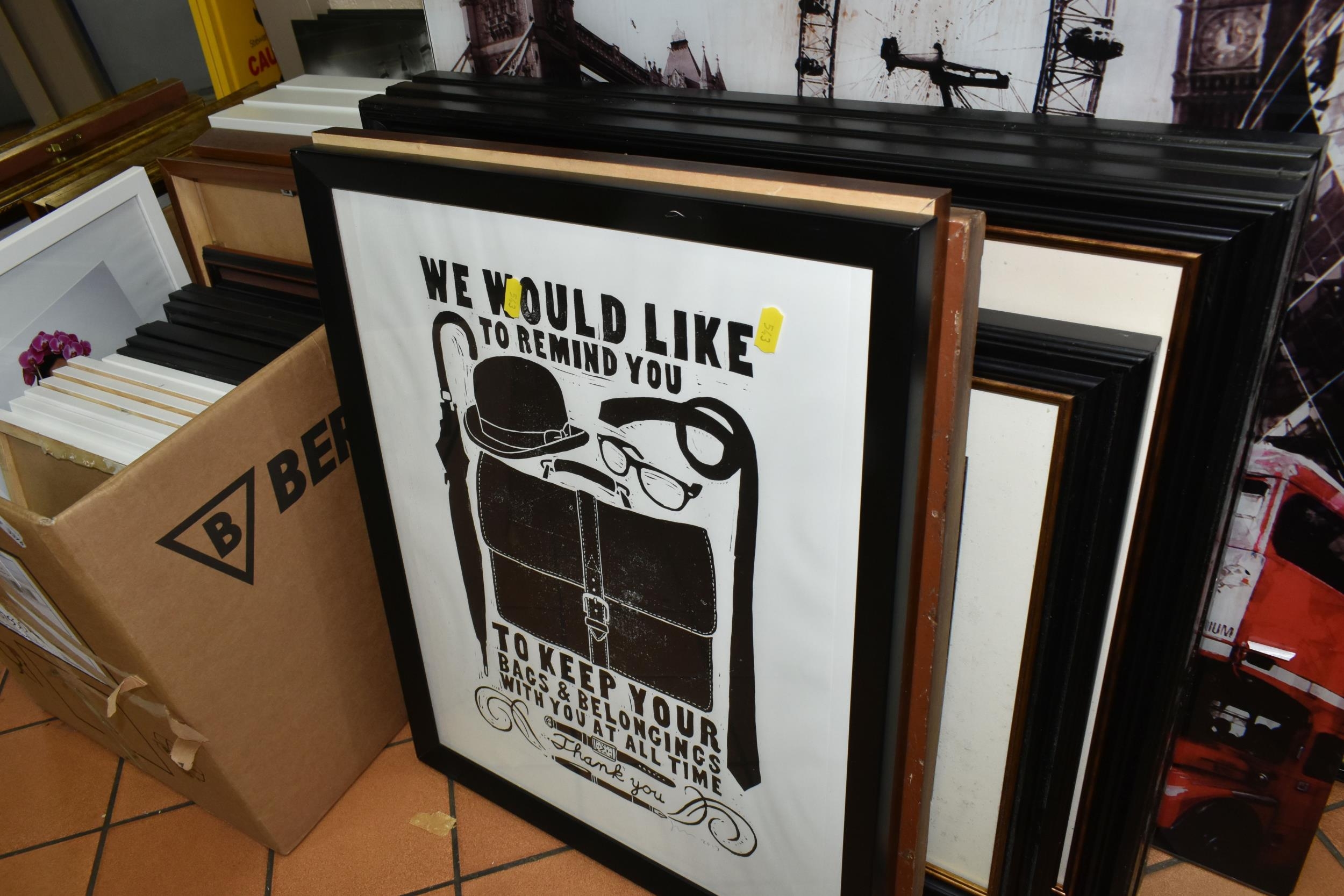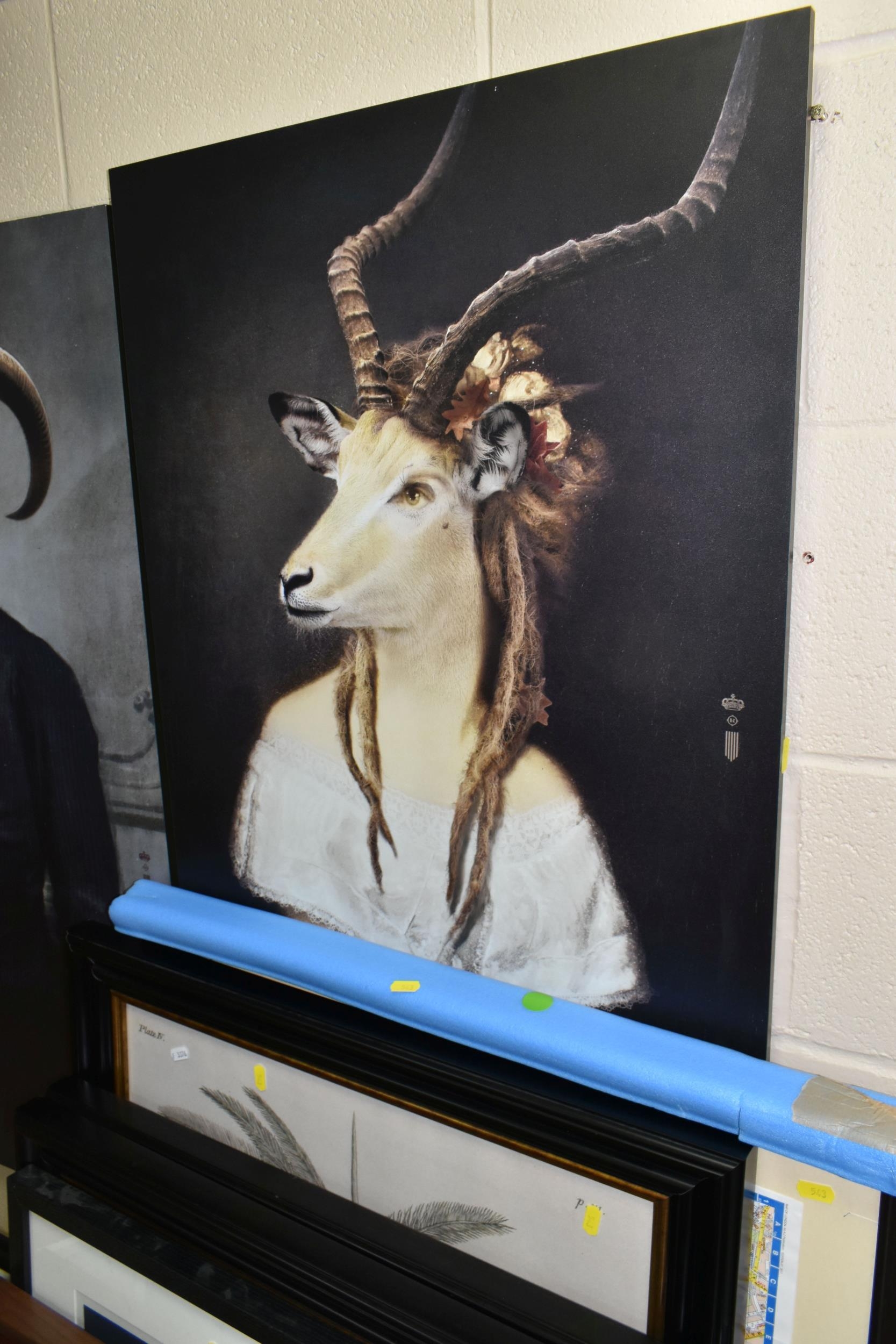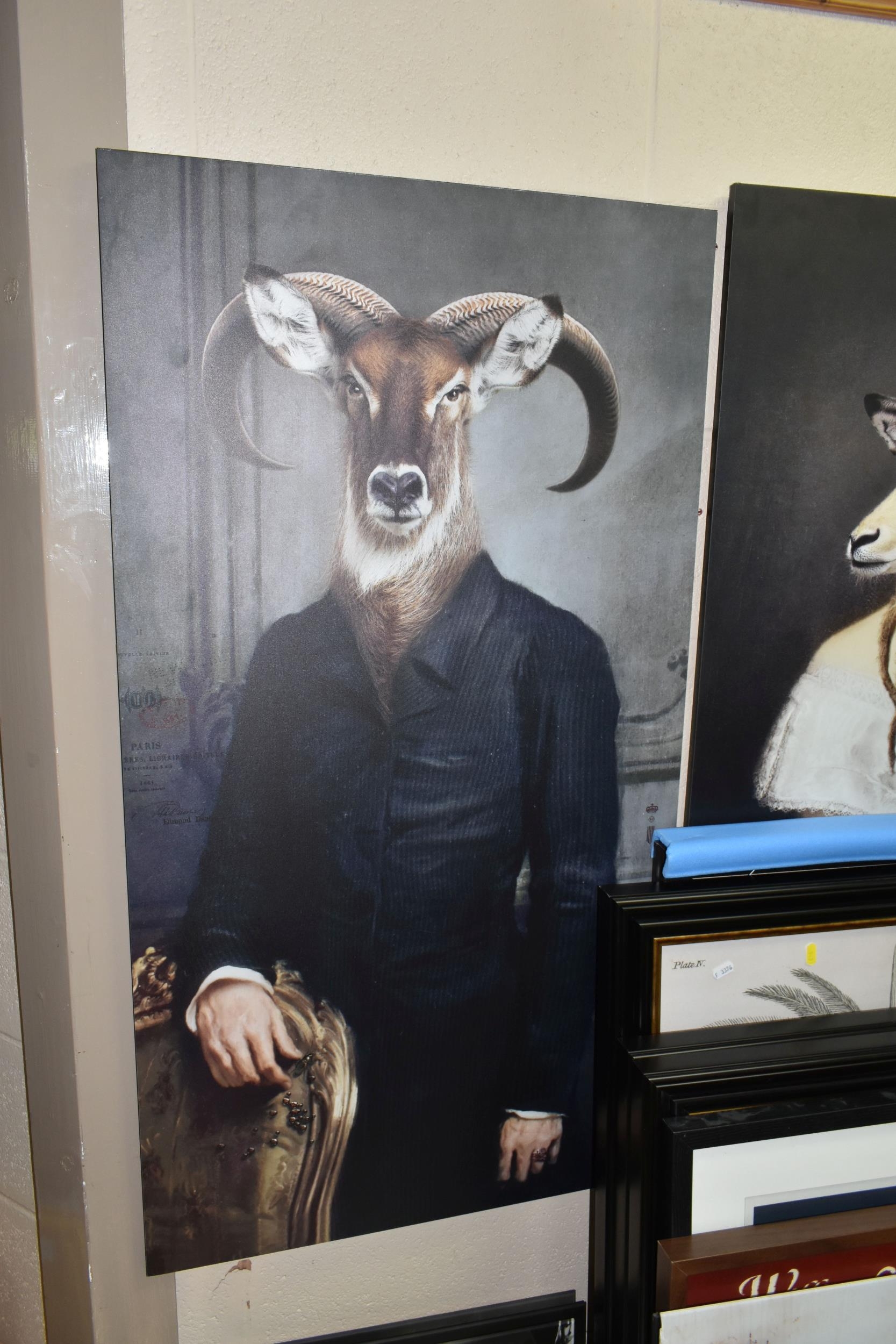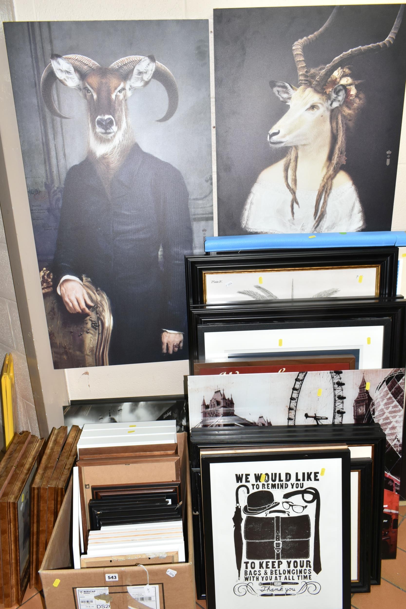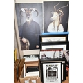 A QUANTITY OF DECORATIVE PICTURES AND PRINTS ETC, to include two prints on board depicting a goat and an antelope wearing clothes, approximate sizes 112cm x 60cm, reproduction prints of views in India, a signed James Brown 'Bags' linocut print, a Bold & Noble British Isles map, three Jurek Nems glass wall prints depicting views of London, two un-named glass wall prints depicting views of London, Tim Walker photographic fashion prints, Alice in Wonderland prints, prints of John Cleese and Jeremy Brett, four reproduction prints of Chinese figures etc