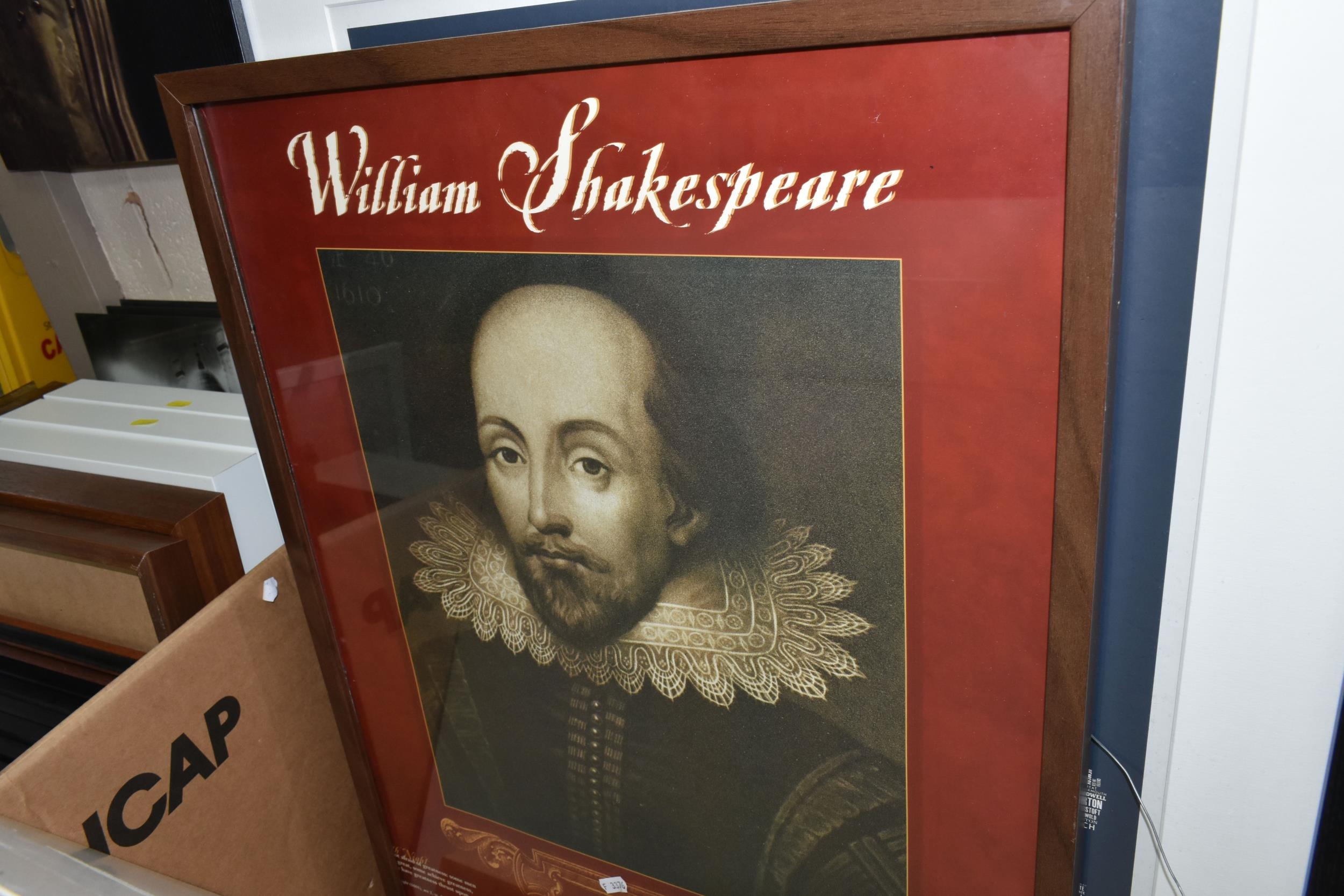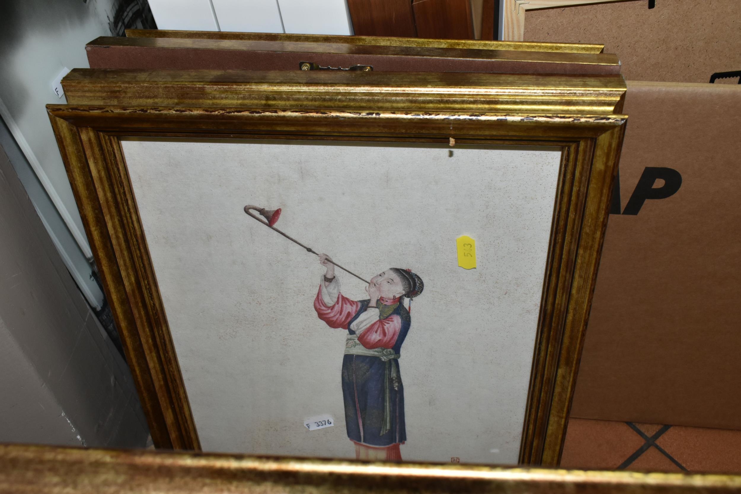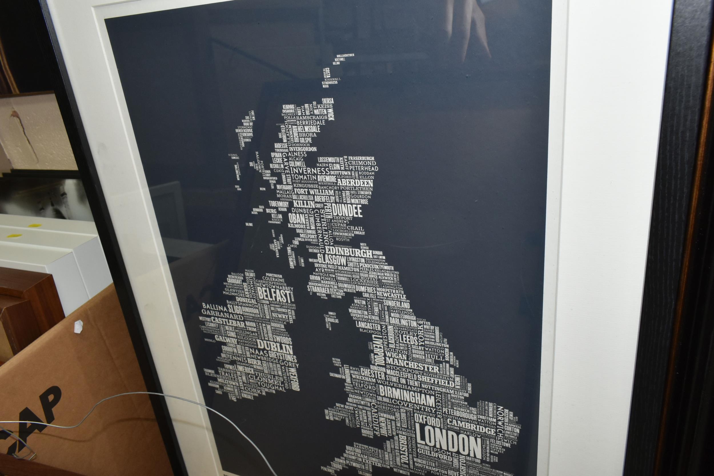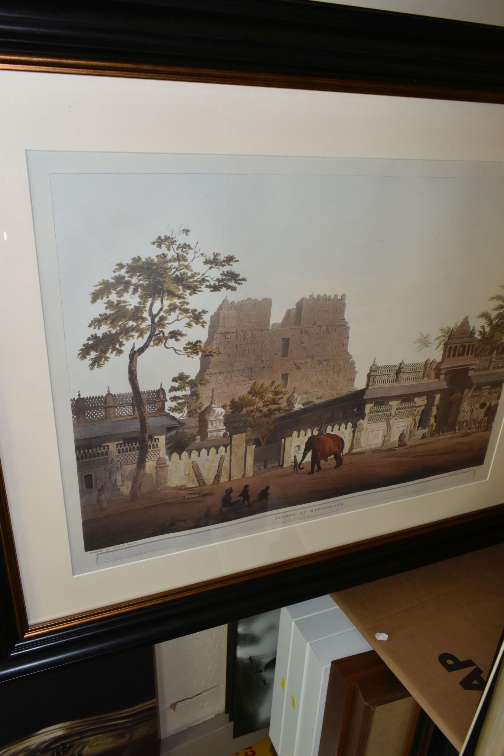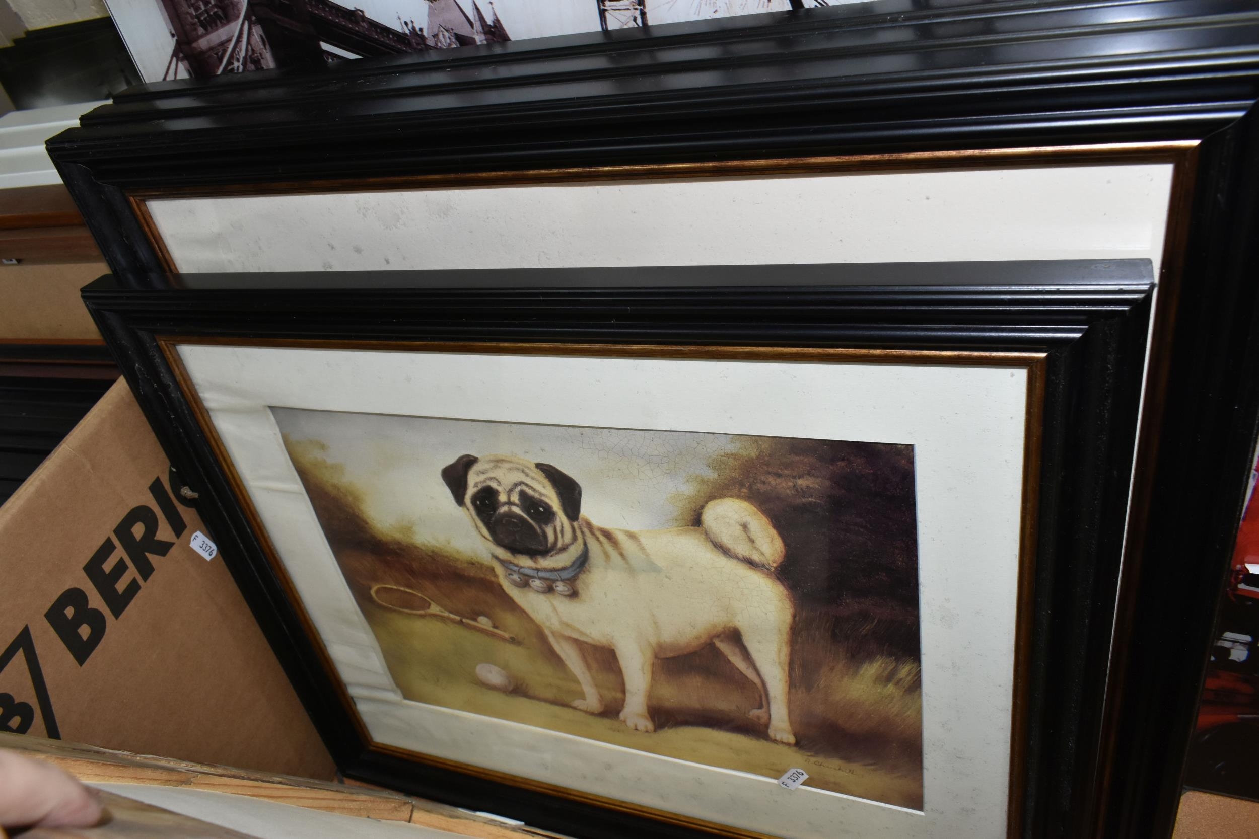 A QUANTITY OF DECORATIVE PICTURES AND PRINTS ETC, to include two prints on board depicting a goat and an antelope wearing clothes, approximate sizes 112cm x 60cm, reproduction prints of views in India, a signed James Brown 'Bags' linocut print, a Bold & Noble British Isles map, three Jurek Nems glass wall prints depicting views of London, two un-named glass wall prints depicting views of London, Tim Walker photographic fashion prints, Alice in Wonderland prints, prints of John Cleese and Jeremy Brett, four reproduction prints of Chinese figures etc