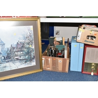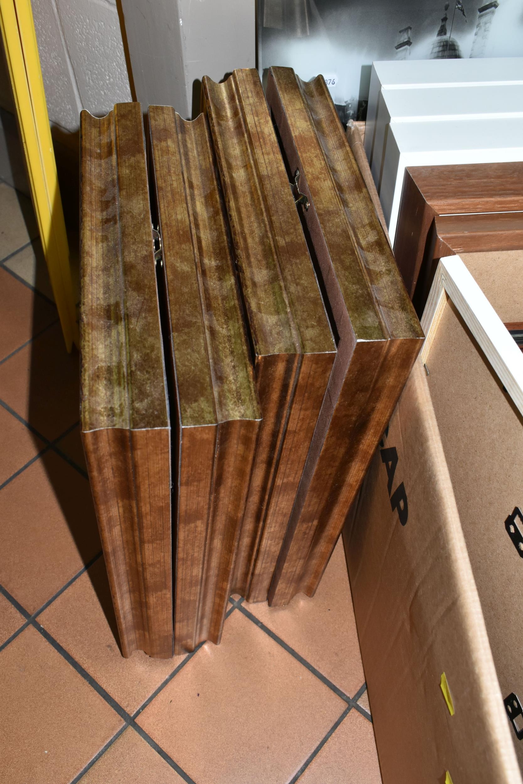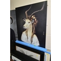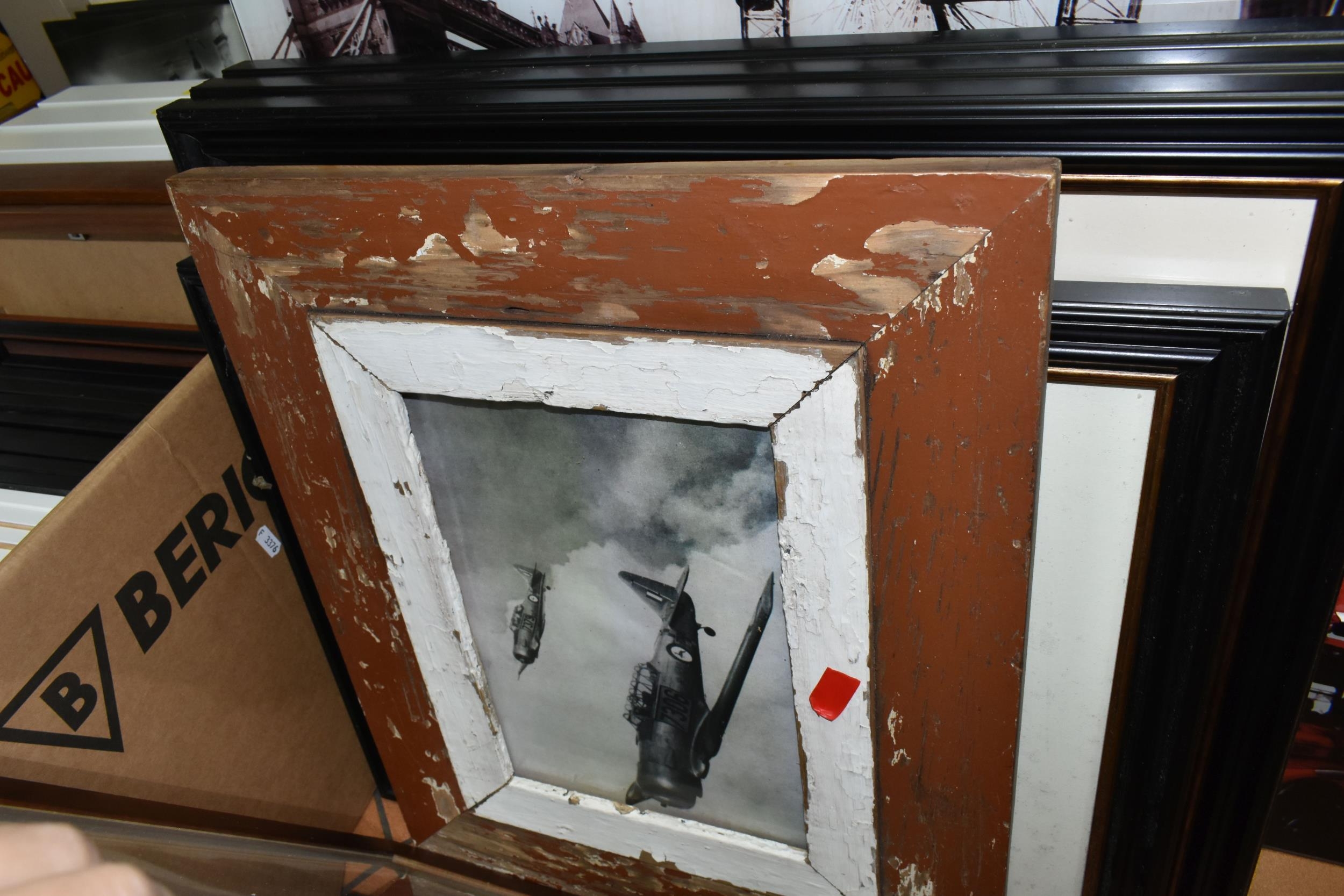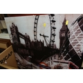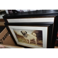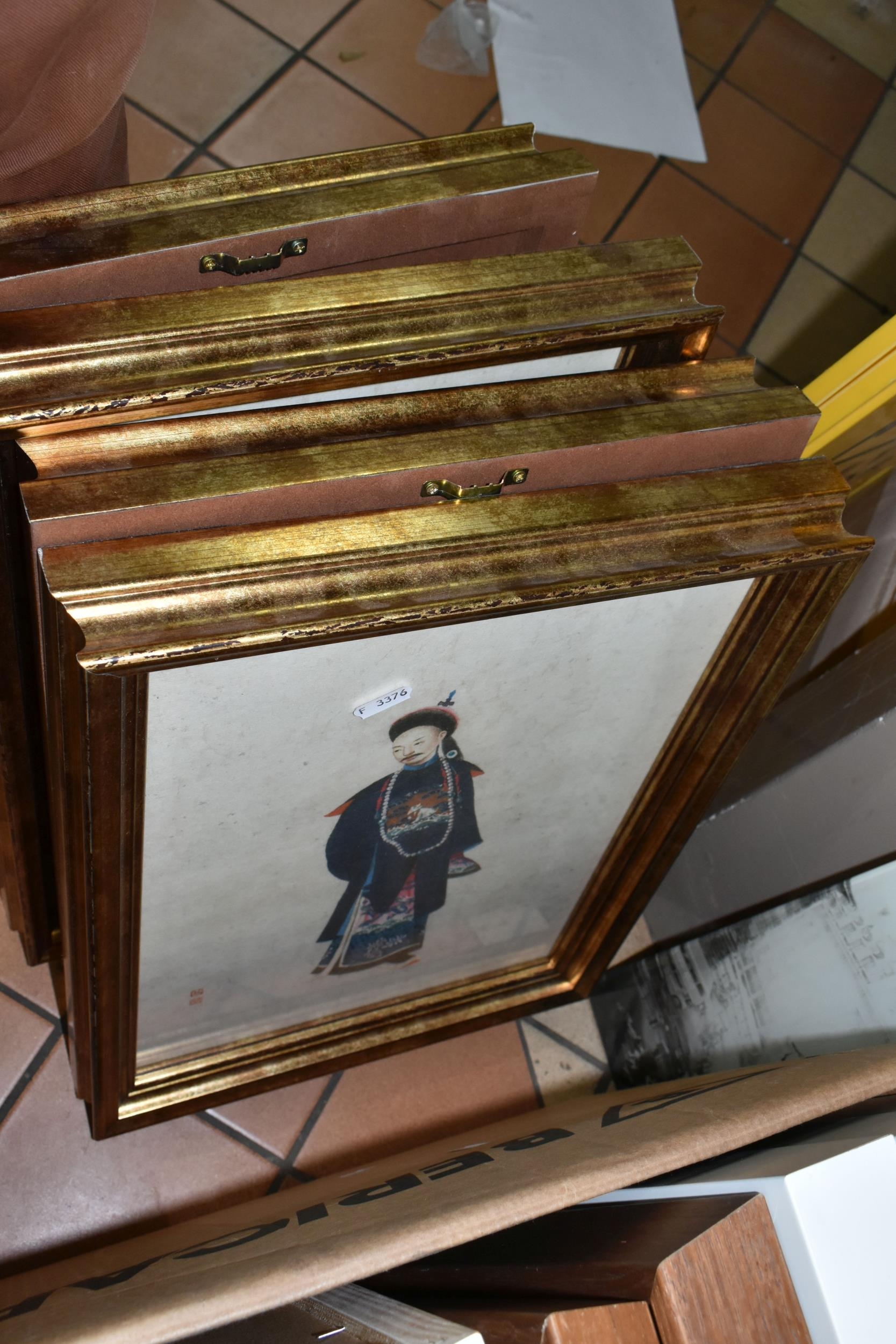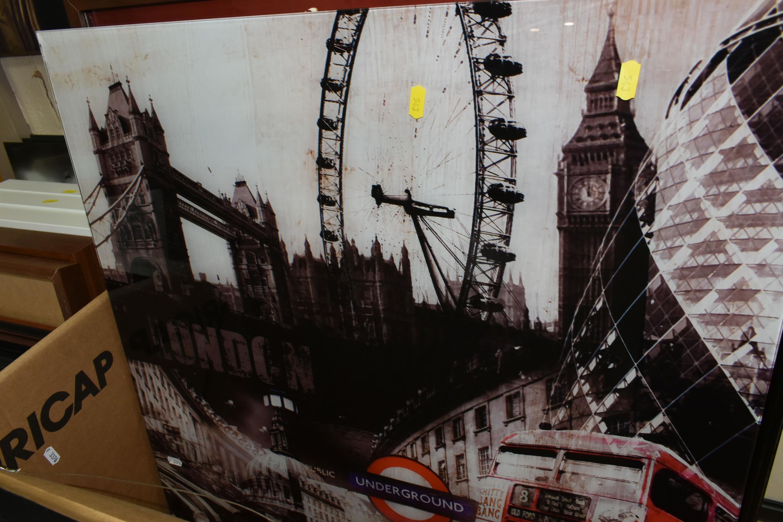 A QUANTITY OF DECORATIVE PICTURES AND PRINTS ETC, to include two prints on board depicting a goat and an antelope wearing clothes, approximate sizes 112cm x 60cm, reproduction prints of views in India, a signed James Brown 'Bags' linocut print, a Bold & Noble British Isles map, three Jurek Nems glass wall prints depicting views of London, two un-named glass wall prints depicting views of London, Tim Walker photographic fashion prints, Alice in Wonderland prints, prints of John Cleese and Jeremy Brett, four reproduction prints of Chinese figures etc