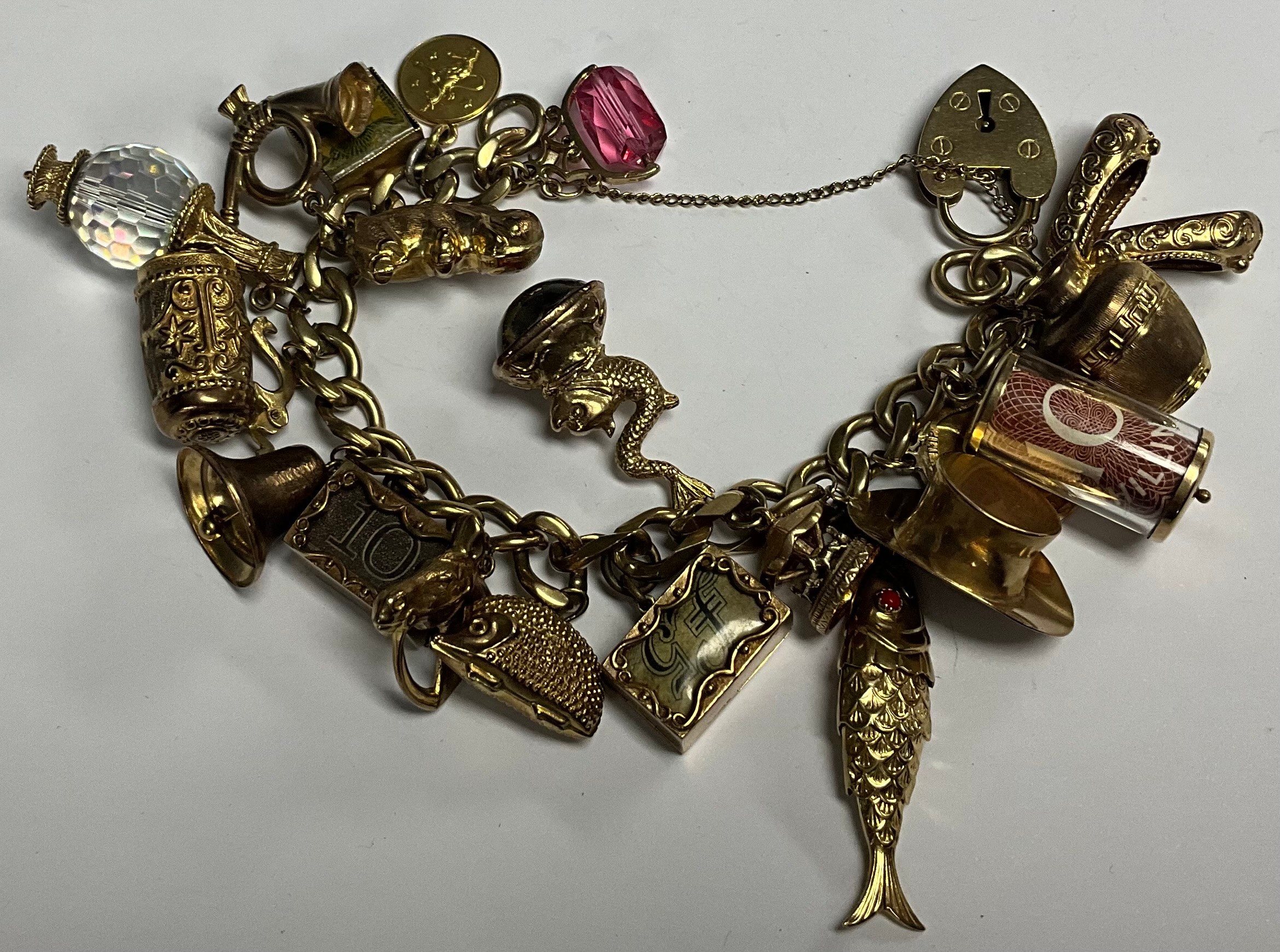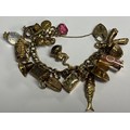 A 9ct gold charm bracelet, set with 20 charms and a half sovereign, 1902, 93.09g gross