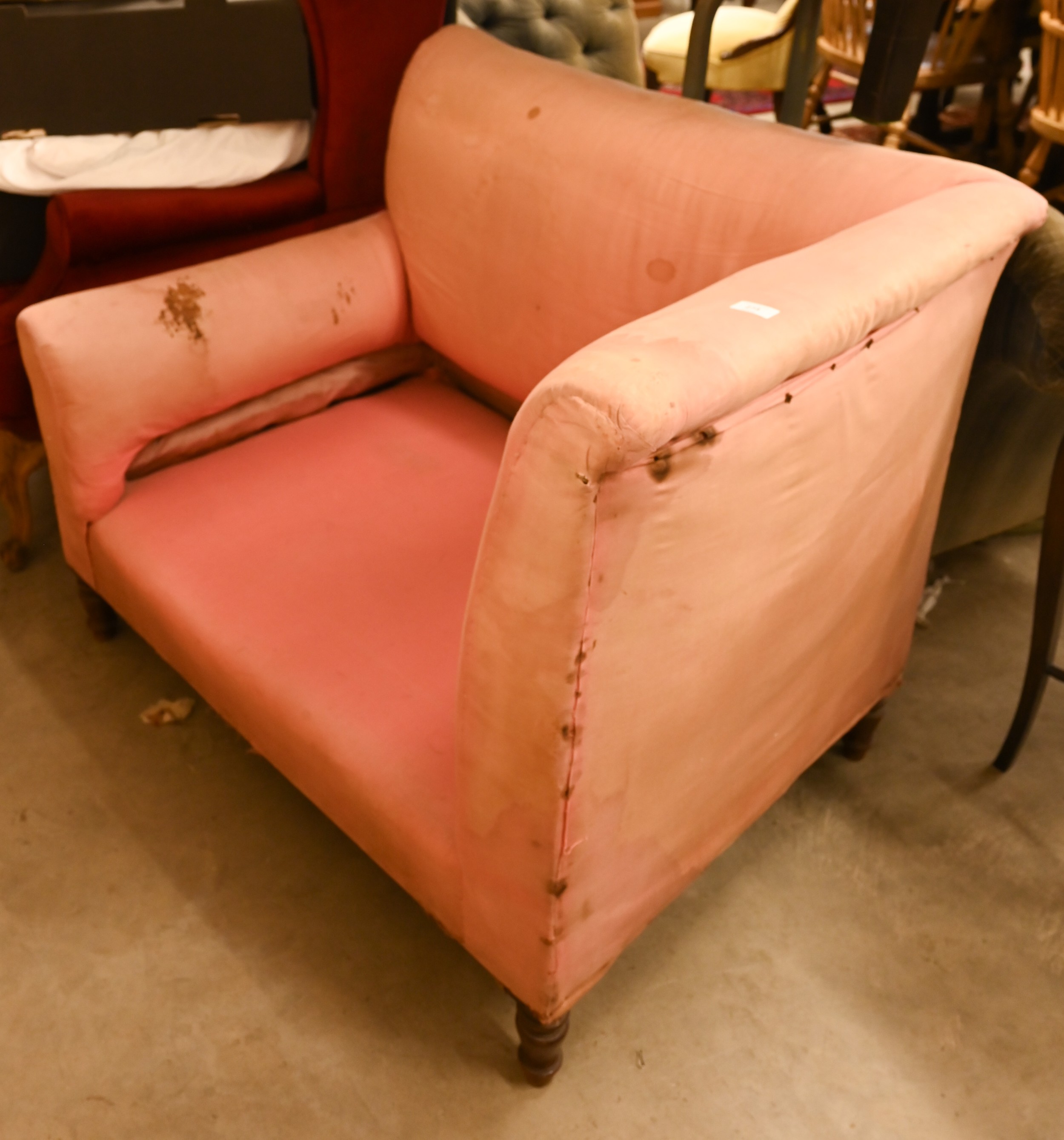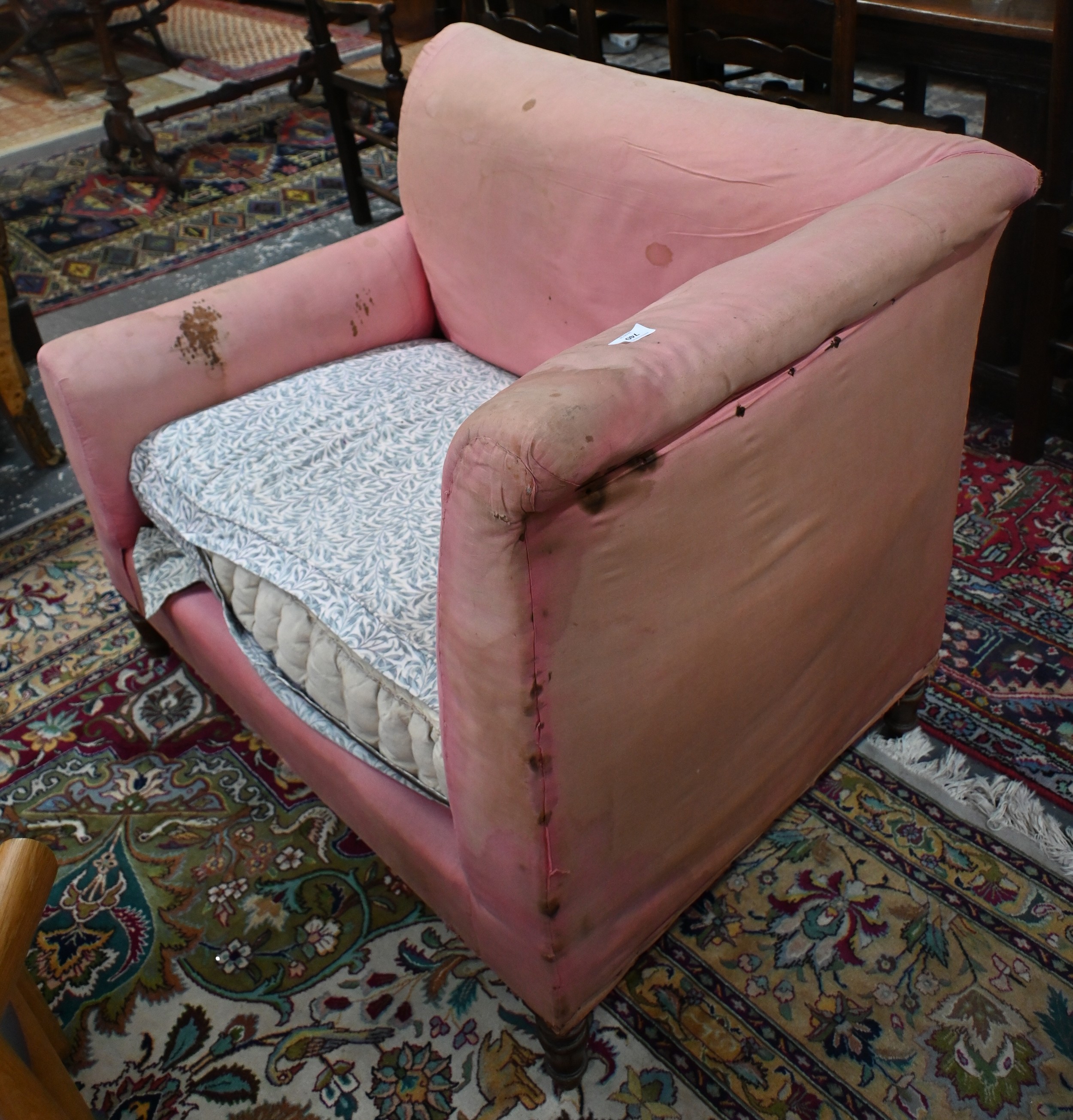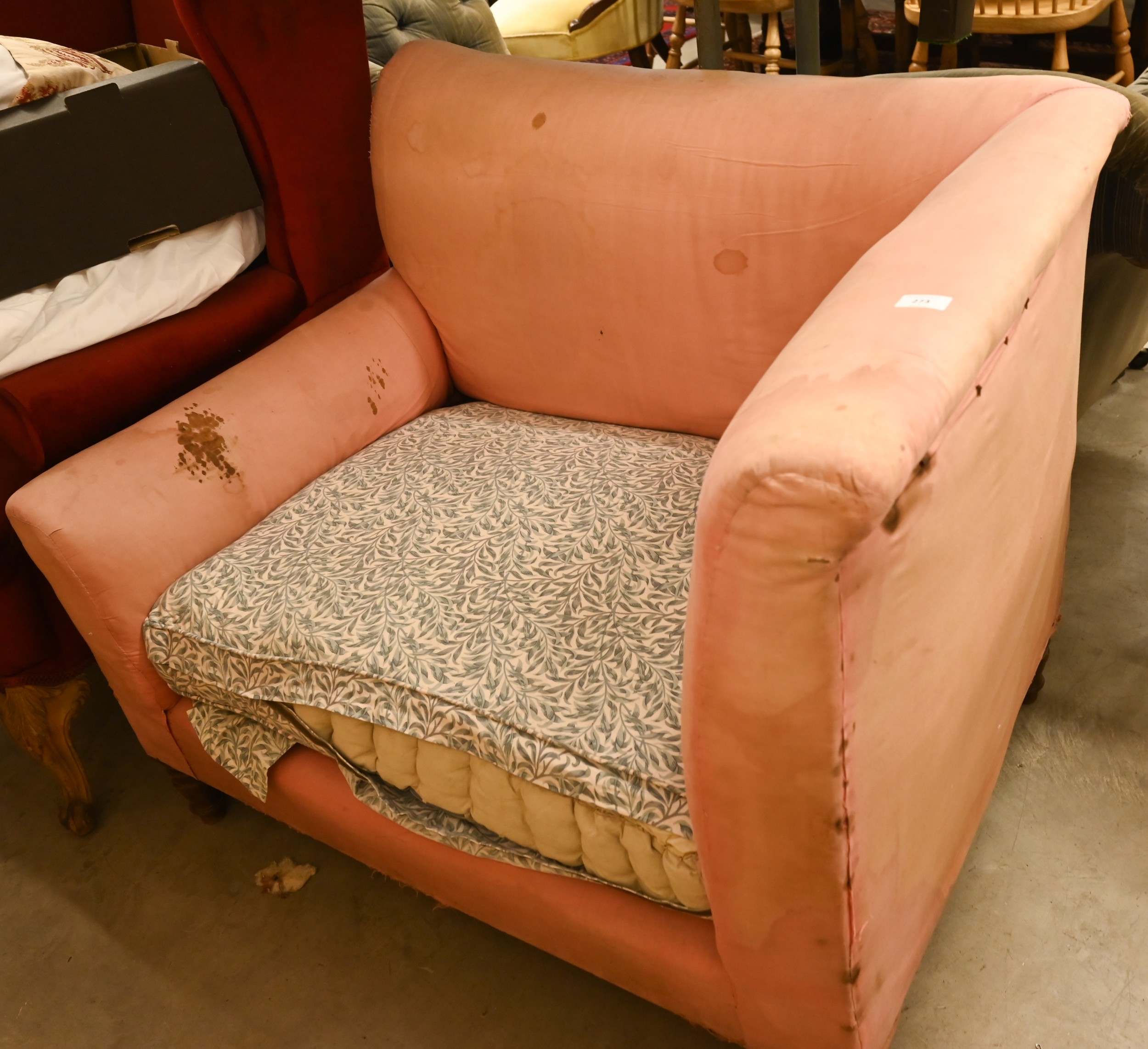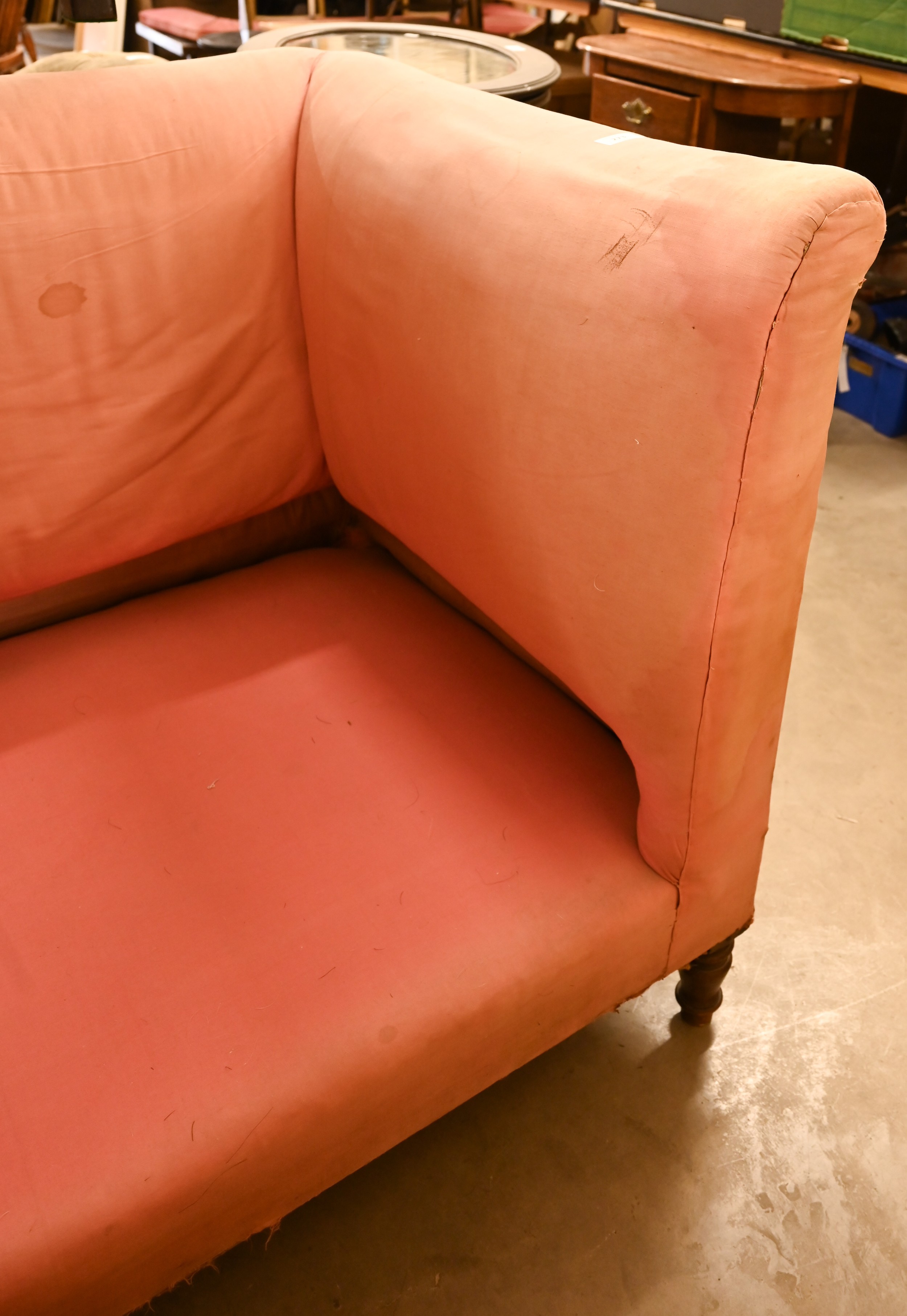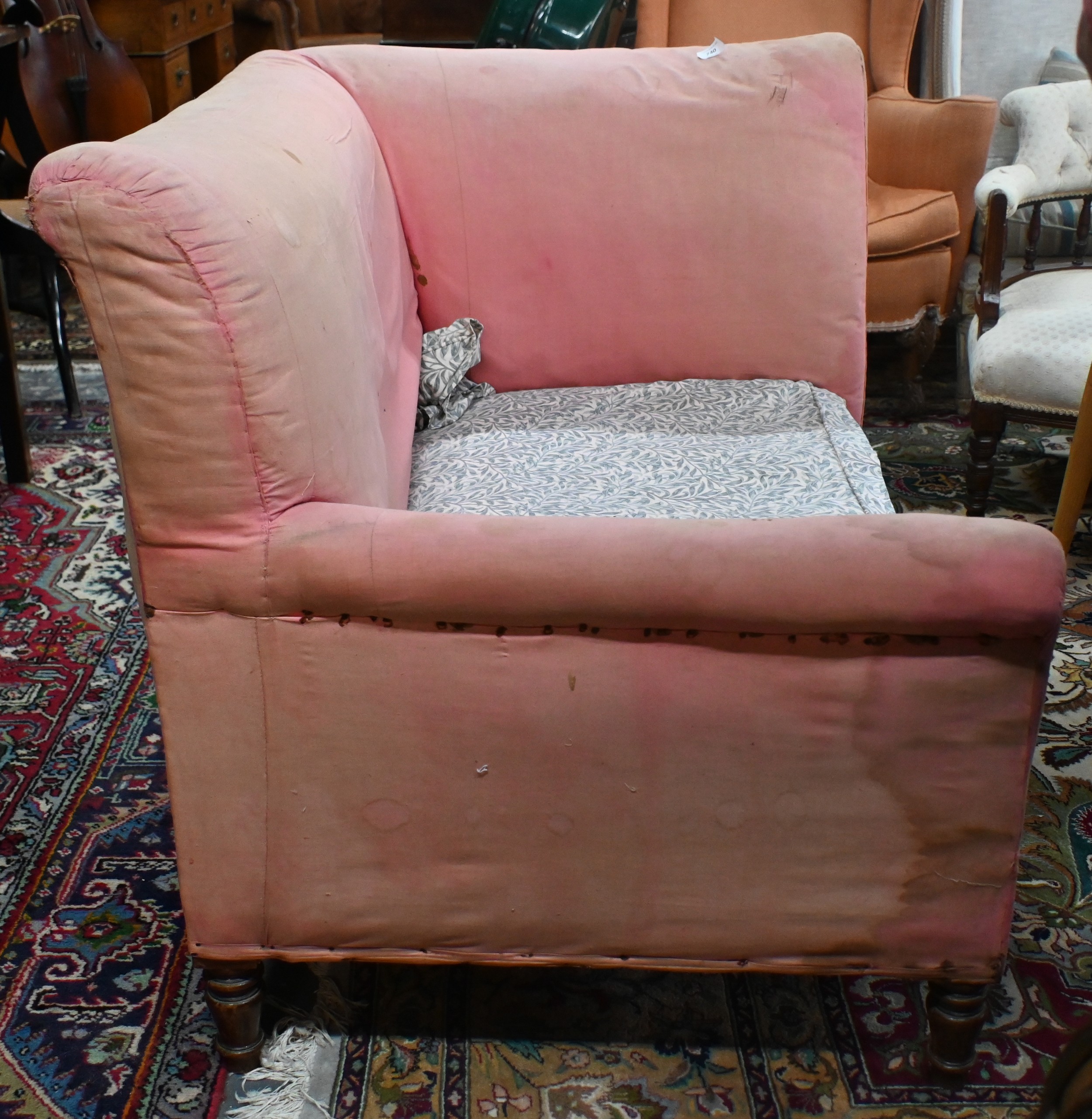 An antique Dutch love-seat / corner armchair with one low arm, on turned supports, 102 cm wide, for re-upholstery, c/w a later fitted Sanderson fabric loose cover