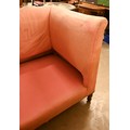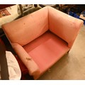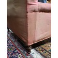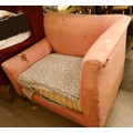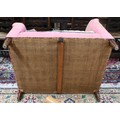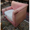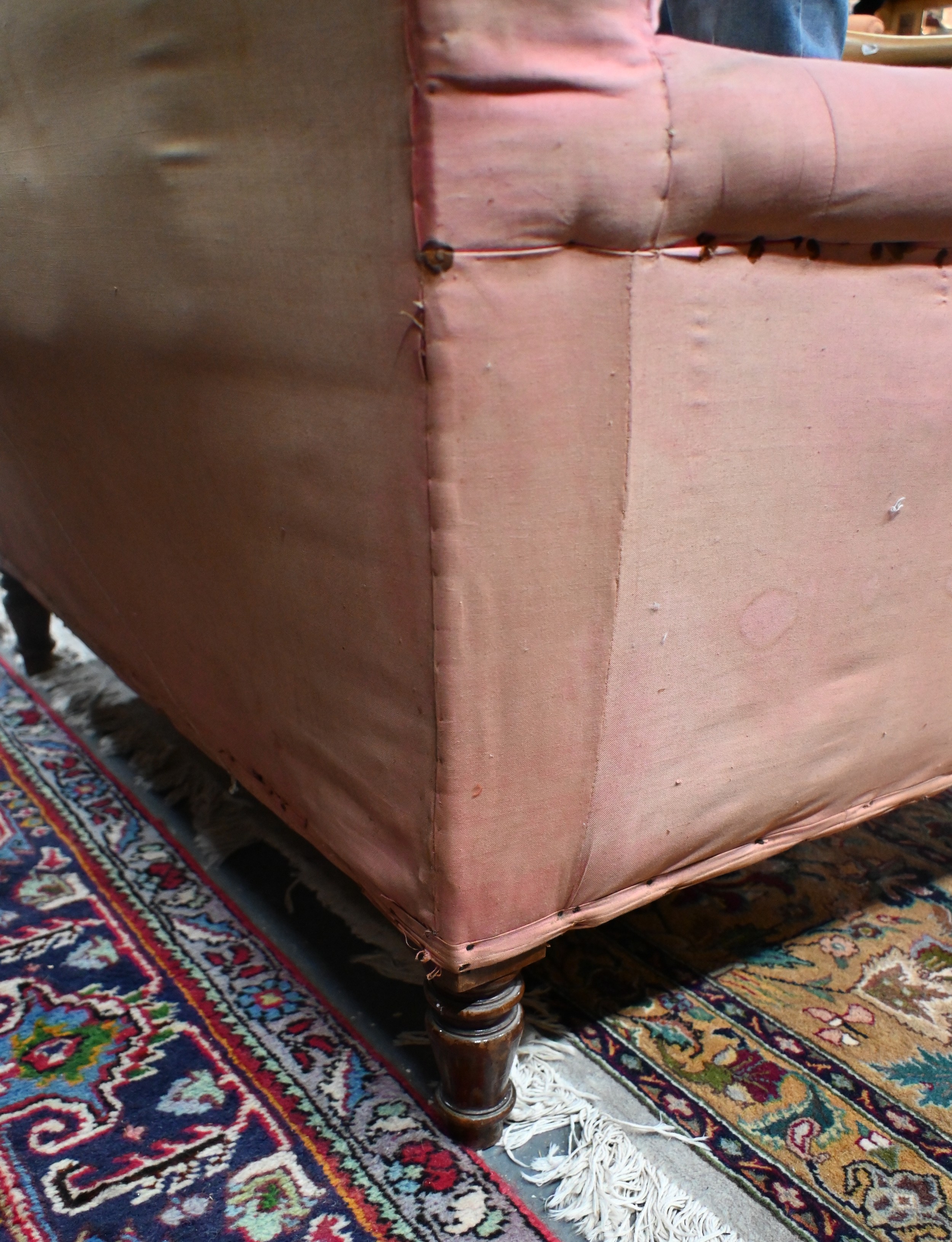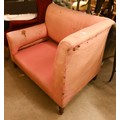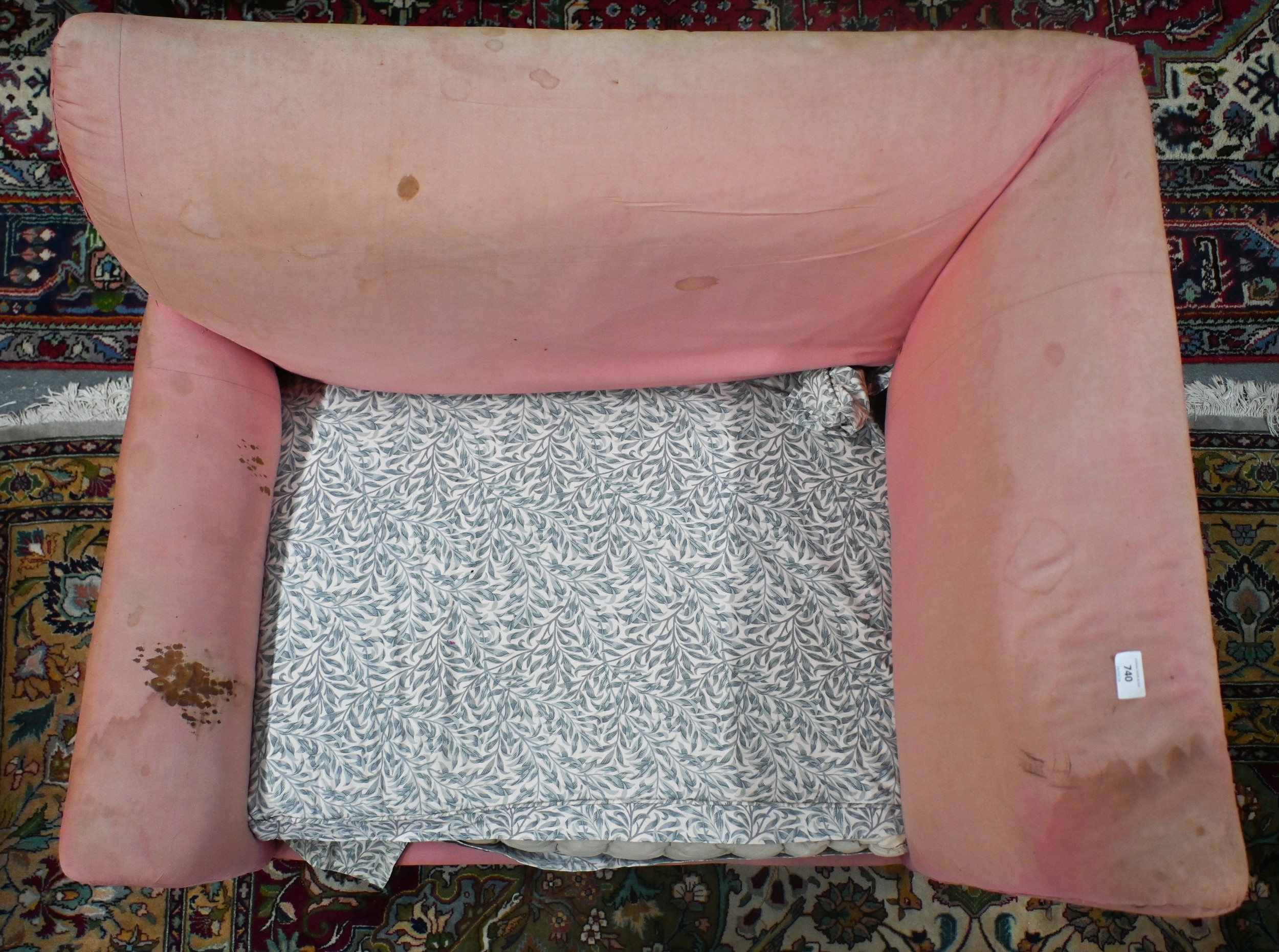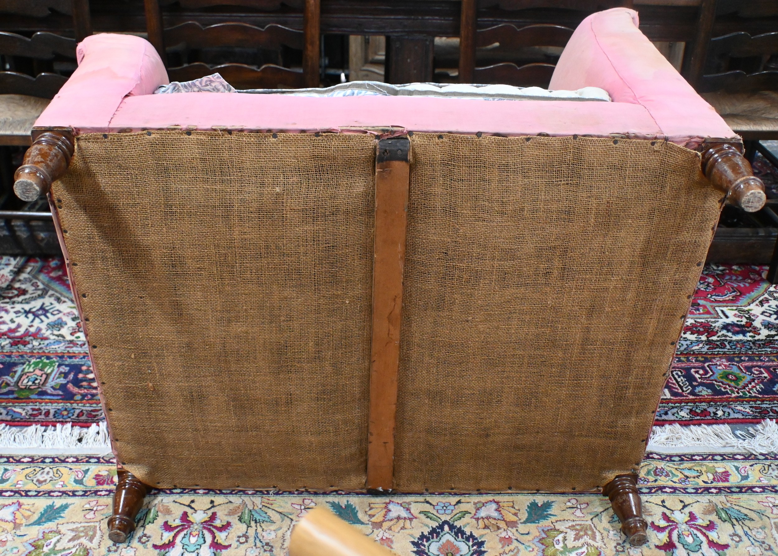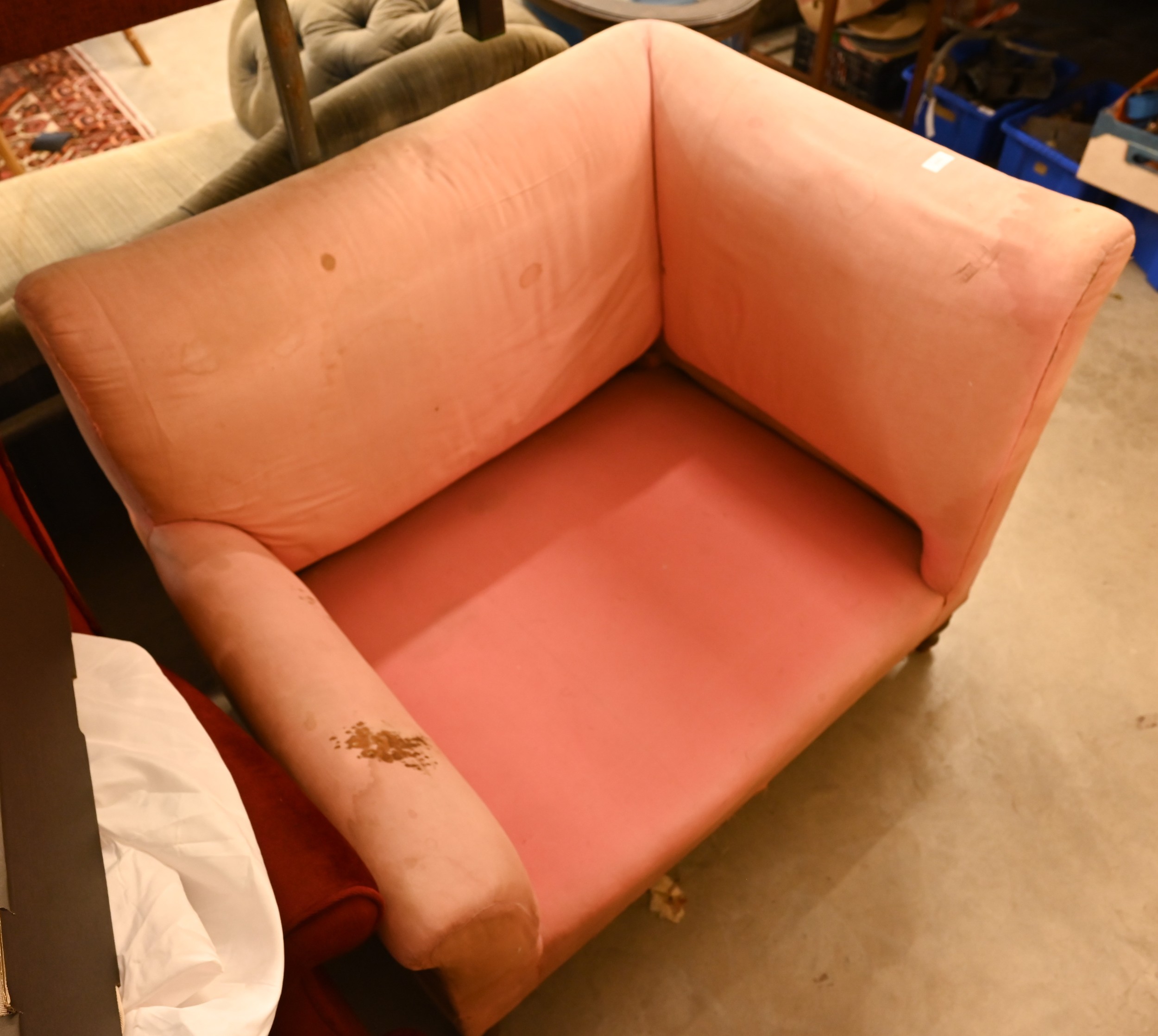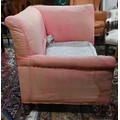 An antique Dutch love-seat / corner armchair with one low arm, on turned supports, 102 cm wide, for re-upholstery, c/w a later fitted Sanderson fabric loose cover