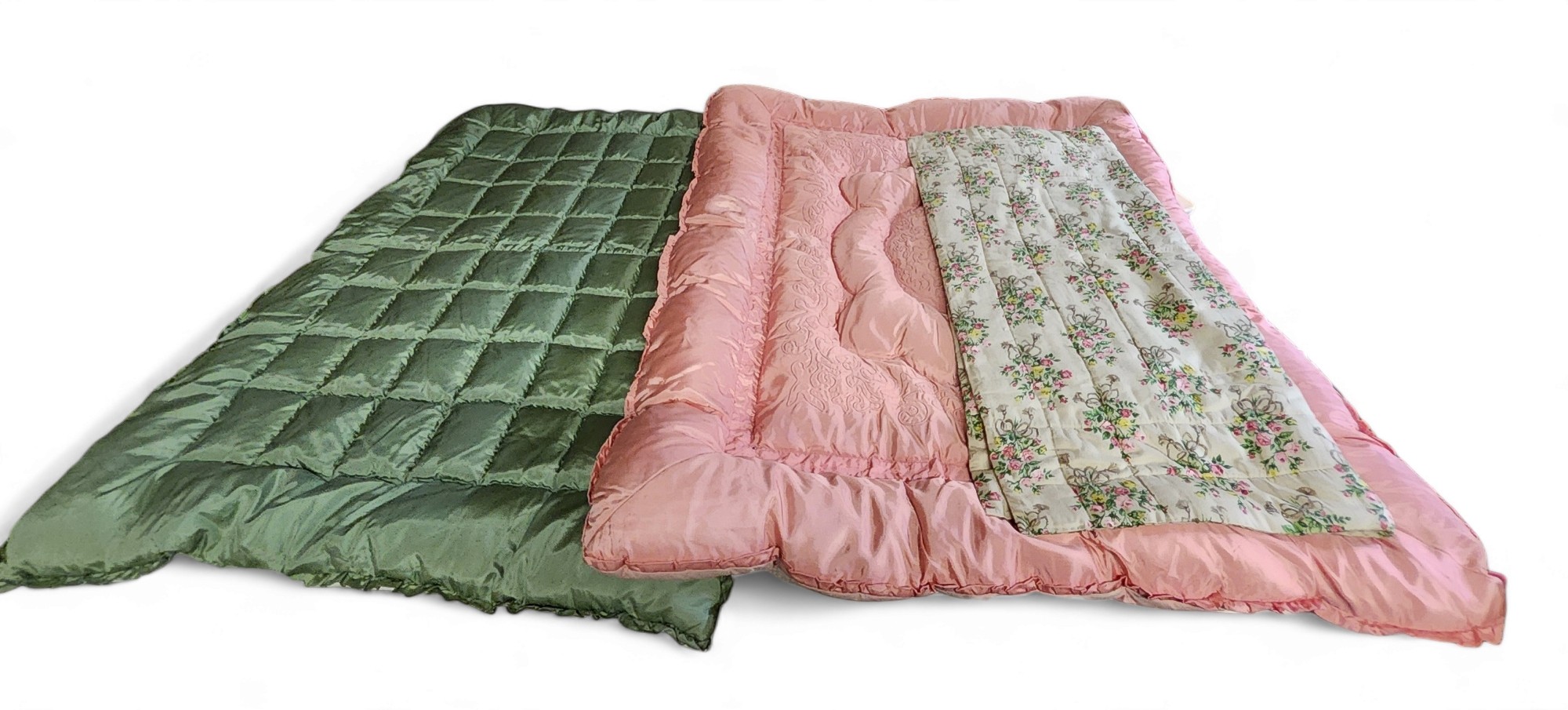 A mid 20th century  The Witney Blanket Company  feather filled eiderdown, in pink satin, 125cm x 160cm;  another, green, 100cm x 150cm;   etc