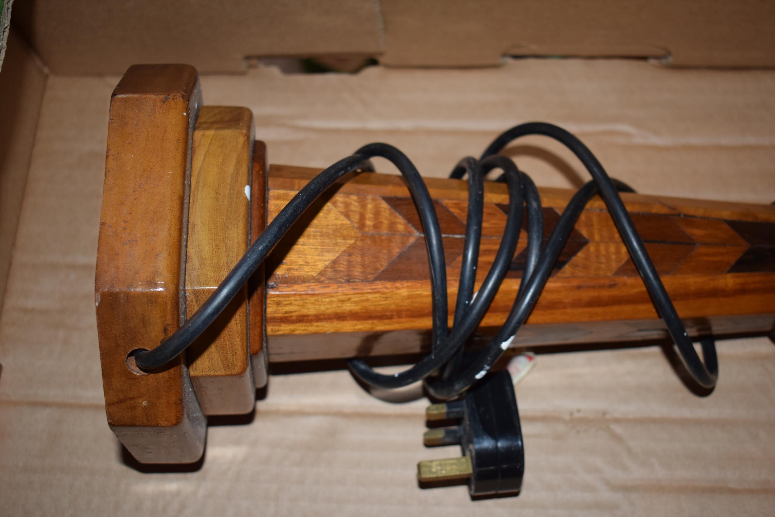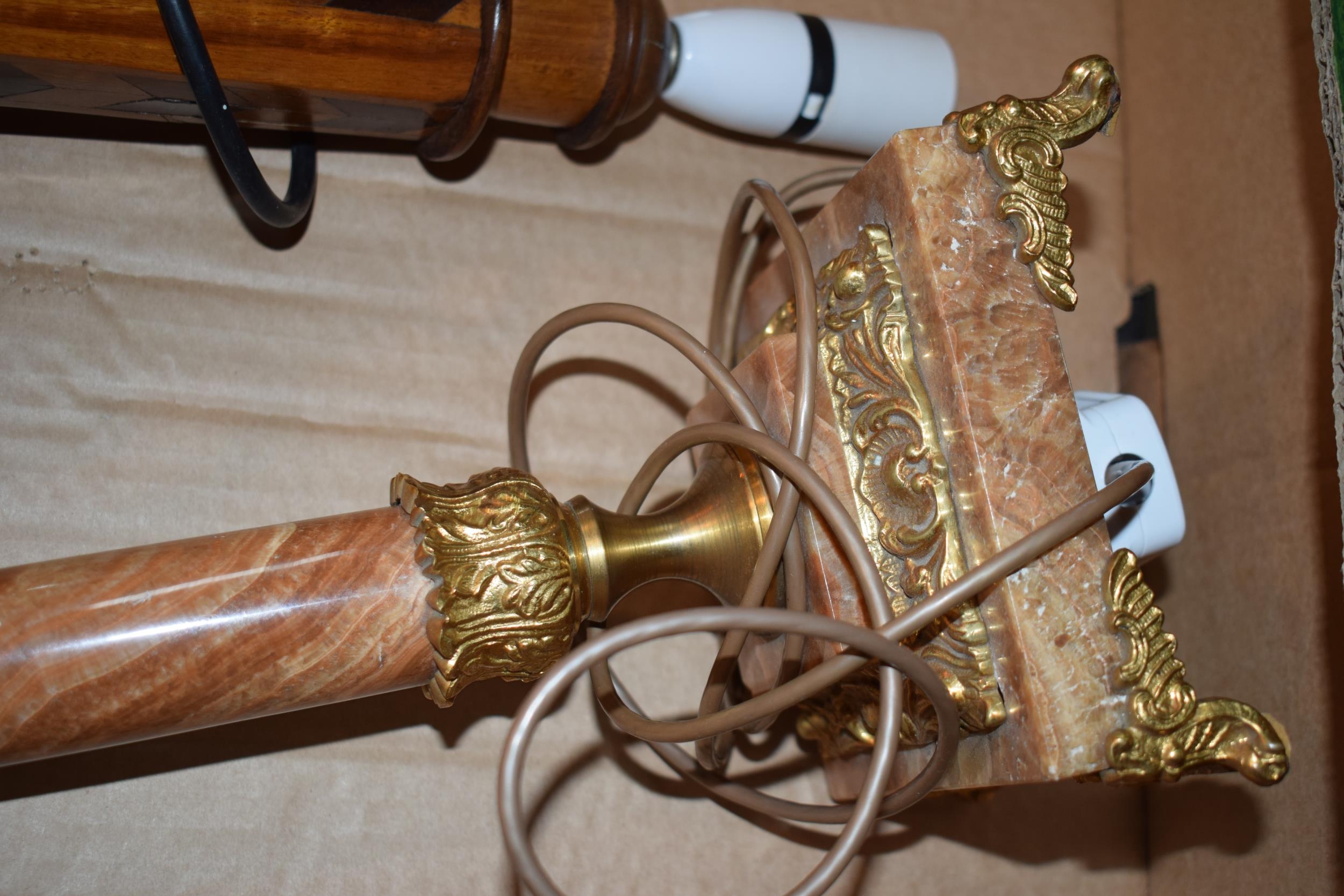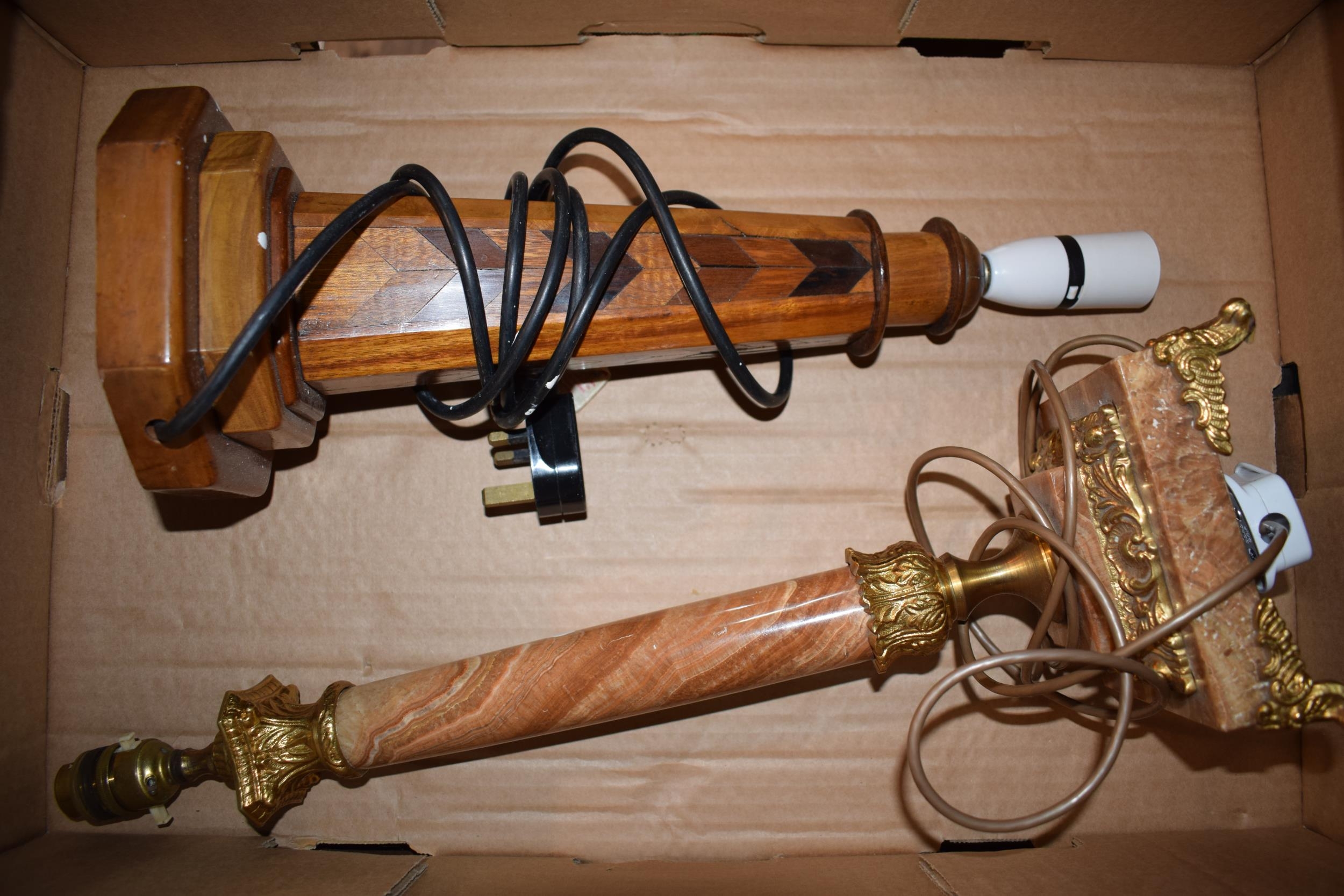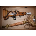 Two vintage lamp bases to include a wooden example, and a marble and brass based example. Height 34cm. (2)