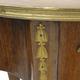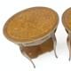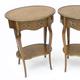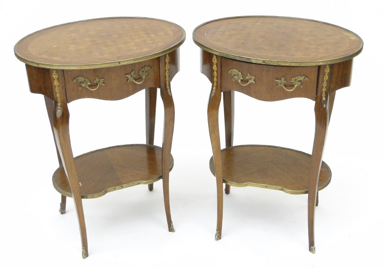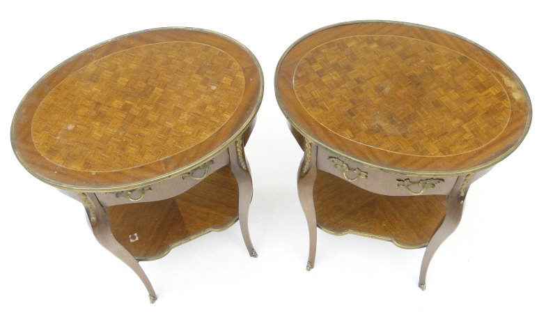 Pair of French mahogany bedside tables, each with brass banded oval top and chequered inlay above a frieze drawer with ormolu handles, the ormolu mounted cabriole legs united by a kidney shaped undertier, 75cm high x 54cm wide x 39cm deep