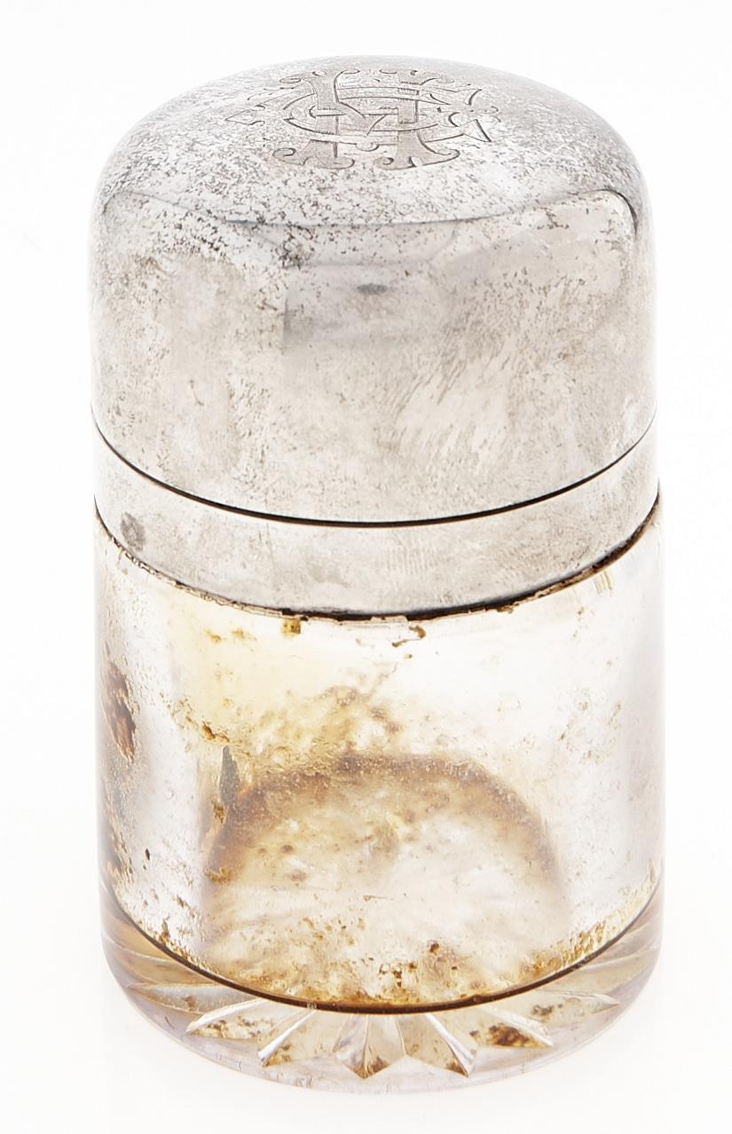 A Victorian silver mounted cylindrical glass salts bottle and stopper, 10cm h, by S W Smith & Co, London 1869