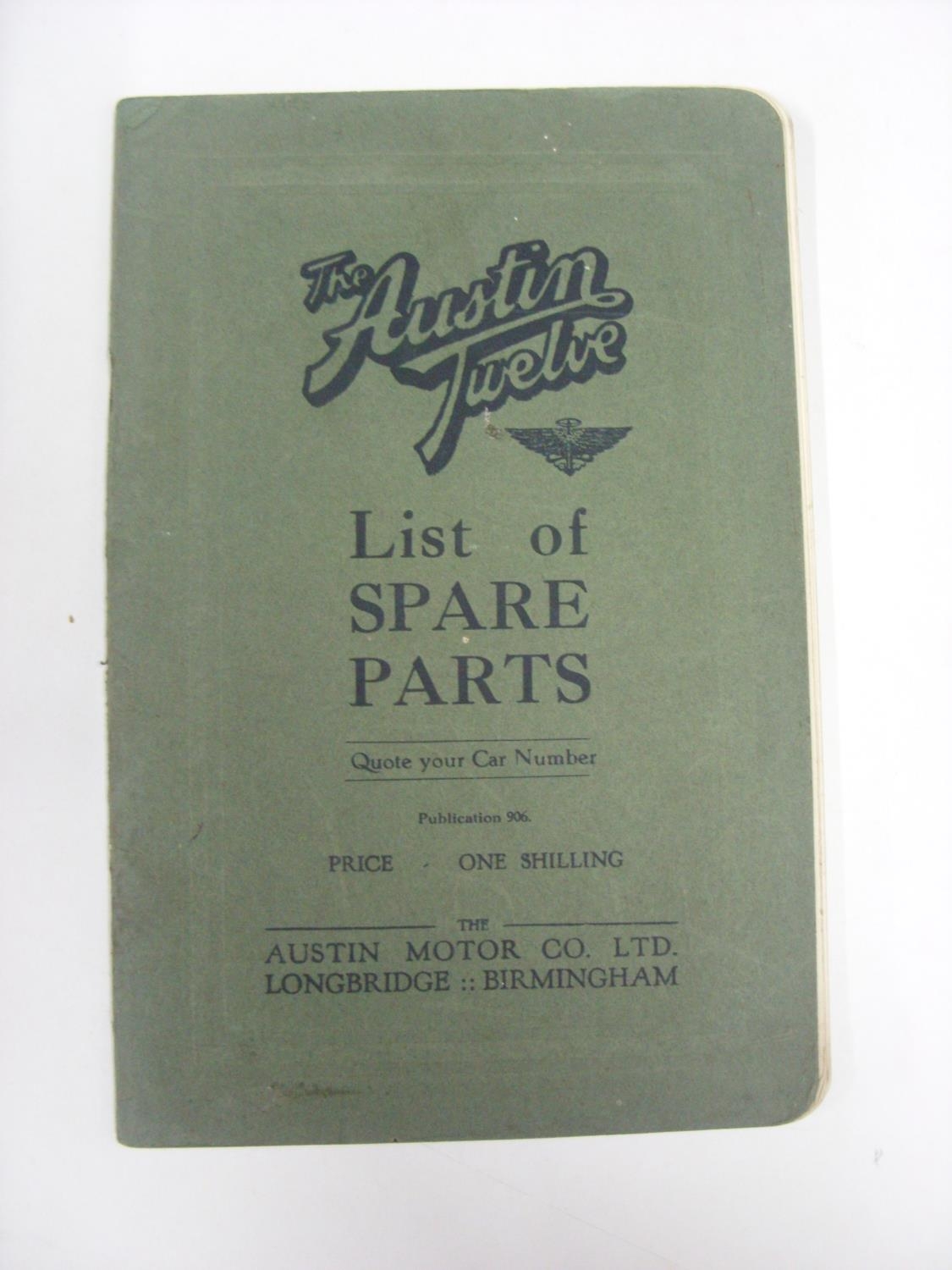 AUTOMOTIVE MEMORABILIA, circa 1930's, The Austin Twelve, List of Spare Parts Booklet/Brochure, Produced by the Austin Motor Co. Ltd Longbridge, Birmingham, 77 pages (rusty staples). Estimate: £10/£12 - Opening Bid: £8