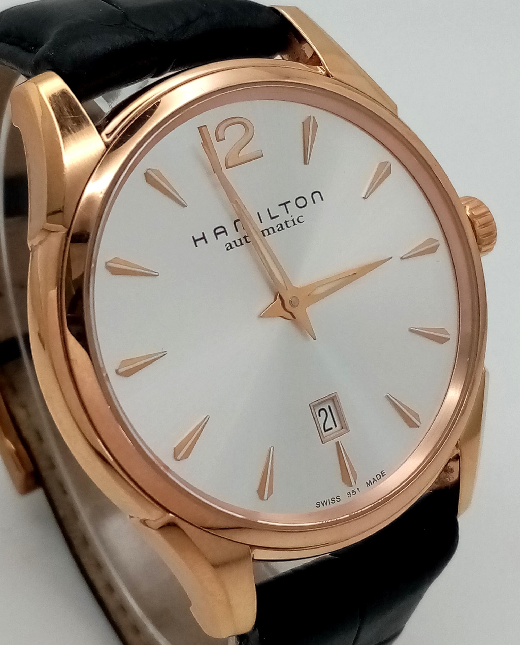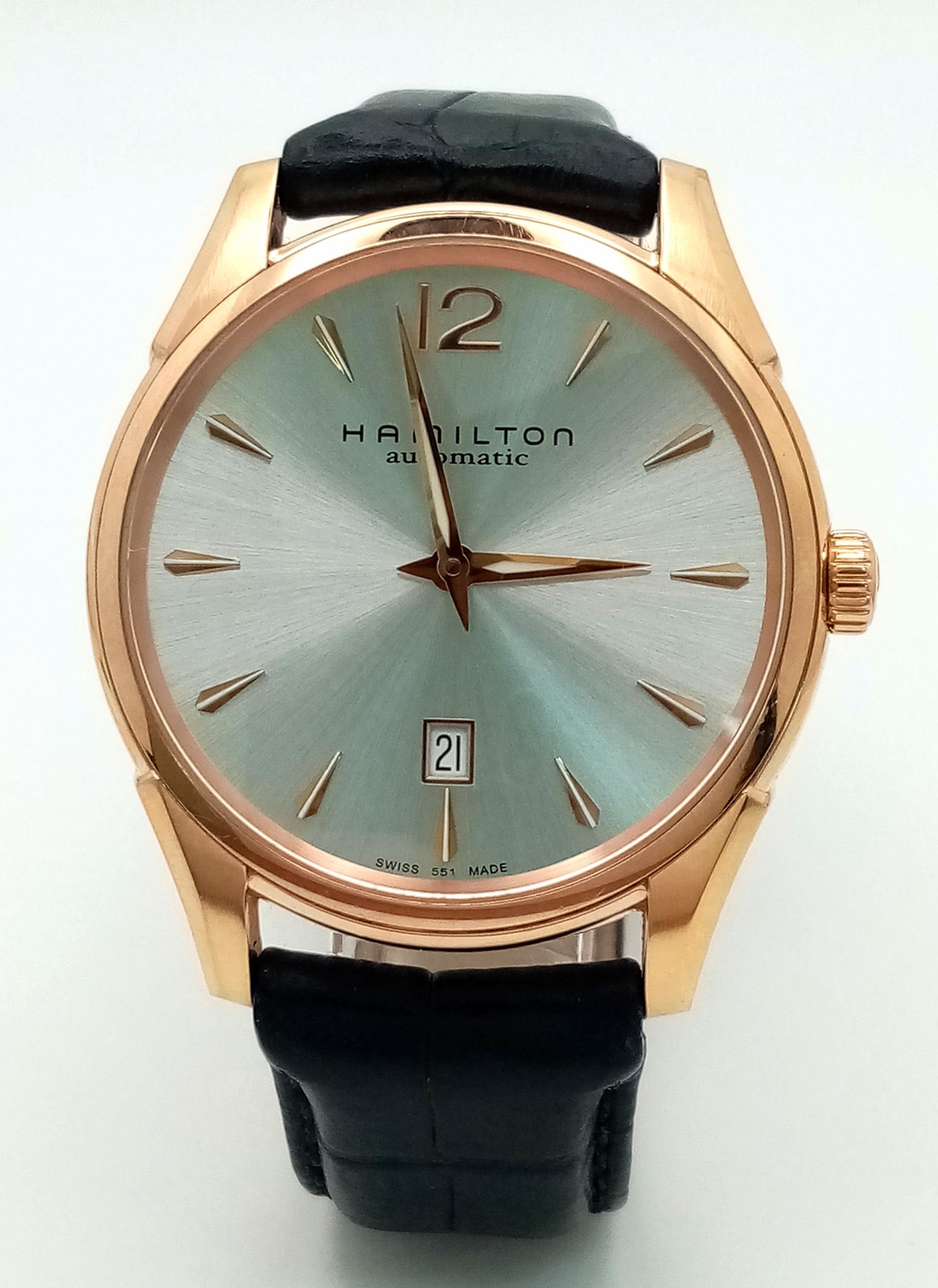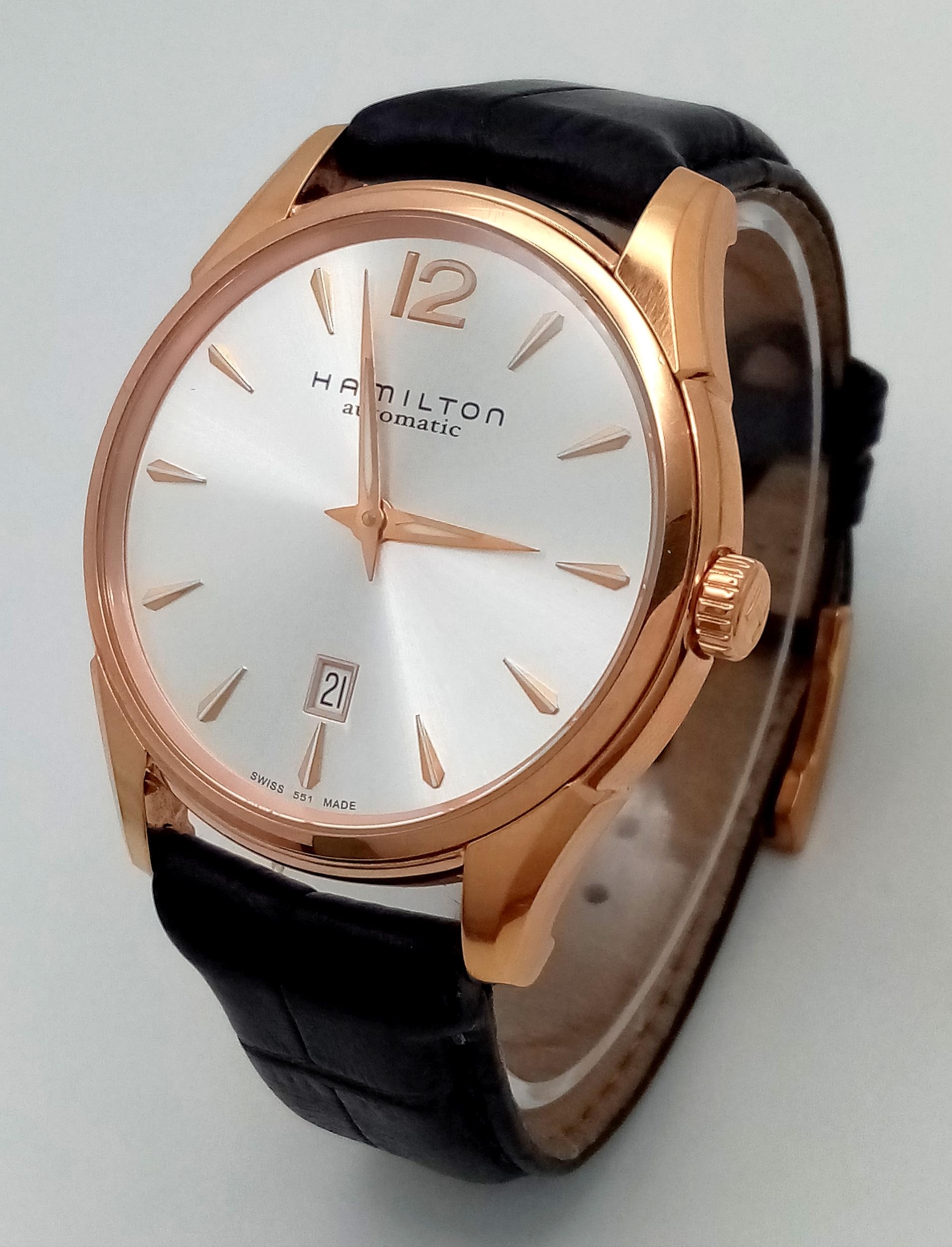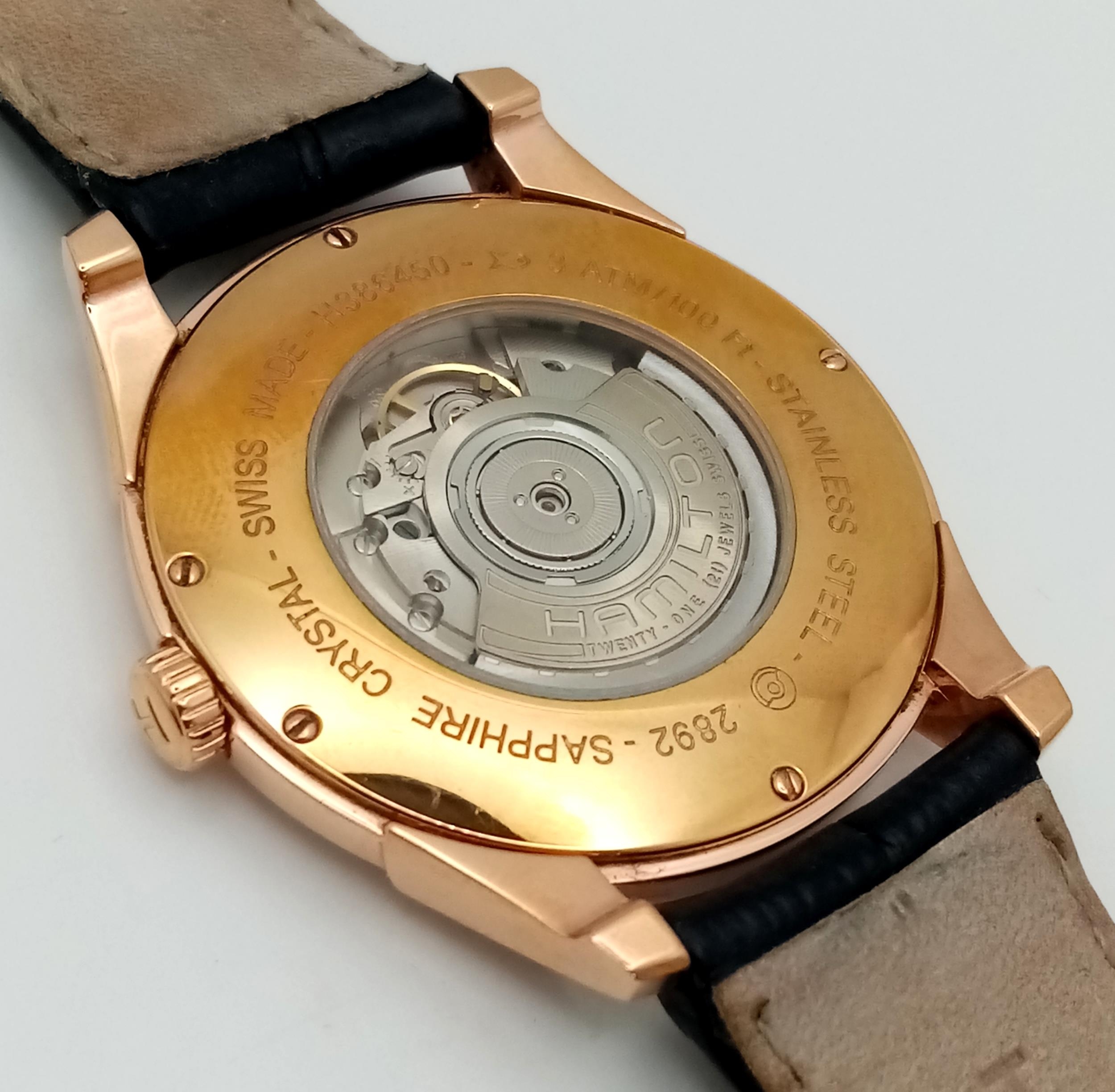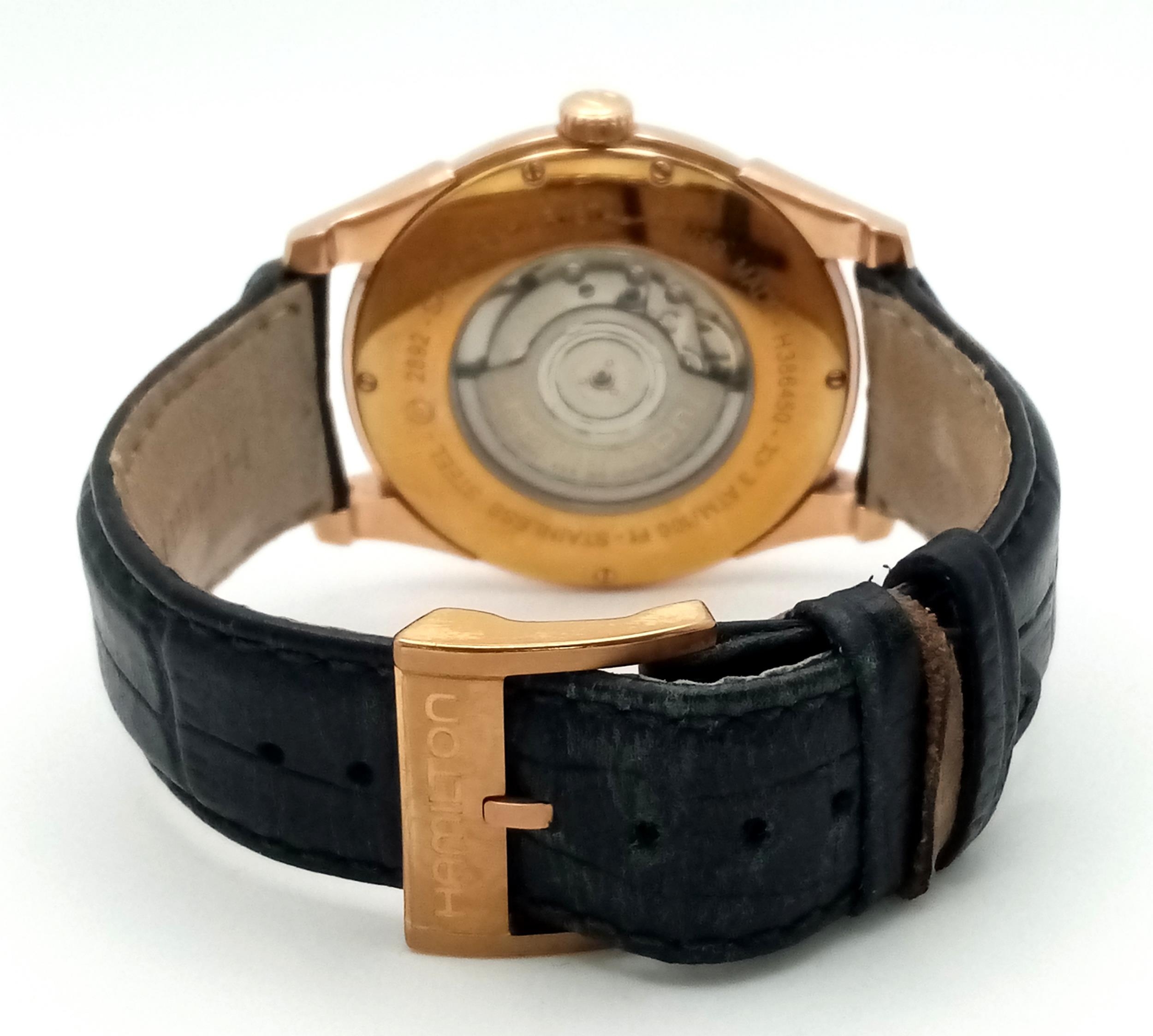 A Men’s Hamilton Gold Tone Automatic, Skeleton Back, Date Watch. Model H386450-42mm Case. Working Order. Very Good Condition.